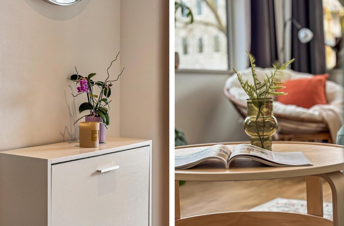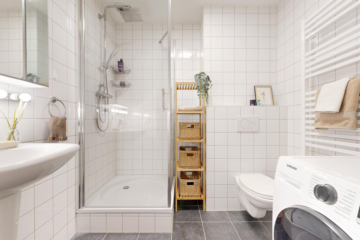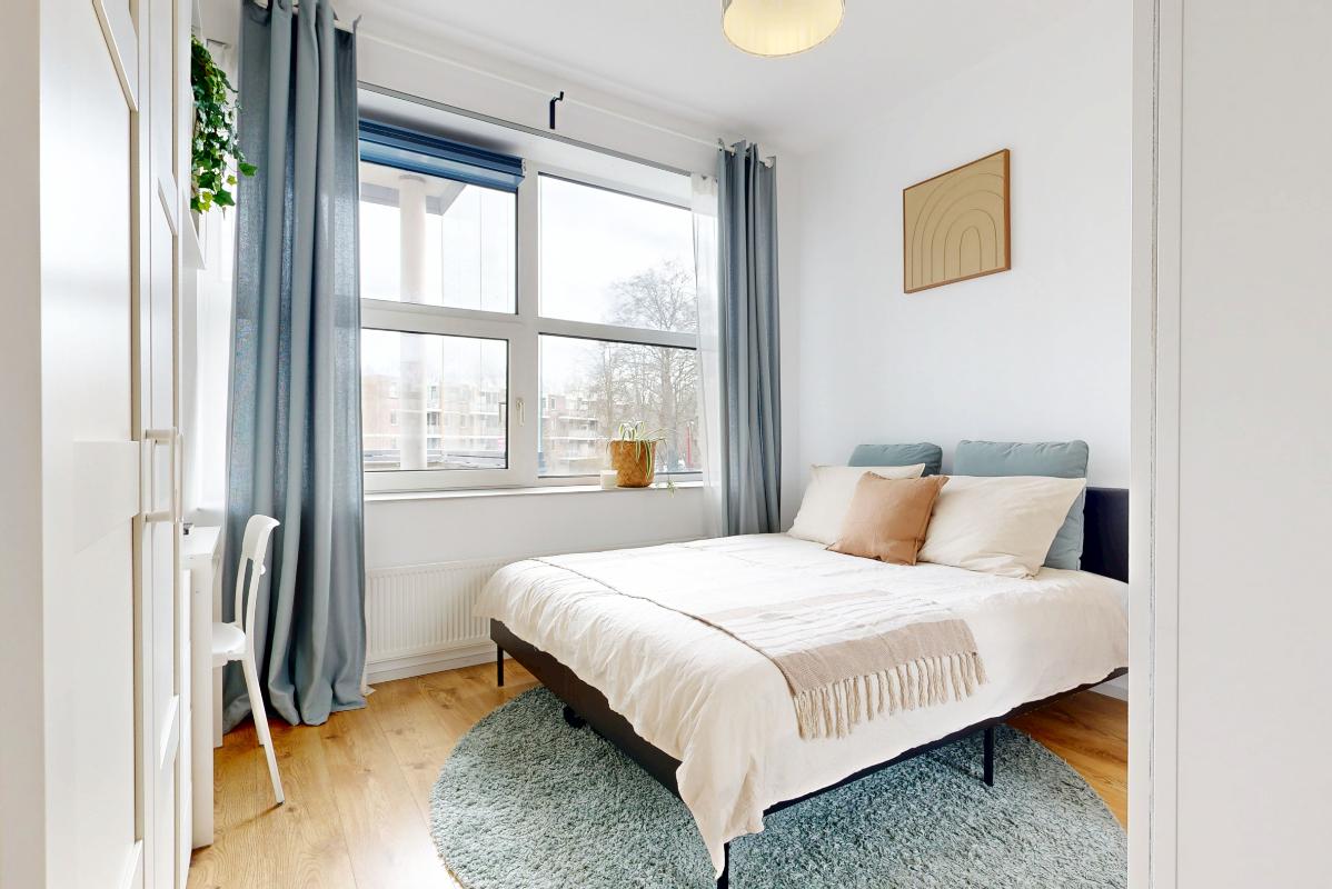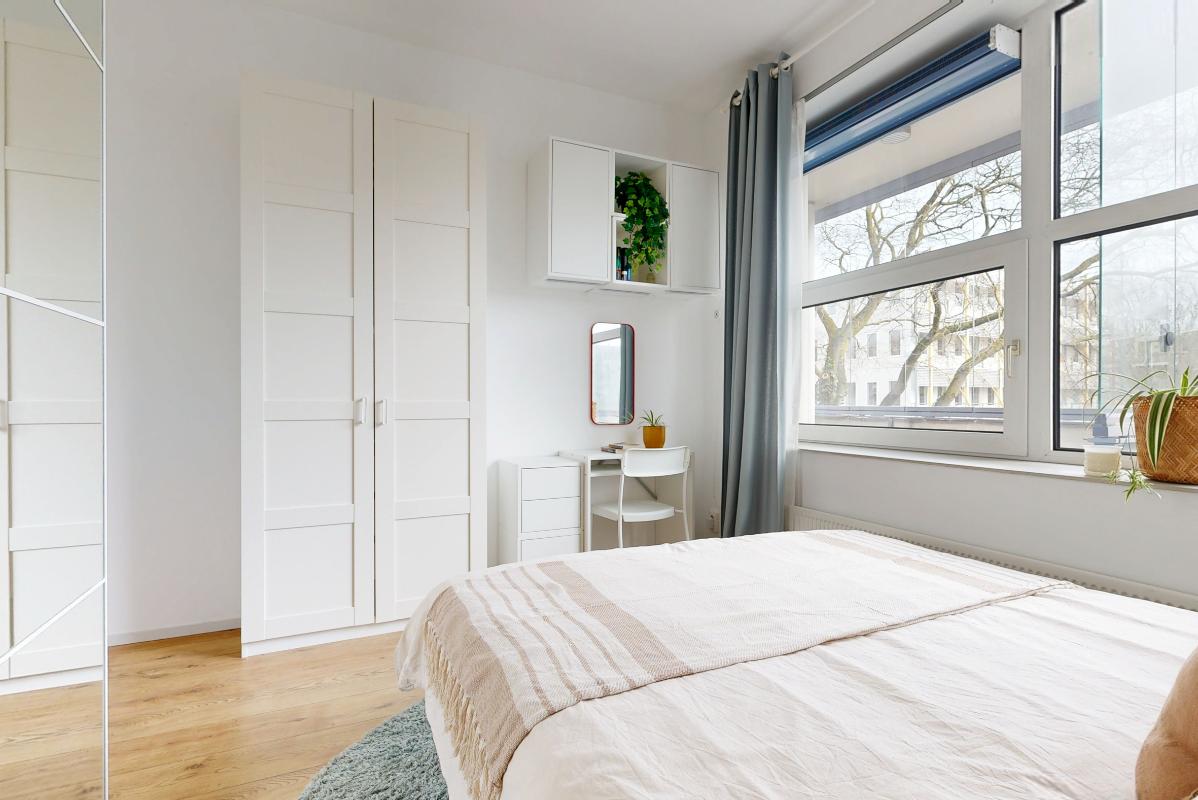 De lichte slaapkamer, eveneens vanuit de hal bereikbaar, biedt voldoende ruimte voor een tweepersoonsbed, een kledingkast en extra bergruimte. De naastgelegen badkamer is praktisch en compleet ingericht met wastafel, douche, designradiator, toilet en aansluiting voor de wasmachine; een fijne, functionele ruimte waar alles bij de hand is.