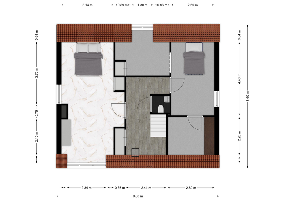 Verdieping De eerste verdieping bestaat uit een overloop, een tweede separaat toilet en drie slaapkamers. Met een kleine aanpassing kan hier eenvoudig een vierde kamer worden gerealiseerd.