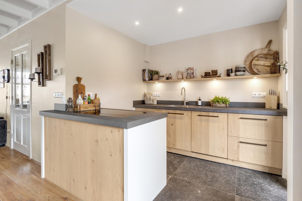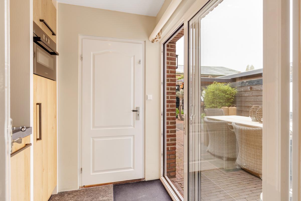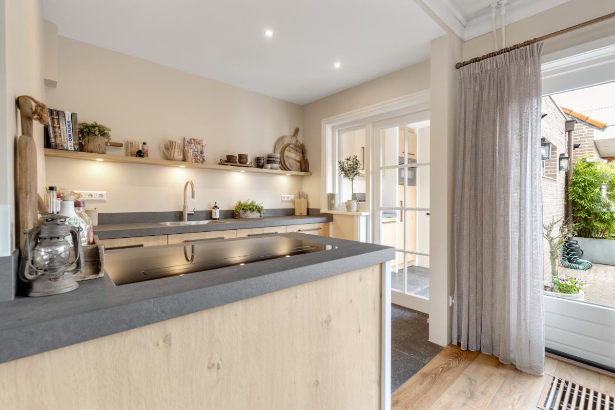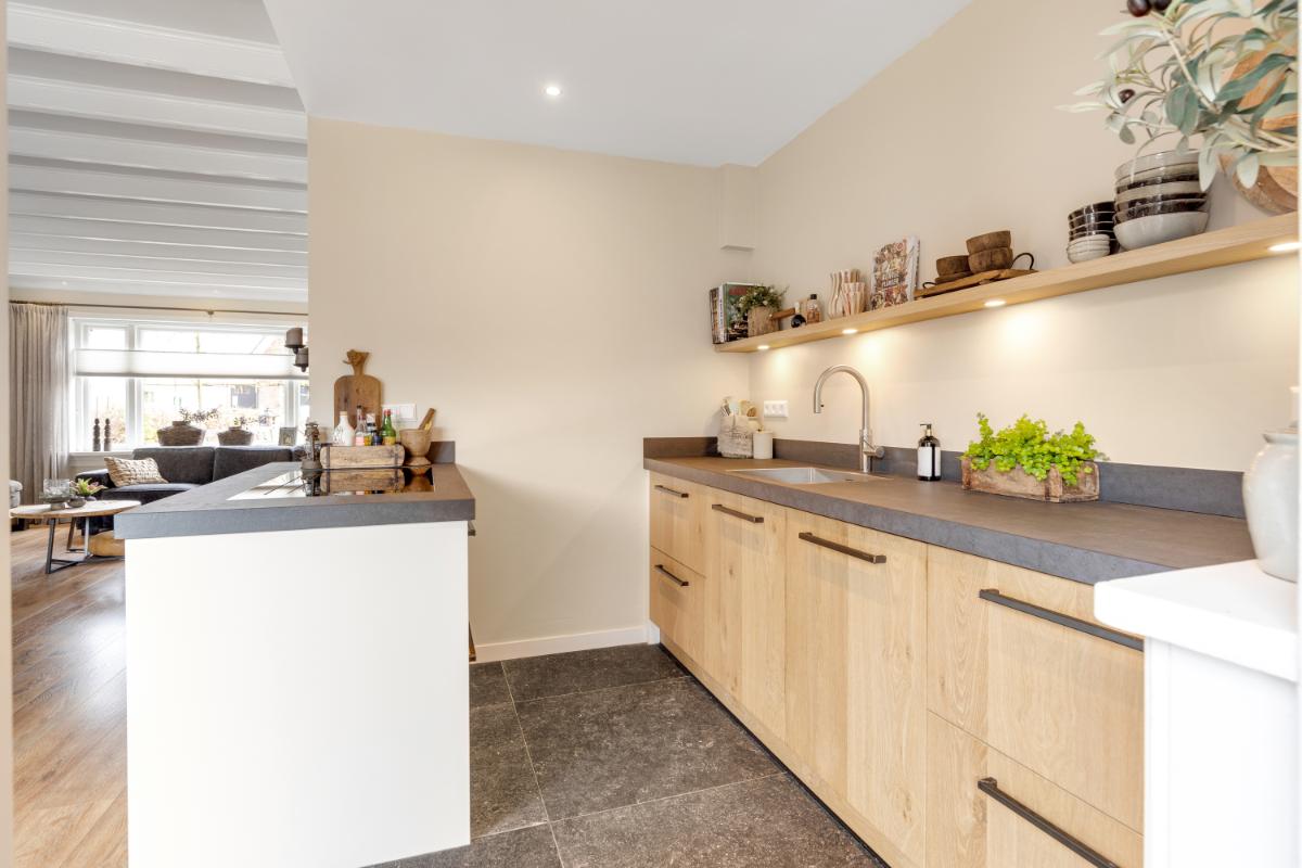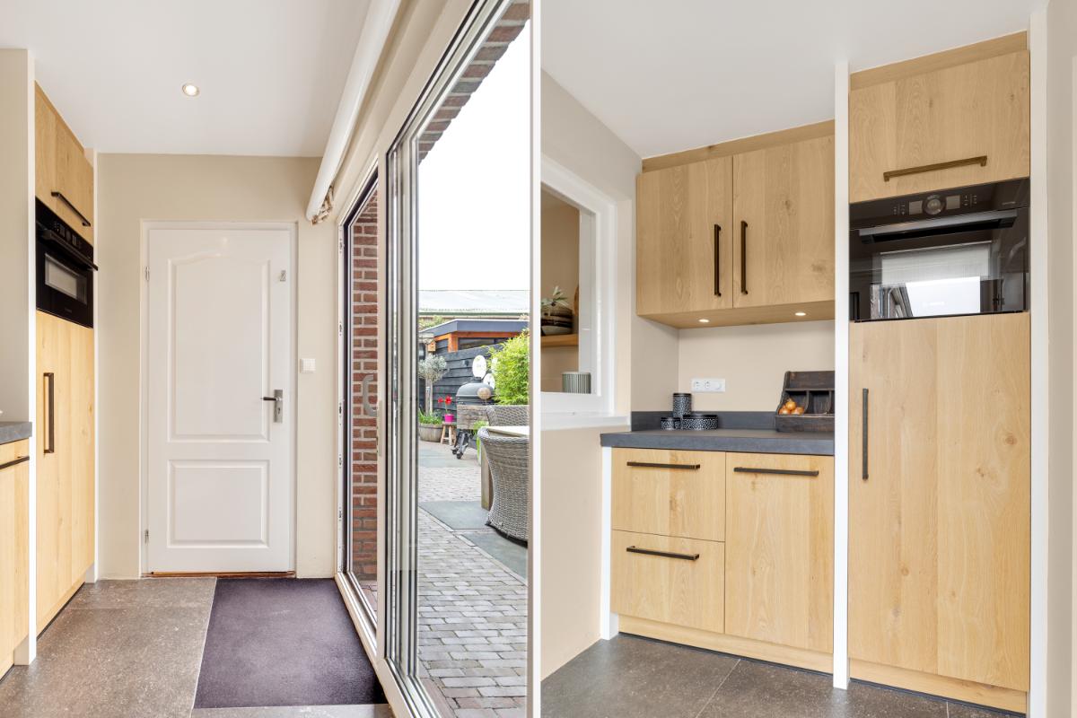 Aan de achterzijde bevindt zich de moderne keuken (2022), uitgevoerd in een eigentijdse stijl en voorzien van diverse inbouwapparatuur zoals een Quooker, inductiekookplaat, vaatwasser, combi-oven en koelkast. De keuken loopt door in de bijkeuken waar een schuifpui naar de tuin gesitueerd is. Vanuit de bijkeuken bereik je de inpandige berging met witgoedaansluiting en de cv-opstelling.