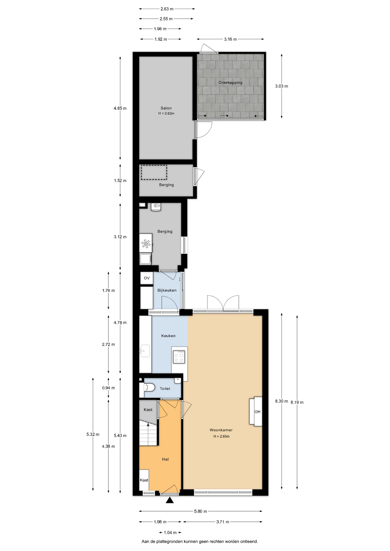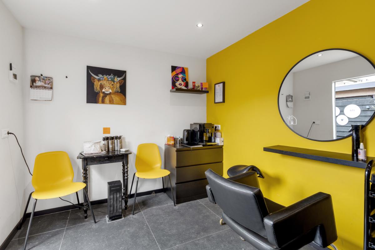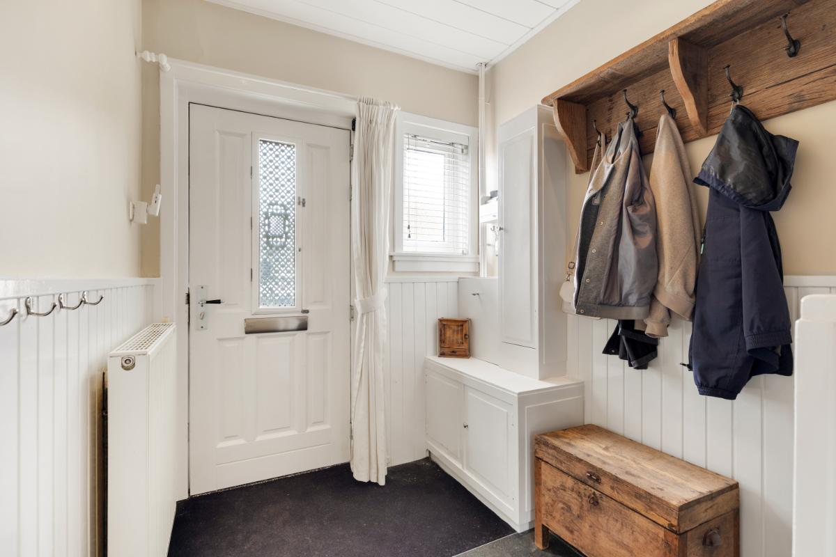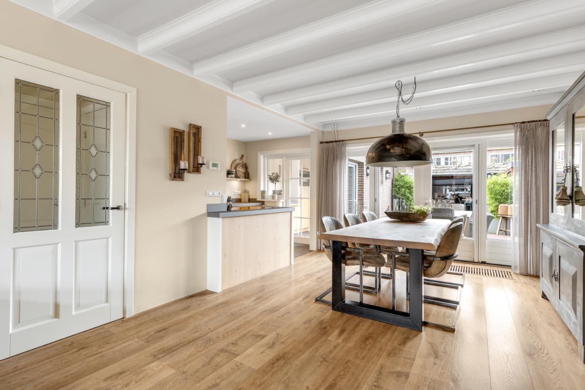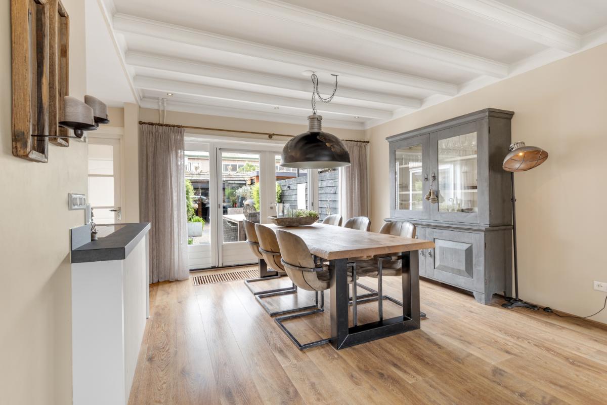 Aan de achterzijde bevindt zich de moderne keuken (2022), uitgevoerd in een eigentijdse stijl en voorzien van diverse inbouwapparatuur zoals een Quooker, inductiekookplaat, vaatwasser, combi-oven en koelkast. De keuken loopt door in de bijkeuken waar een schuifpui naar de tuin gesitueerd is. Vanuit de bijkeuken bereik je de inpandige berging met witgoedaansluiting en de cv-opstelling.
