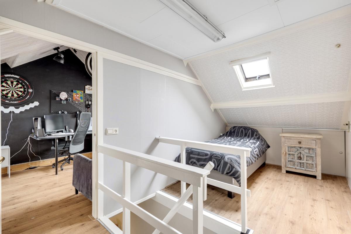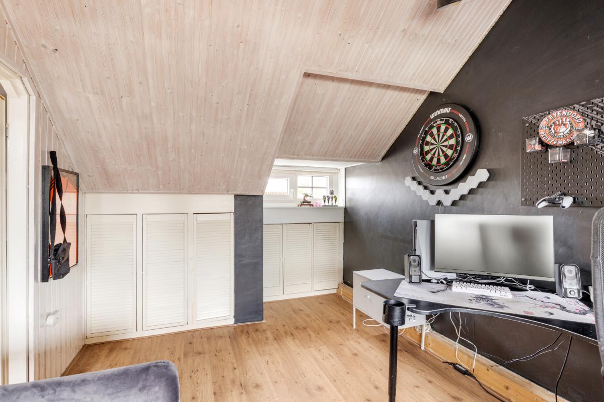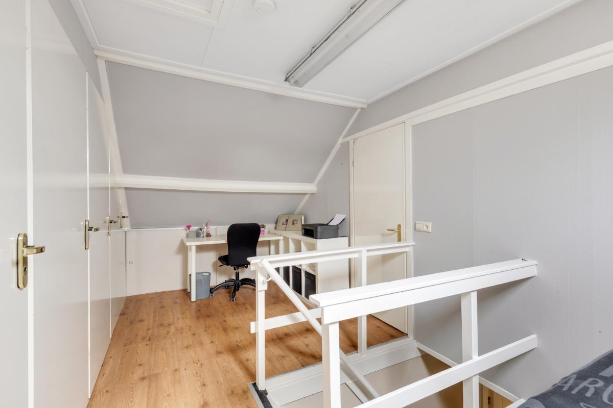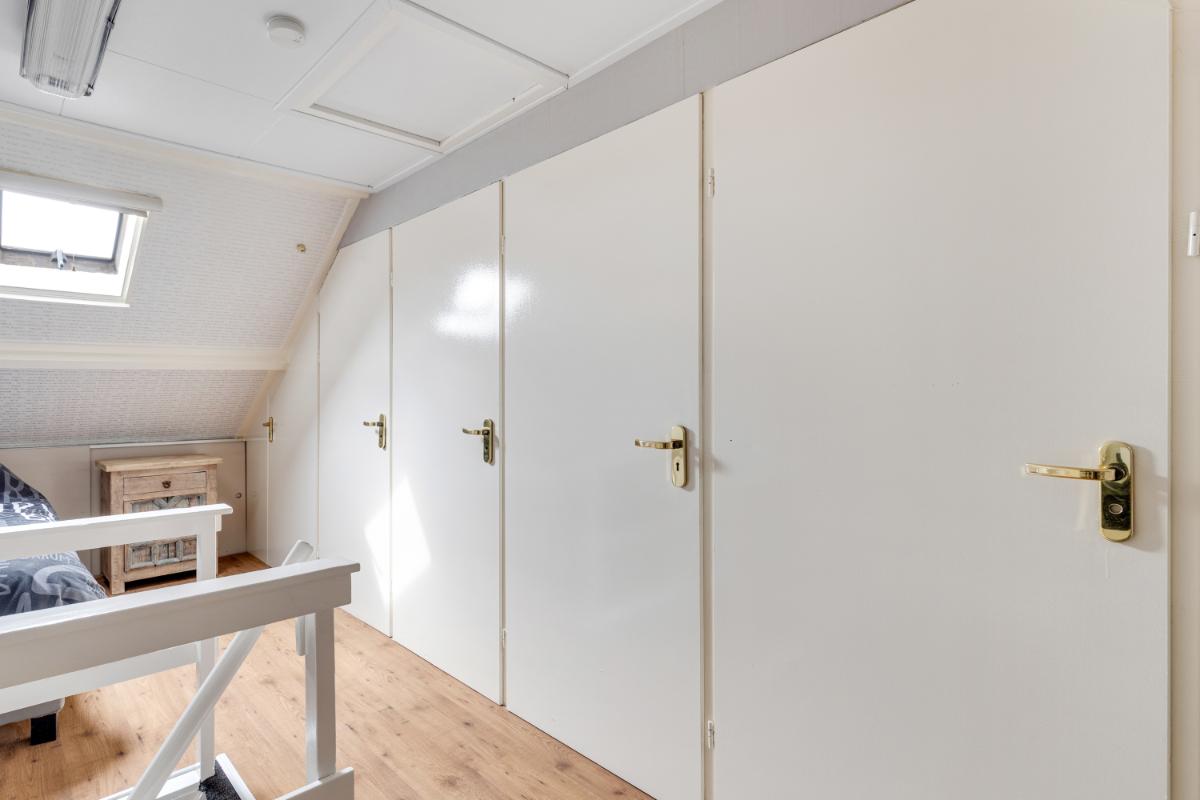 Tweede verdieping: via een vaste trap bereik je de tweede verdieping. Op de voorzolder vind je een kastenwand en een luik naar de vliering. De ruime zolderkamer is een volwaardige slaapkamer met een nokhoogte van circa 2,90 meter. Dankzij de dakkapellen aan beide zijden is er veel licht en ruimte ontstaan. Achter de knieschotten is praktische bergruimte aanwezig.