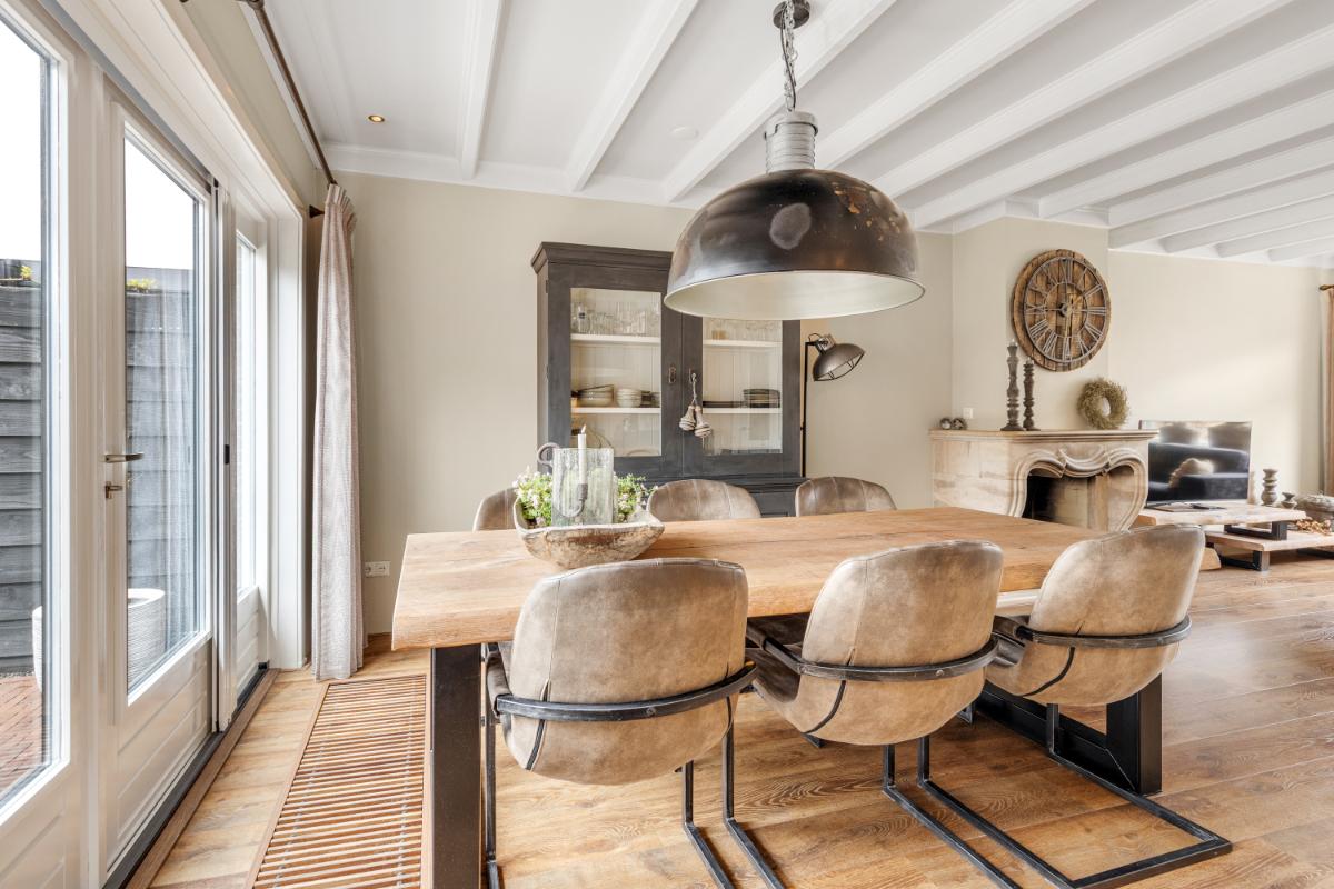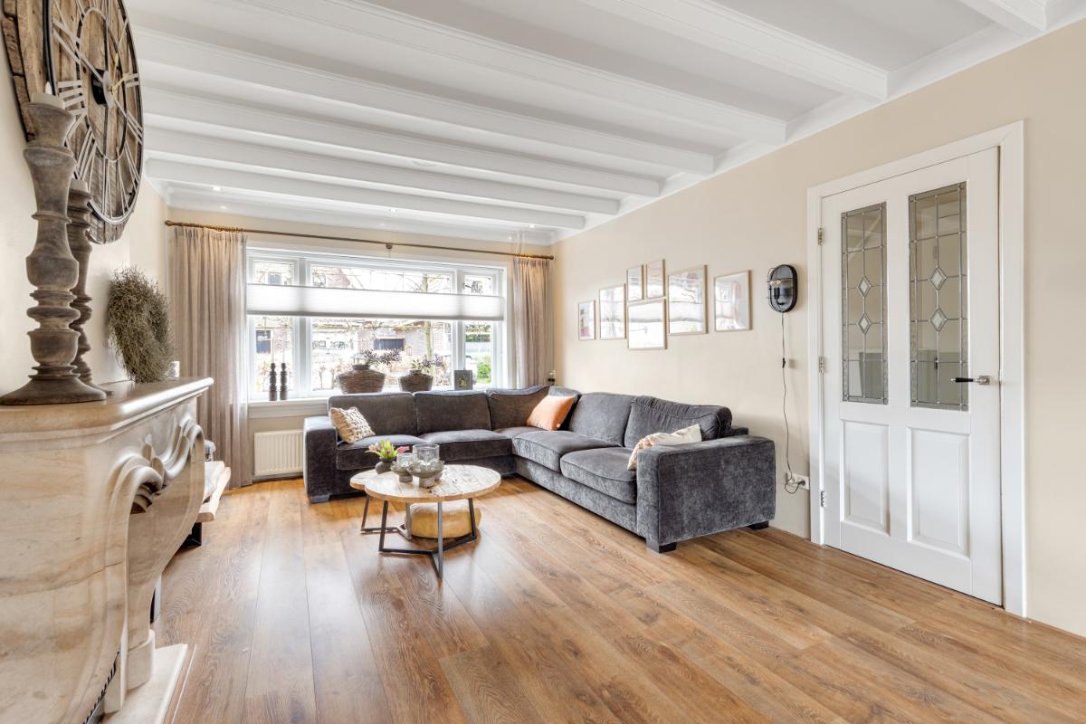 INDELING Begane grond: je komt binnen in een nette hal met trapopgang, toiletruimte, meterkast en toegang tot de woonkamer. Wat direct opvalt is de warme en sfeervolle uitstraling: het balkenplafond, de gashaard met sierschouw en de strakke wandafwerking en de fraaie laminaatvloer zorgen voor een prettig geheel. De openslaande deuren verbinden binnen moeiteloos met buiten, ideaal op zonnige dagen.