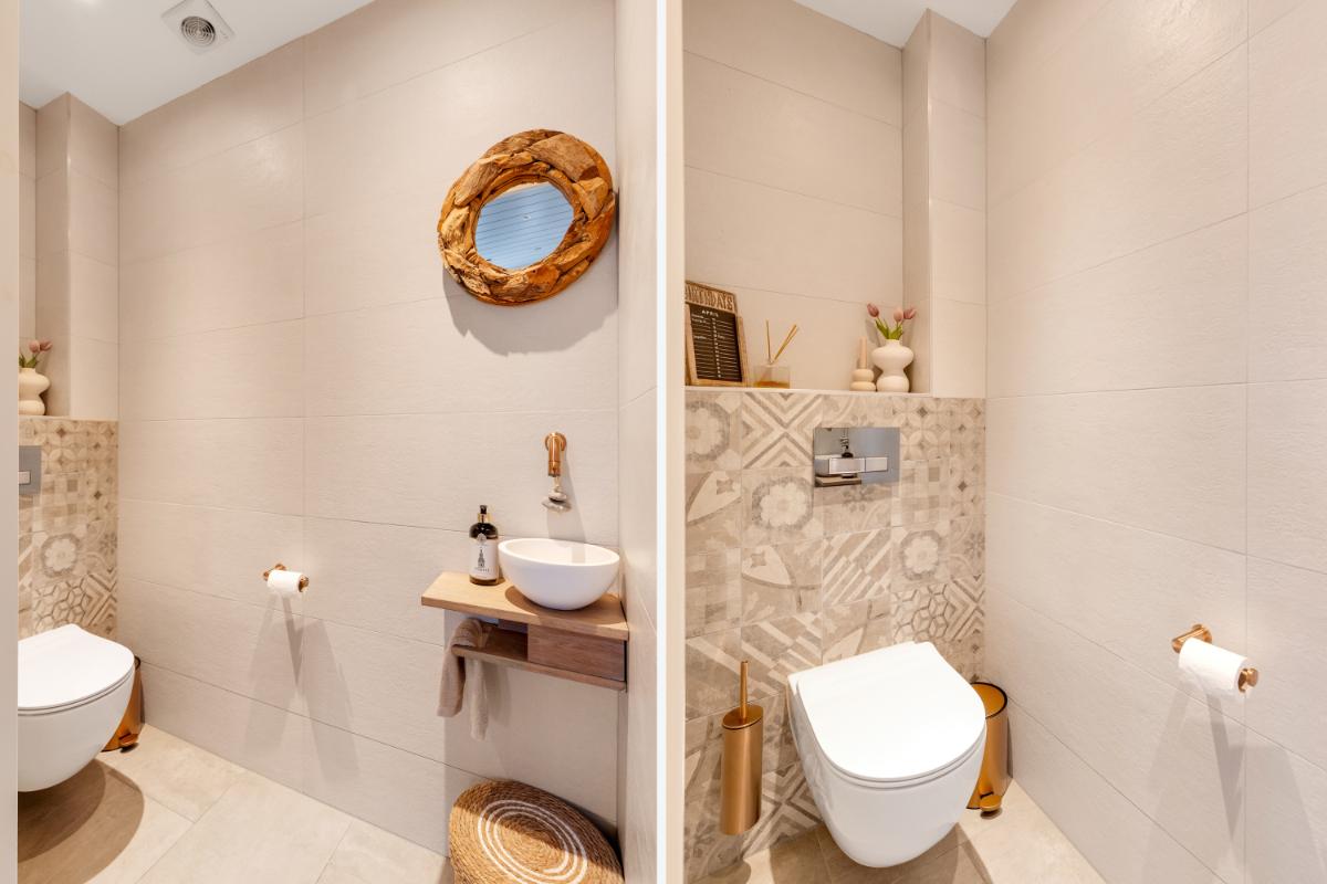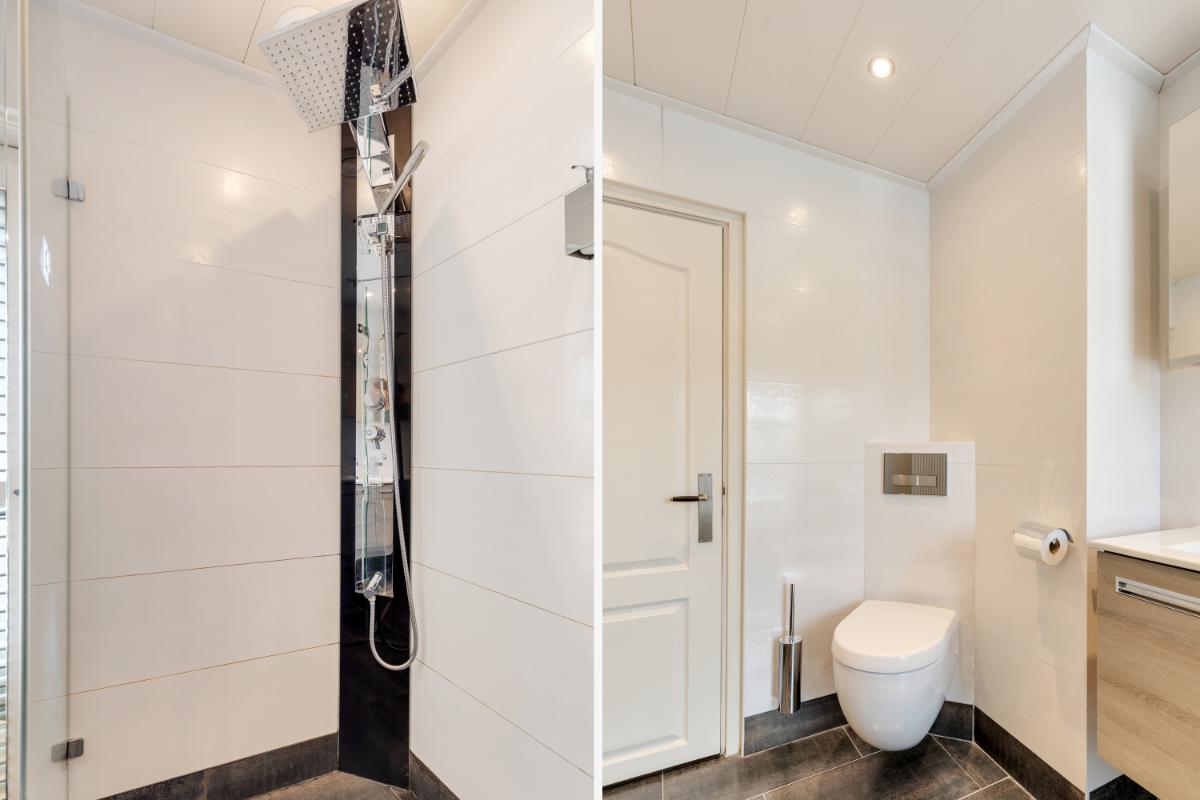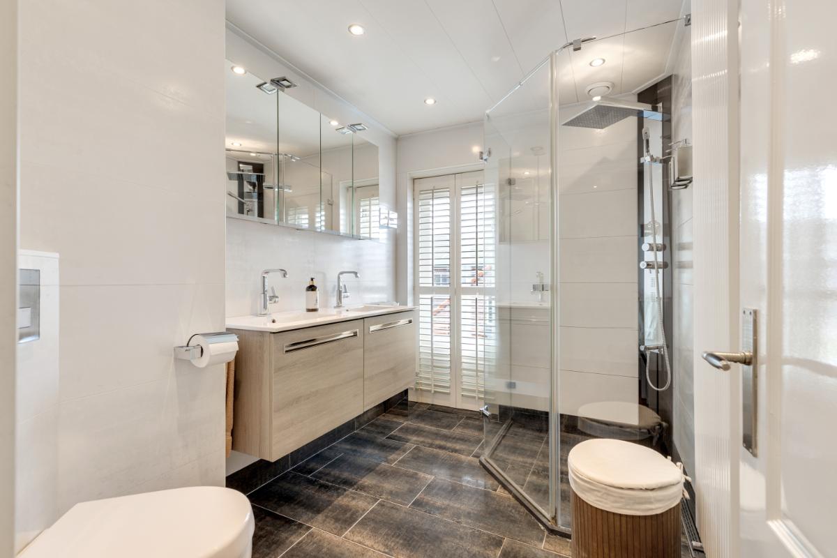 Eerste verdieping: op de eerste verdieping bevinden zich twee royale slaapkamers. De slaapkamer aan de voorzijde beschikt over een praktische inloopkast. De kamer aan de achterzijde is ruim en licht. De badkamer is verzorgd en uitgevoerd in een warme kleurstelling. Je vindt hier een inloopdouche, toilet en een dubbele wastafel met meubel. Daarnaast is er toegang tot het balkon.
