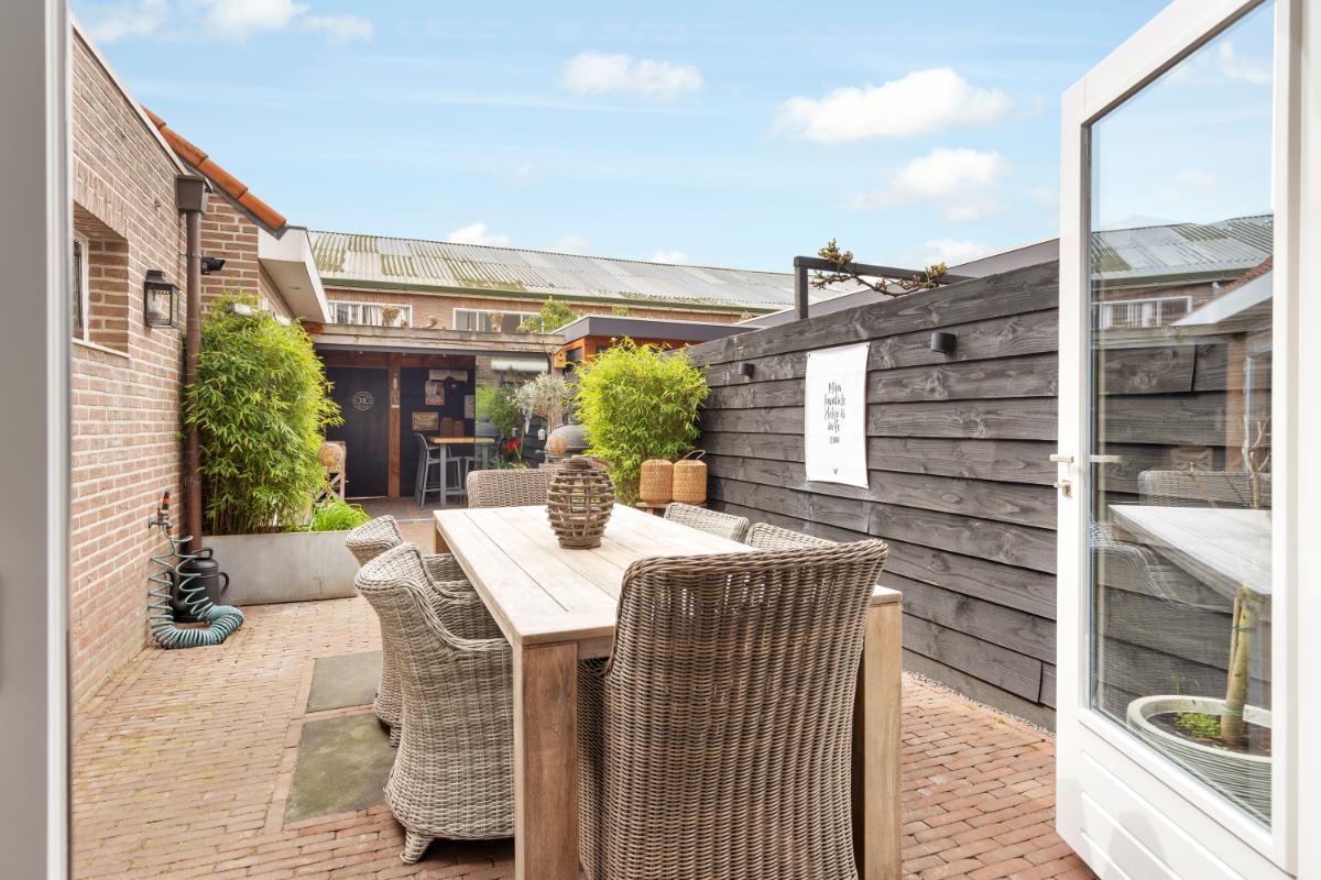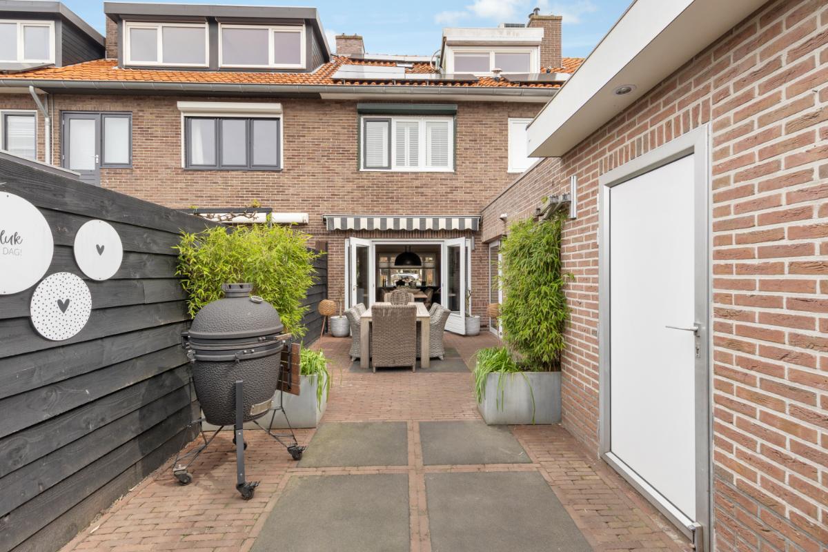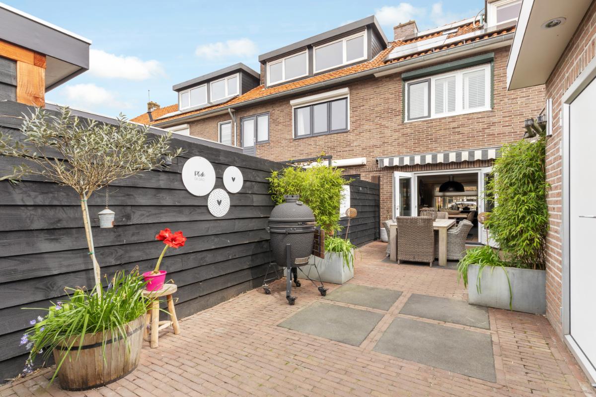 BIJZONDERE KENMERKEN: - Sfeervolle middenwoning - Woonoppervlakte ca. 135 m² - Moderne keuken (2022) met complete inbouwapparatuur - Zonnige achtertuin op het westen met luxe, afsluitbare overkapping - Geïsoleerde stenen berging met elektra, verwarming (eigen CV-ketel) en water - 14 zonnepanelen (2022) - Dakisolatie (van binnenuit) en grotendeels isolerende beglazing - Elektrische zonwering aan voor- en achterzijde - Op loopafstand van het centrum en voorzieningen