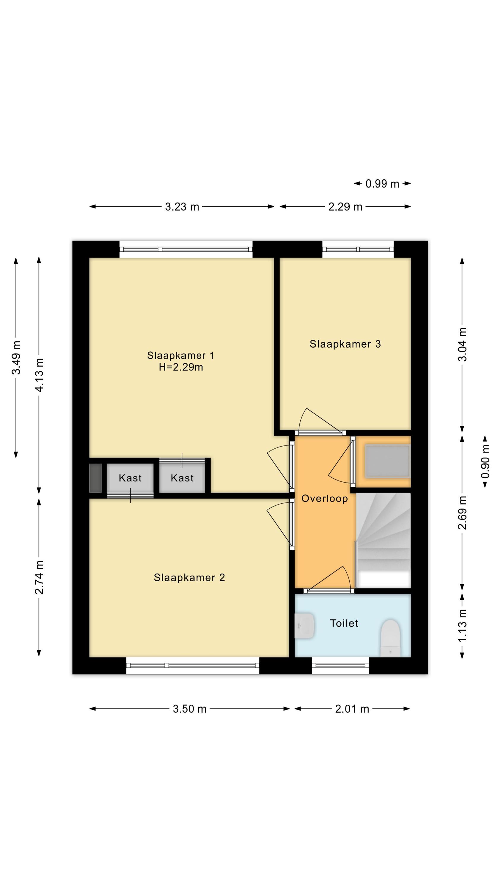 Eerste verdieping: overloop met separaat toilet en wastafel (in voormalige badkamerruimte). Drie slaapkamers, waarvan 2 zijn voorzien van een vaste kast.
