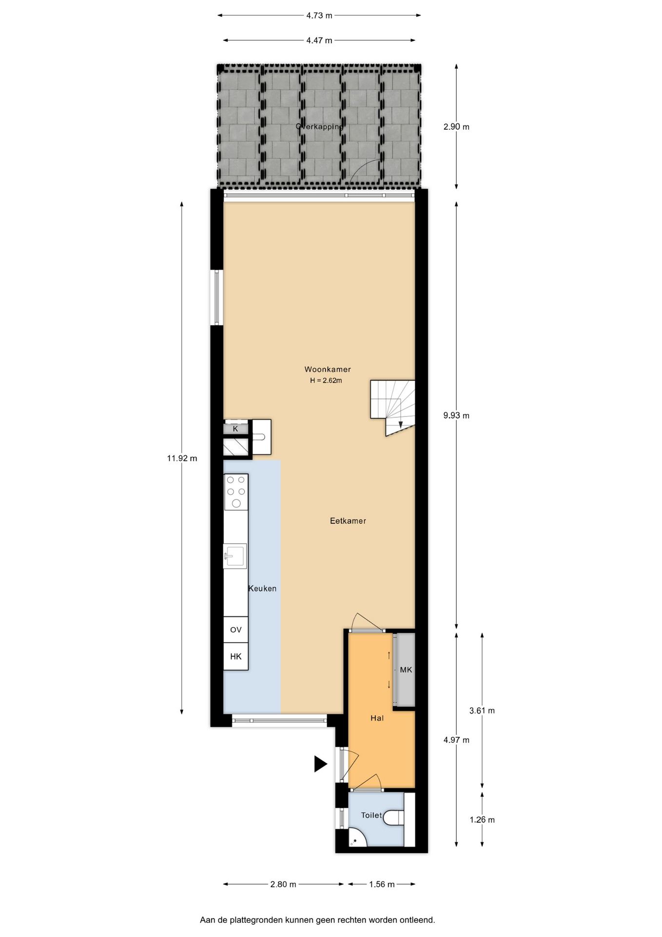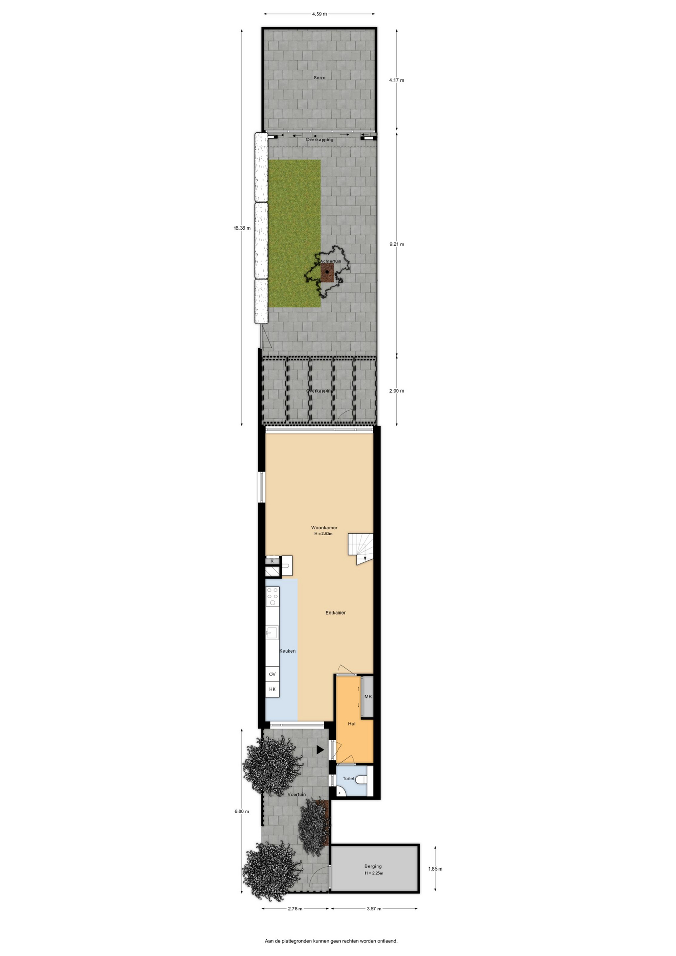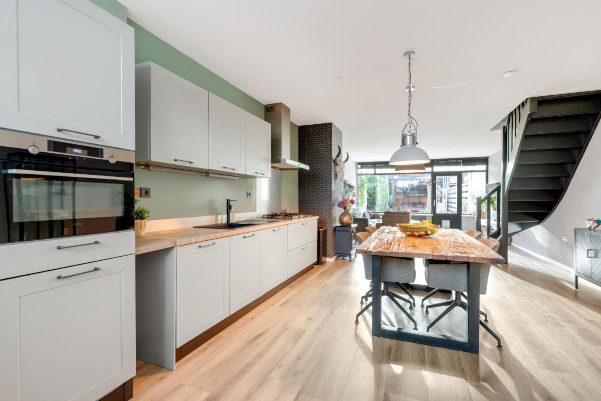 INDELING Begane grond: via de hal bereik je de toiletruimte, meterkast en de woonkamer. Het toilet is uitgerust met een wandcloset en een fonteintje. Aan de voorzijde van de woning bevindt zich de keuken, die ruim genoeg is voor een royale eettafel waar je dagelijks met het gezin kunt genieten van ontbijt en diner. De keuken is compleet uitgerust met een combi-oven, koelkast, vaatwasser, afzuigkap en een 5-pits gasfornuis met wokbrander. Vanuit de keuken en eetkamer loop je direct door naar de woonkamer. Deze is tuingericht en voelt extra ruim dankzij de overkapping die tegen de achtergevel is geplaatst.