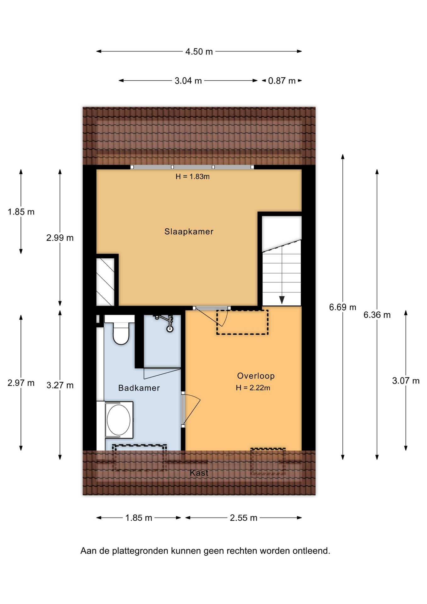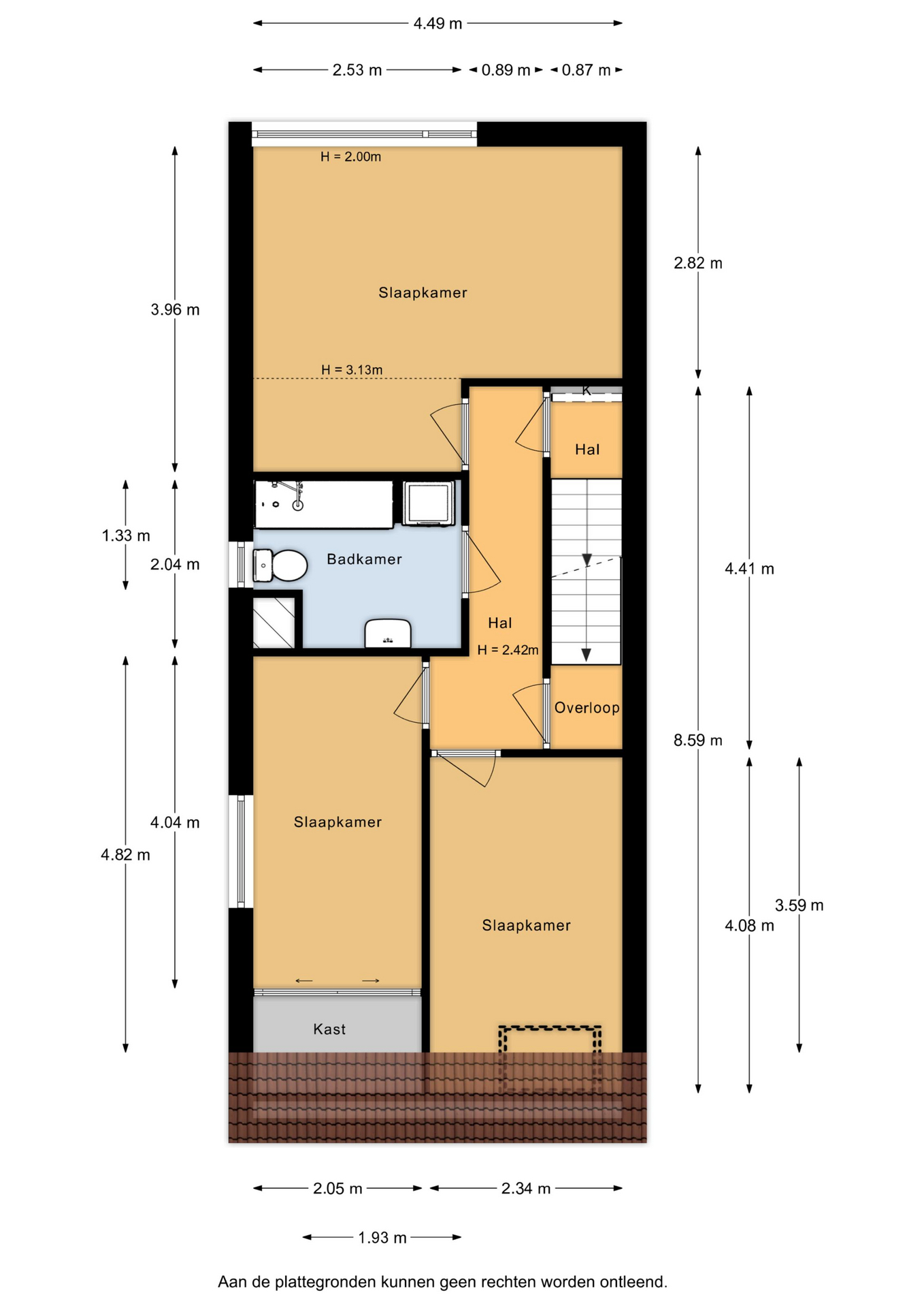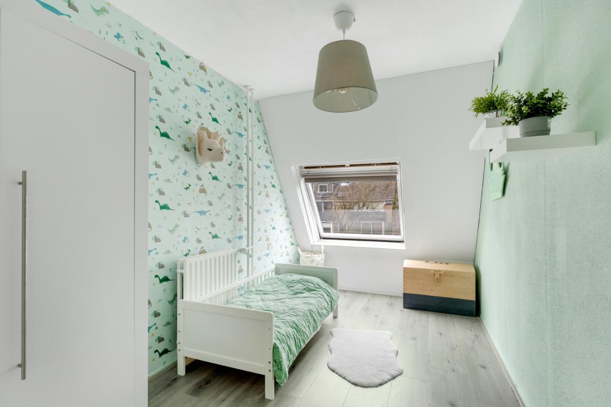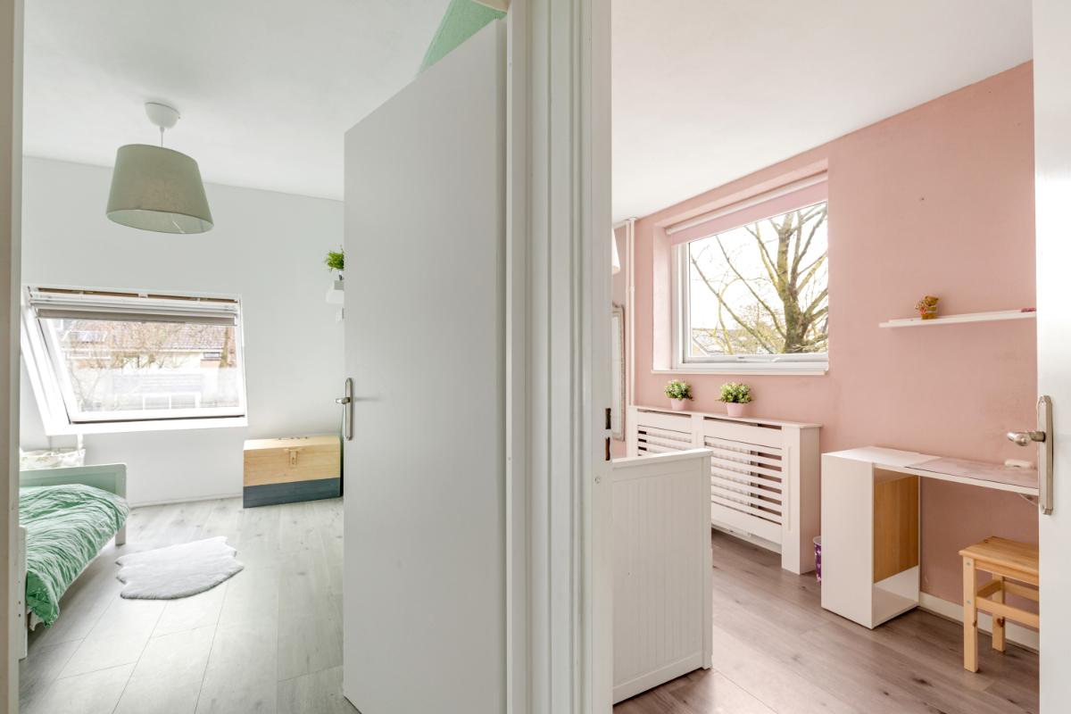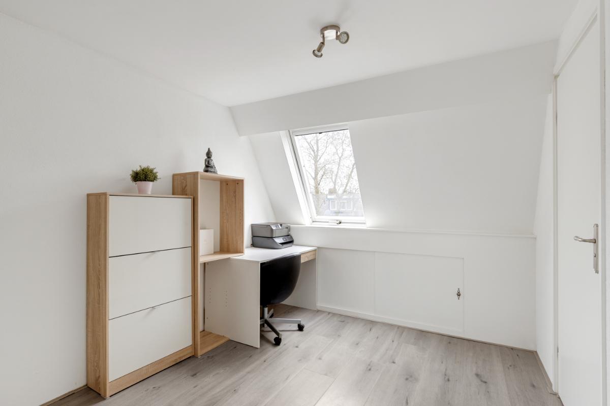 Eerste verdieping: via de trap in de woonkamer kom je op de overloop. Vanuit hier heb je toegang tot drie slaapkamers en de badkamer. De badkamer is wat gedateerd, maar functioneert prima en is voorzien van een wastafelmeubel, wasmachine-aansluitingen, een toilet en een ligbad met douche. Alle drie de slaapkamers hebben een prettig formaat en zijn netjes afgewerkt met een laminaatvloer en spachtelputz wanden.