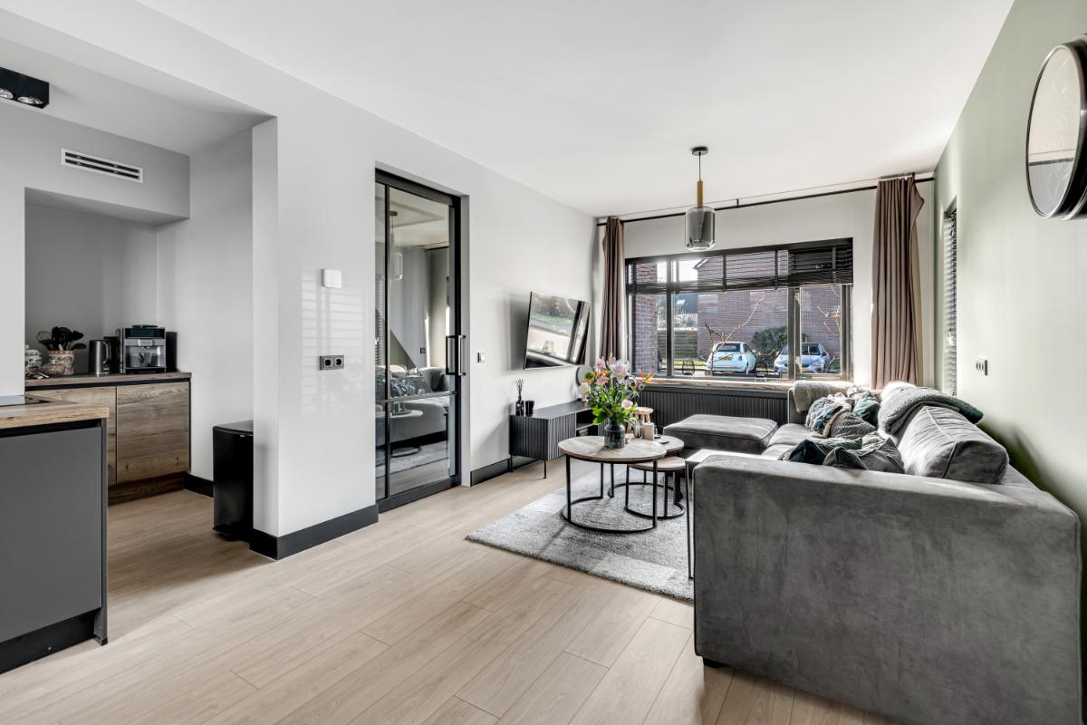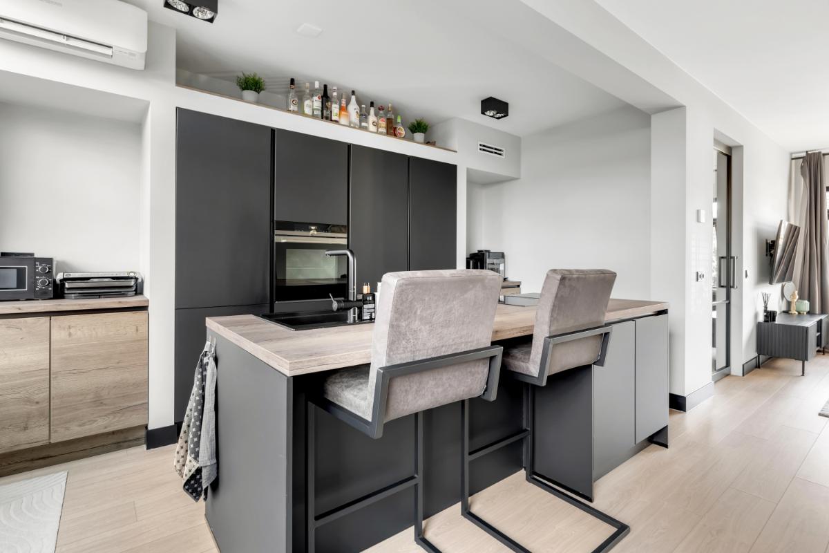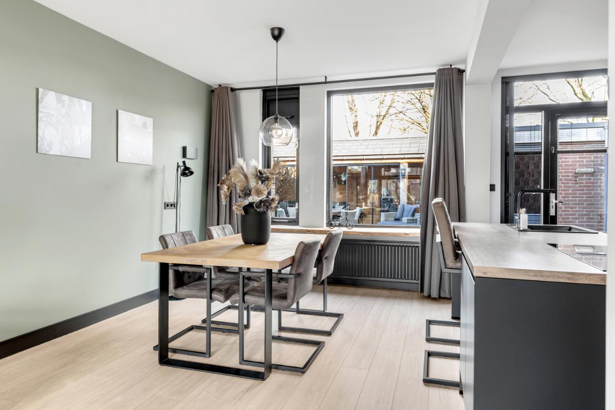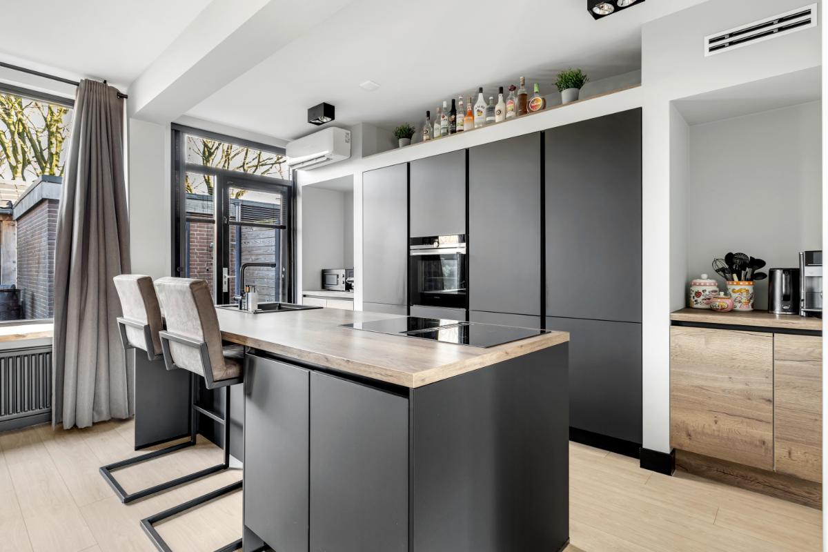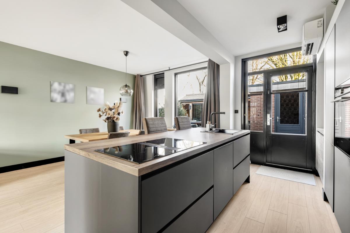 Aan de tuinzijde bevindt zich de open keuken. De keuken is praktisch én stijlvol ingericht met een royale kastenwand die zorgt voor veel bergruimte en een rustige, strakke uitstraling. Daartegenover bevindt zich het kookeiland, wat niet alleen extra werkruimte biedt, maar ook uitnodigt tot gezellig aanschuiven tijdens het koken. De keuken is uitgevoerd in een moderne, tijdloze kleurstelling wat bijdraagt aan de verzorgde en eigentijdse sfeer. Uiteraard is de keuken voorzien van diverse inbouwapparatuur, waaronder een inductiekookplaat, oven, koelkast en vaatwasmachine. Vanuit de keuken is er direct toegang tot de achtertuin.