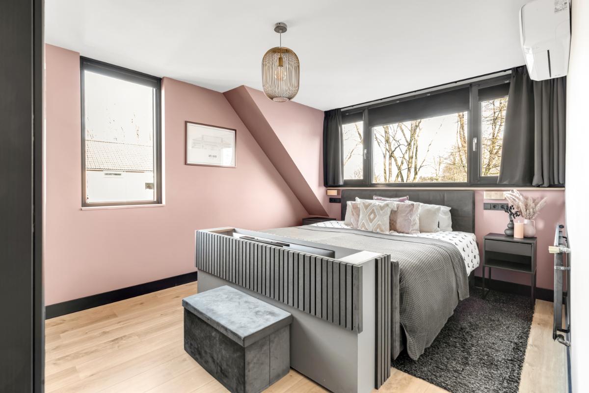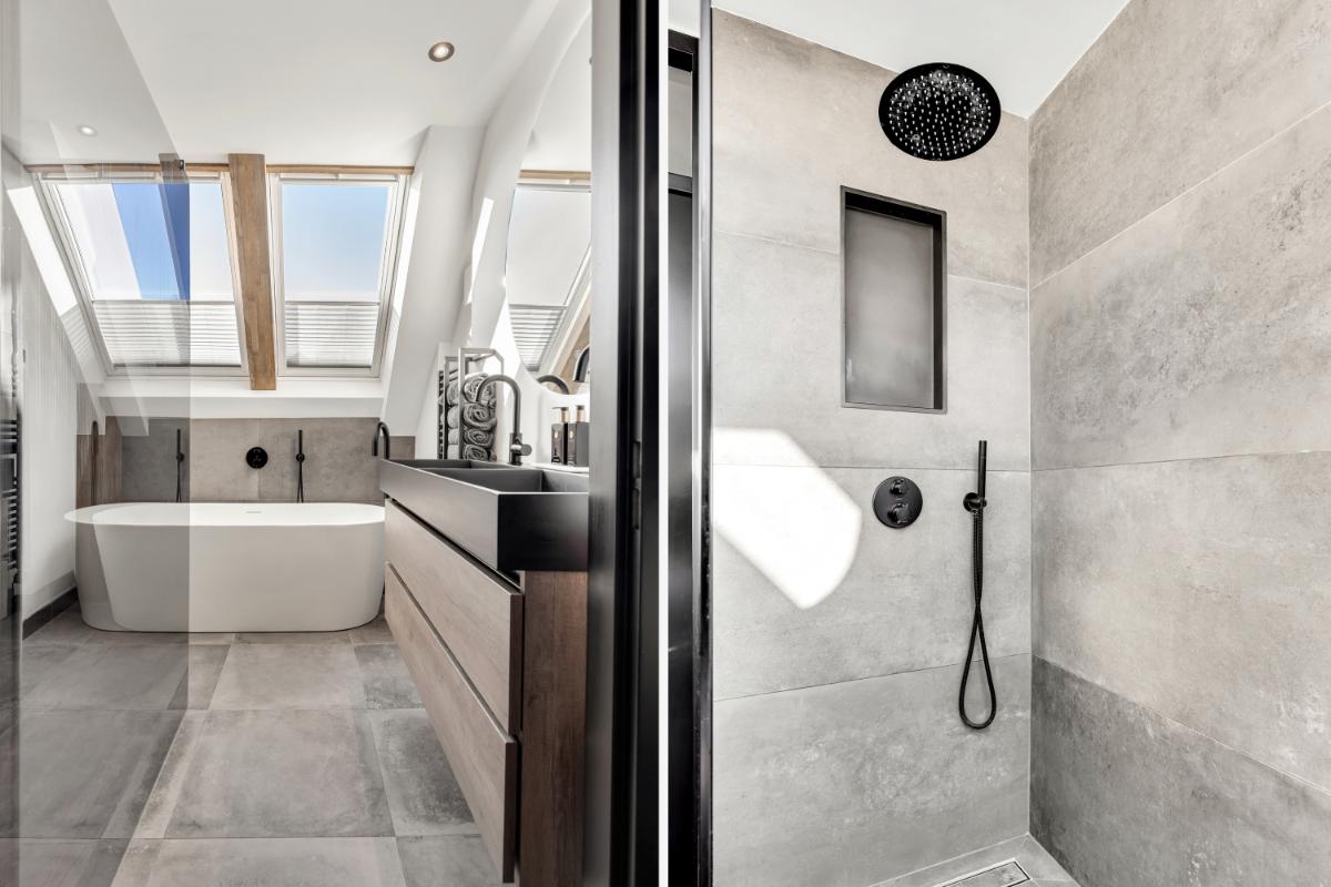 De badkamer, vernieuwd in 2023, is modern en luxe uitgevoerd met een dubbele wastafel, vrijstaand ligbad, ruime inloopdouche, vloerverwarming, inbouwspots en een spiegel met verlichting en verwarming. Daarnaast is er op deze verdieping een separaat toilet met fonteintje. De gehele verdieping is afgewerkt met een doorgelegde laminaatvloer, wat zorgt voor een rustige en verzorgde uitstraling.