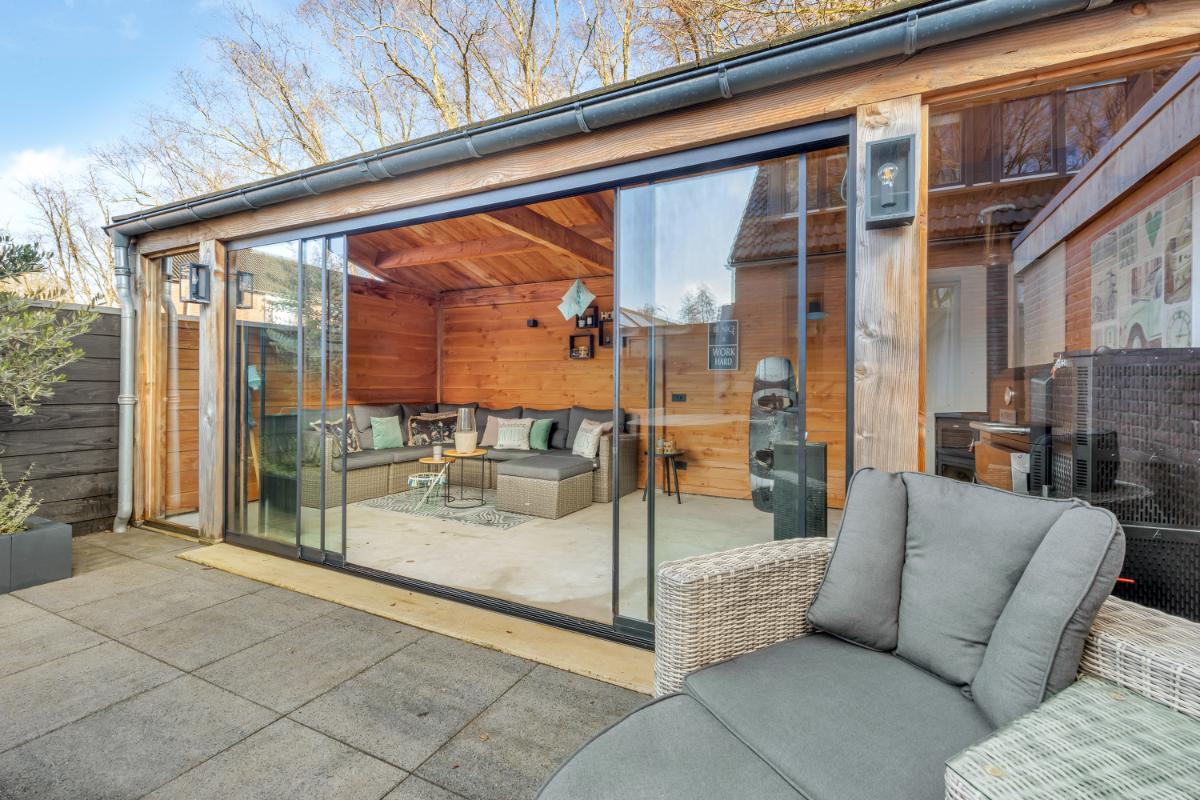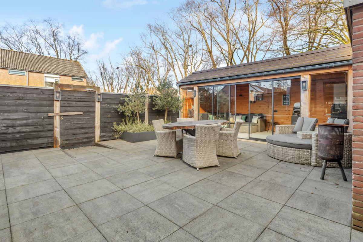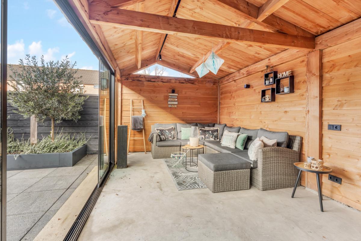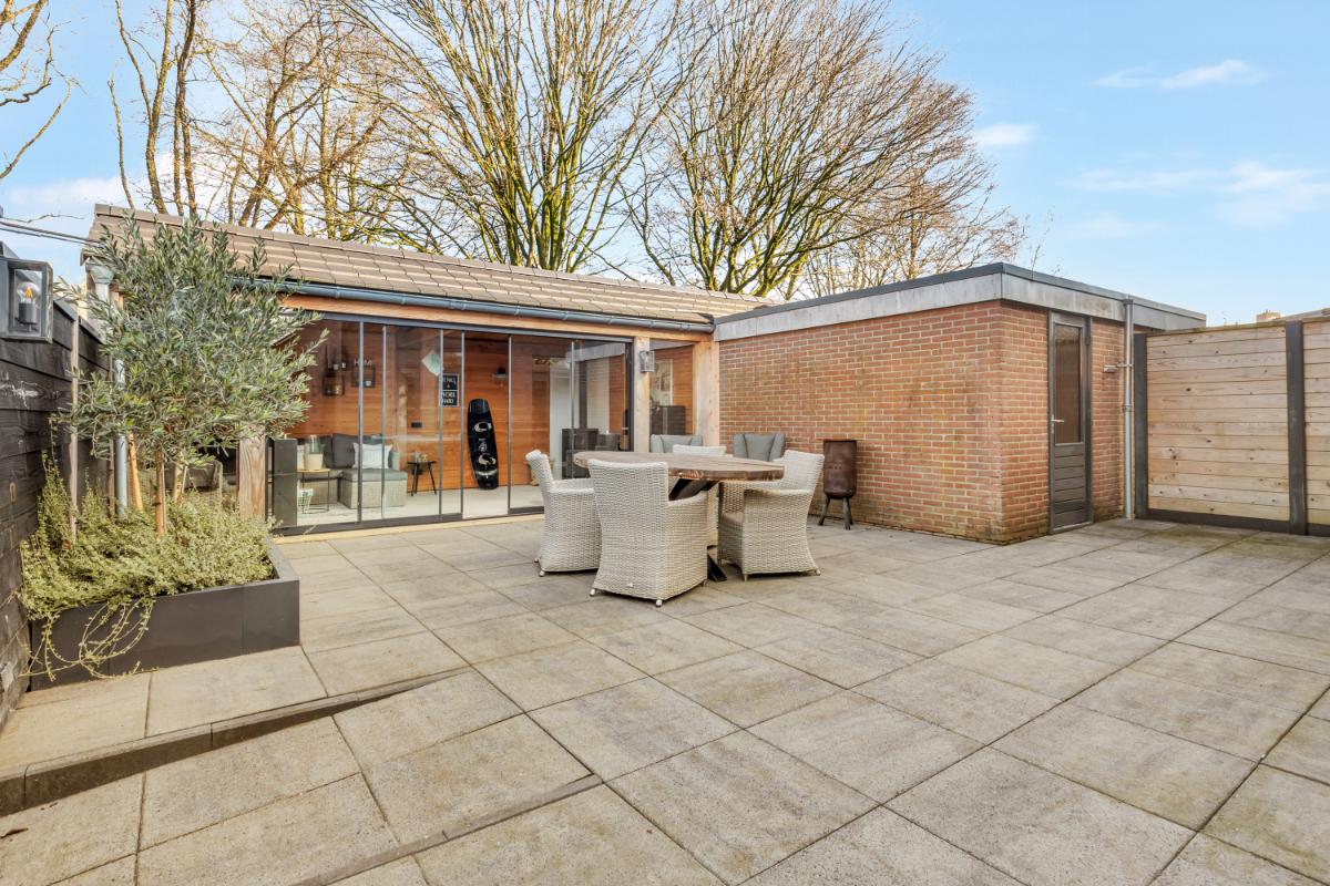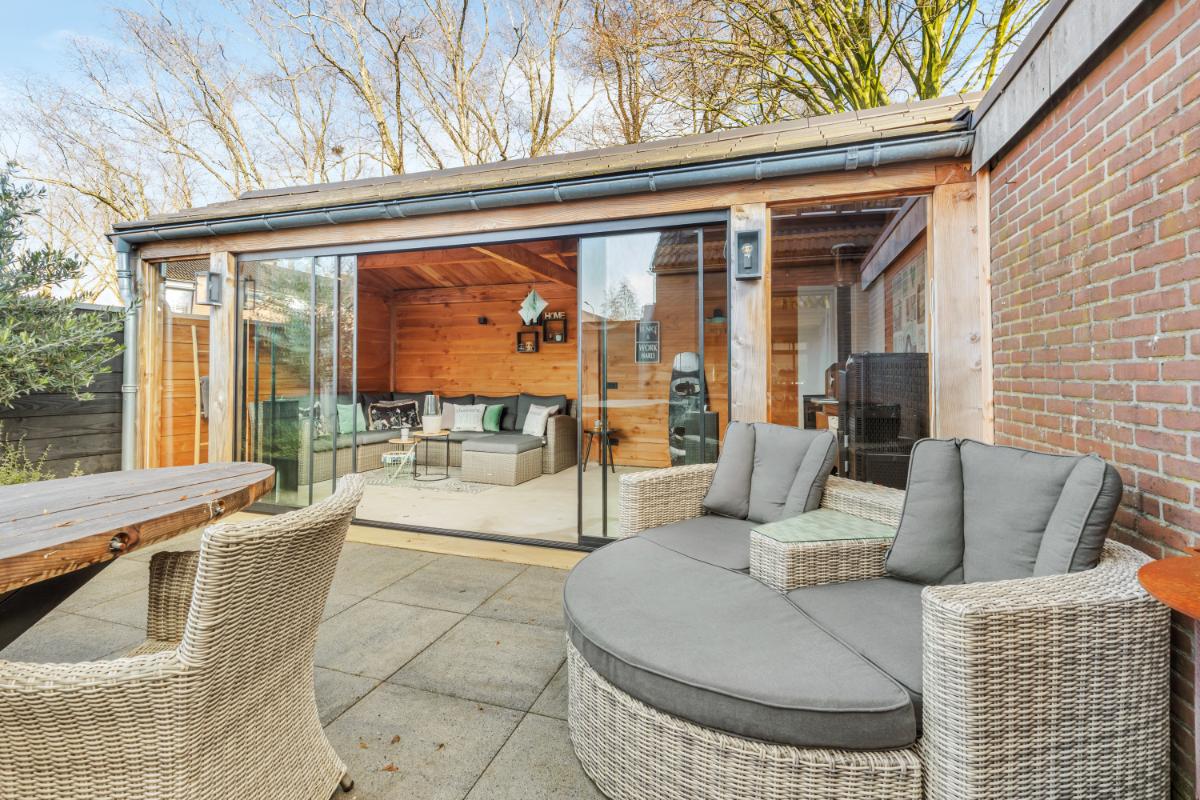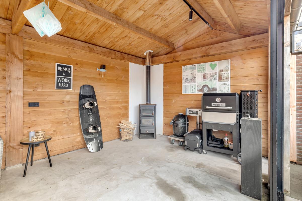 Tuin: de achtertuin is onderhoudsvriendelijk aangelegd met siertegels. Achterin de tuin bevindt zich een vergrote berging en aansluitend een royale overkapping met glazen schuifwanden, betonvloer, verlichting en een houtkachel. Een heerlijke plek waar je het hele jaar door kunt genieten, of het nu gaat om lange zomeravonden of knusse wintermomenten.