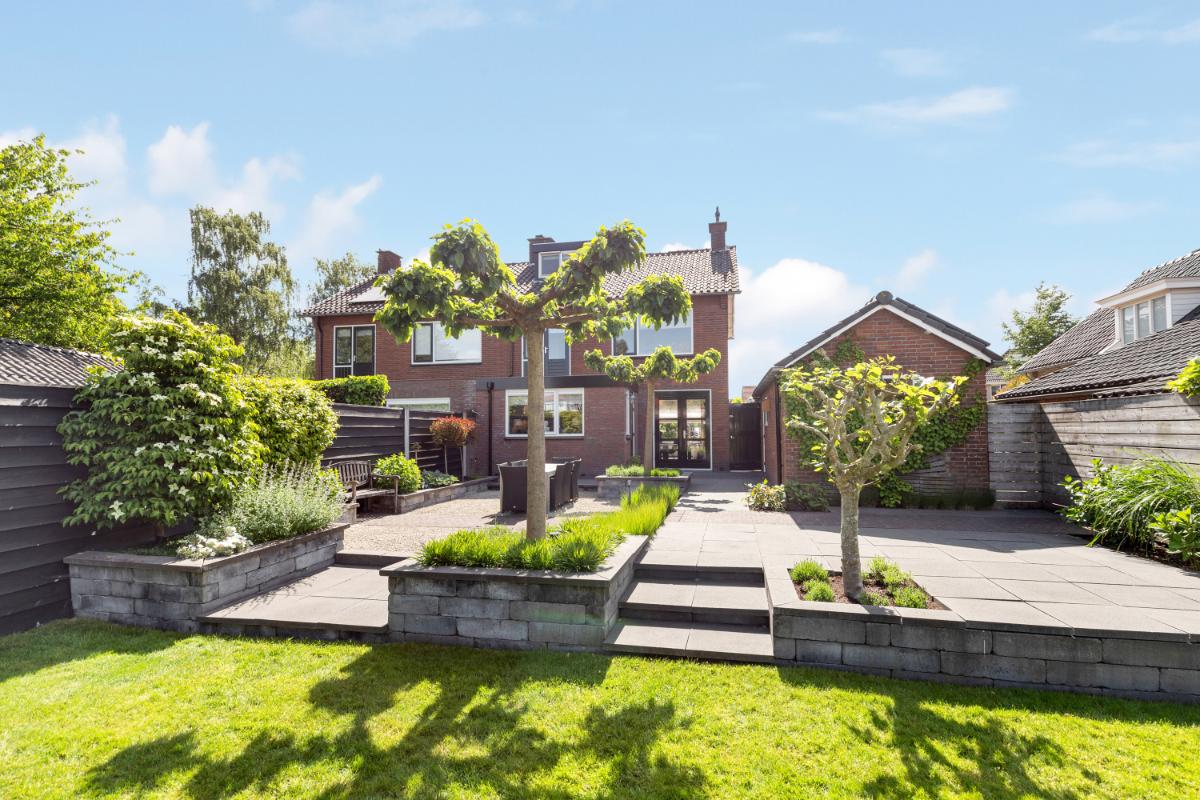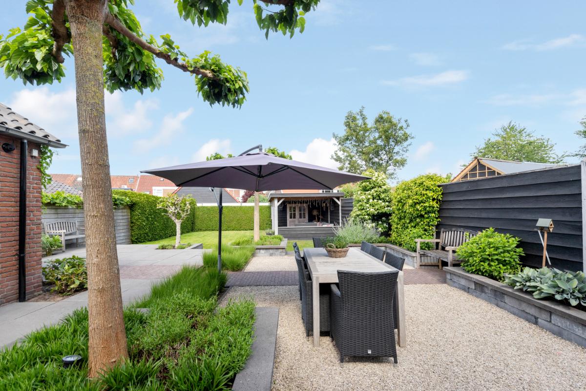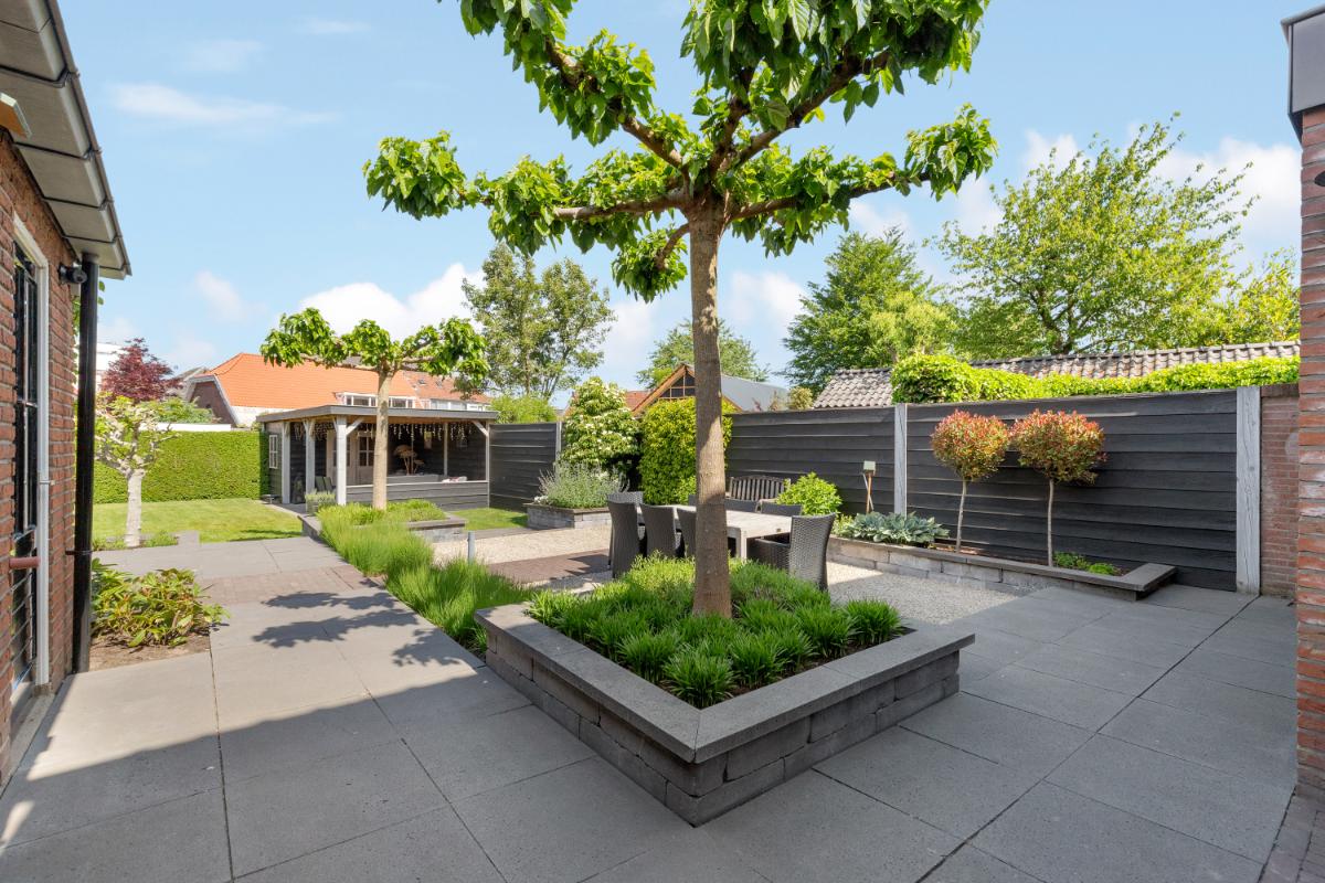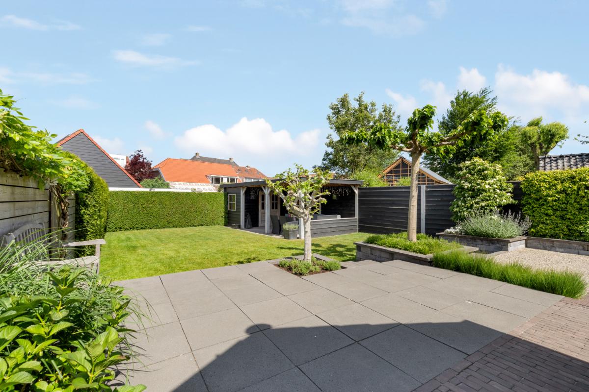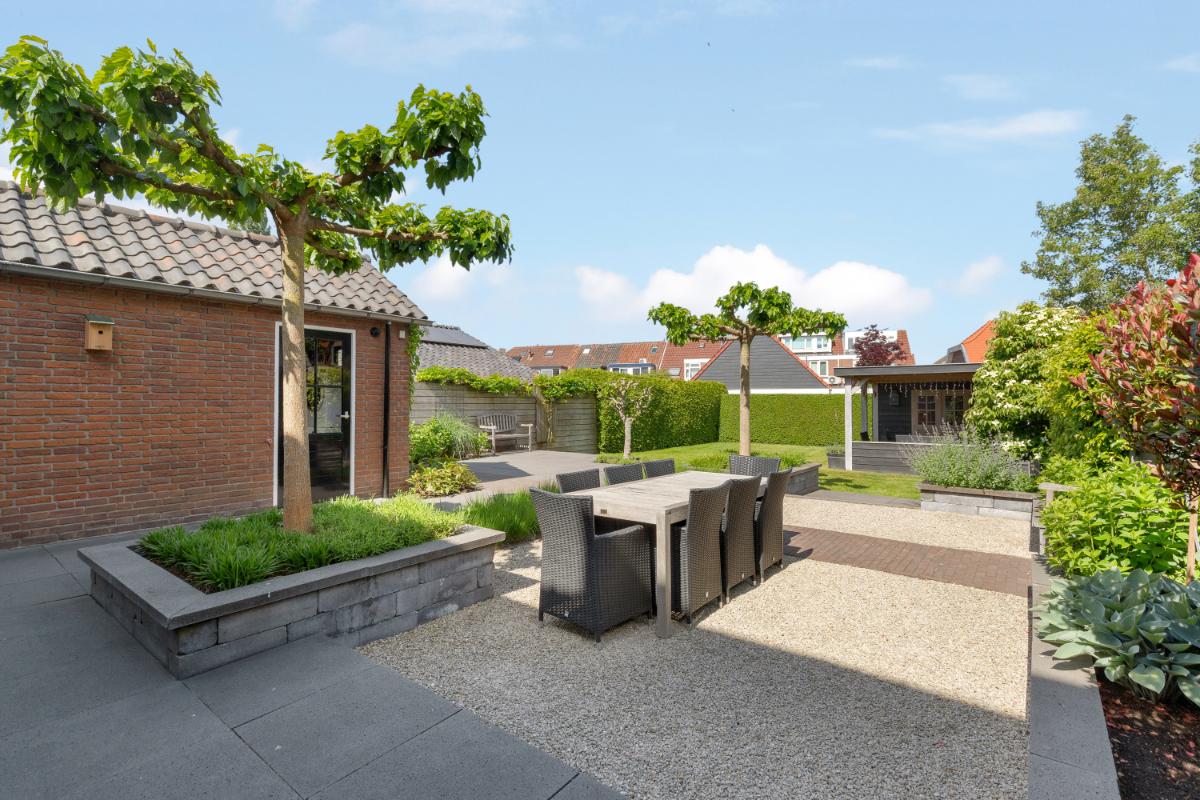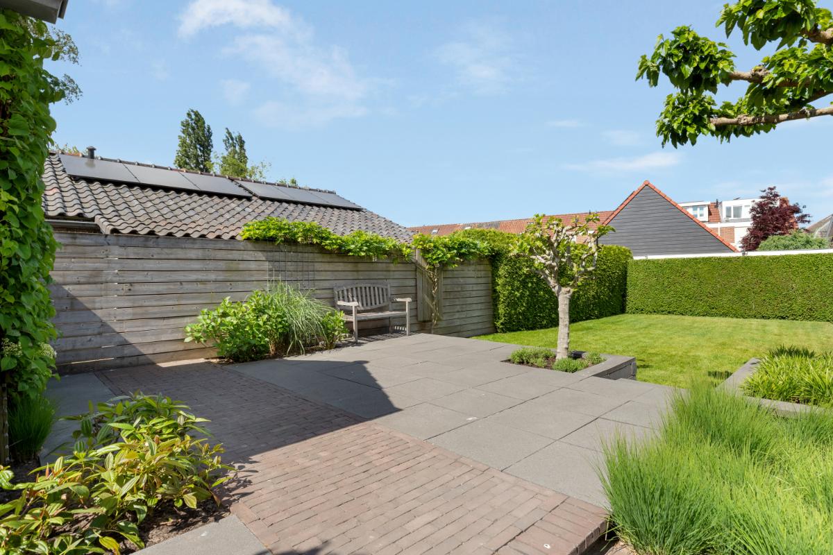 De achtertuin is een absoluut pluspunt: maar liefst 24 meter diep en 9 meter breed, strak aangelegd met meerdere terrassen, groenblijvende beplanting en een sfeervolle veranda met loungehoek. Door de ligging op het noordwesten en de diepte van het perceel kun je op elk moment van de dag van de zon genieten. De tuin biedt volop privacy en rust. Aan de zijkant van het huis bevindt zich een ruime oprit met toegang tot de vrijstaande stenen garage, die is voorzien van elektra, water en aansluitingen voor wasmachine en droger.