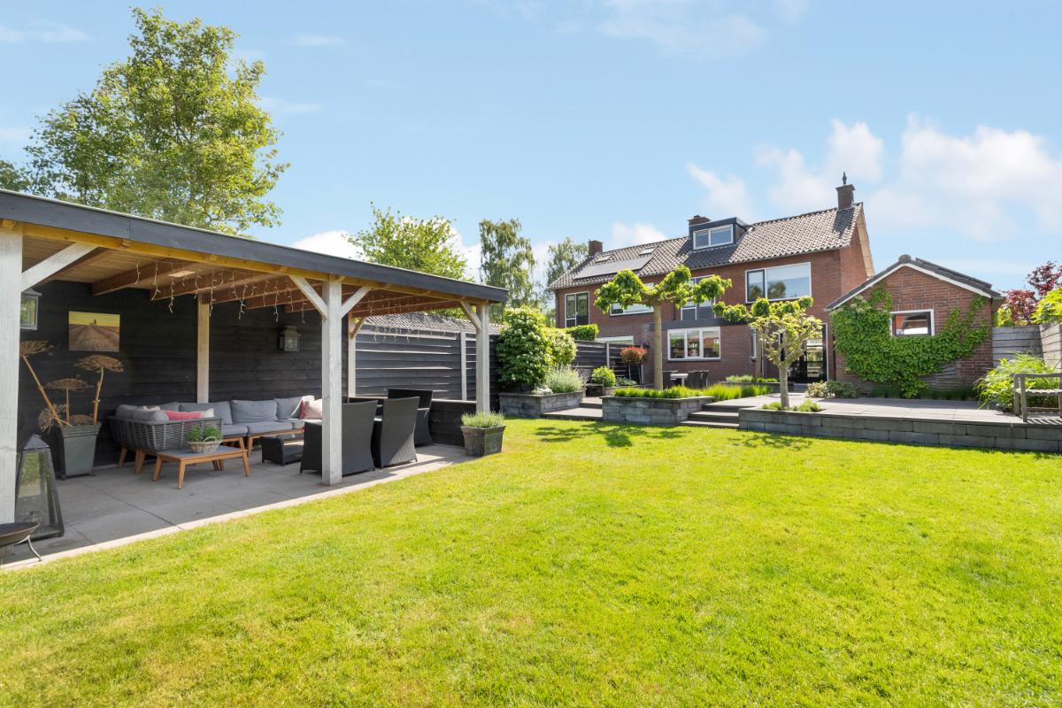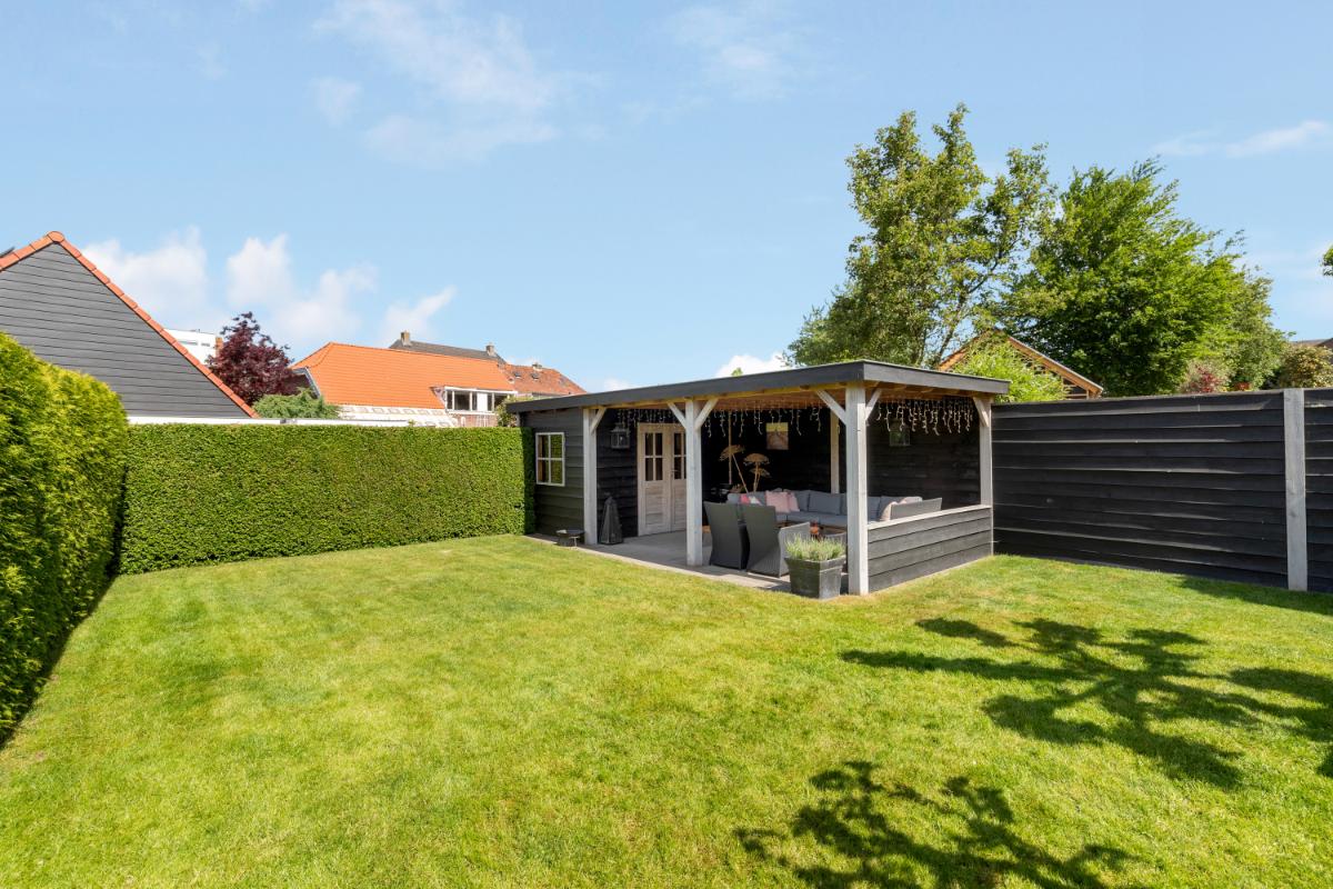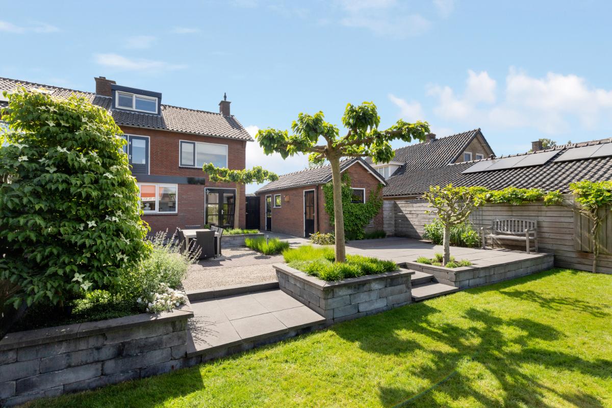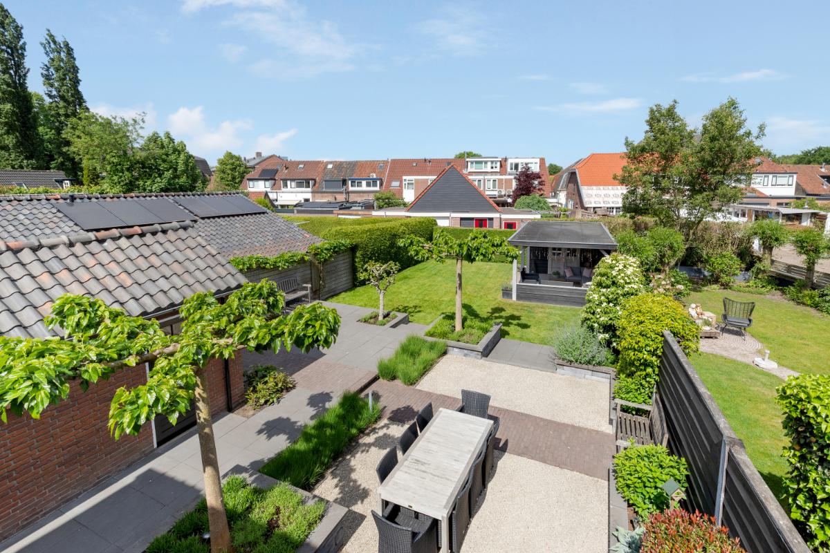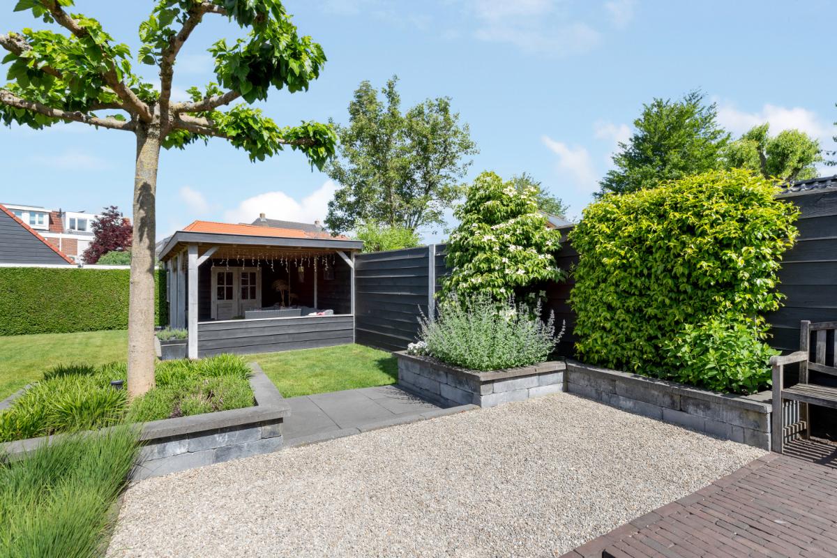 De achtertuin is een absoluut pluspunt: maar liefst 24 meter diep en 9 meter breed, strak aangelegd met meerdere terrassen, groenblijvende beplanting en een sfeervolle veranda met loungehoek. Door de ligging op het noordwesten en de diepte van het perceel kun je op elk moment van de dag van de zon genieten. De tuin biedt volop privacy en rust. Aan de zijkant van het huis bevindt zich een ruime oprit met toegang tot de vrijstaande stenen garage, die is voorzien van elektra, water en aansluitingen voor wasmachine en droger.