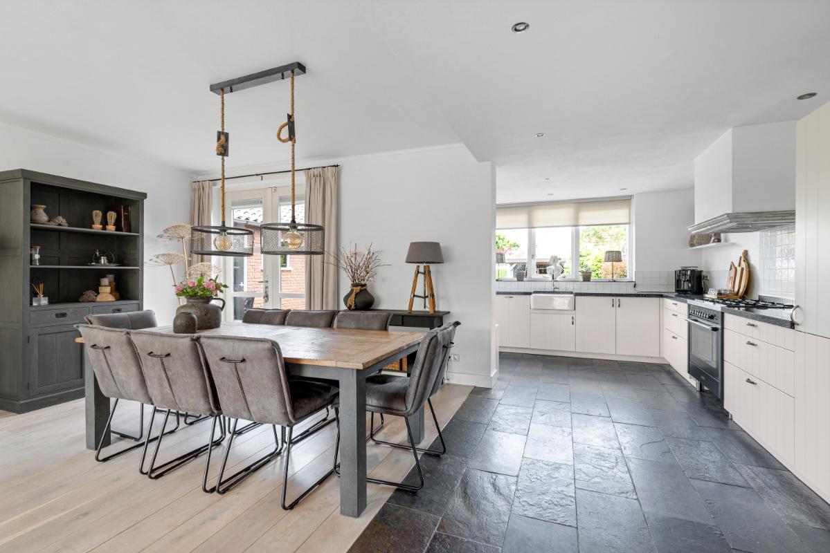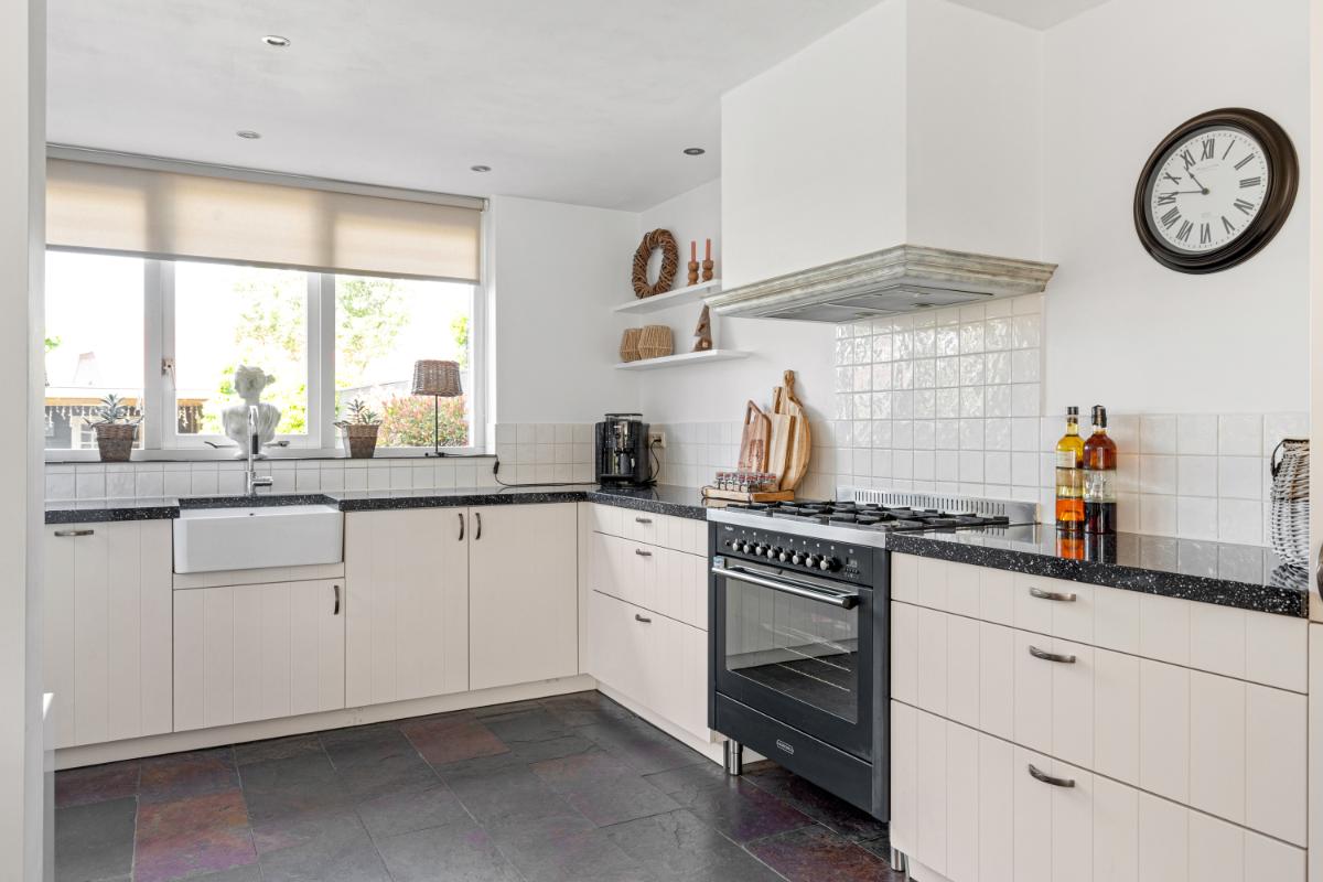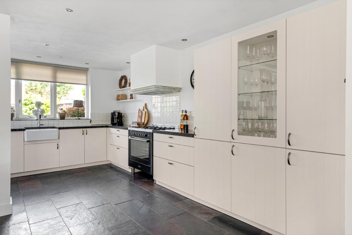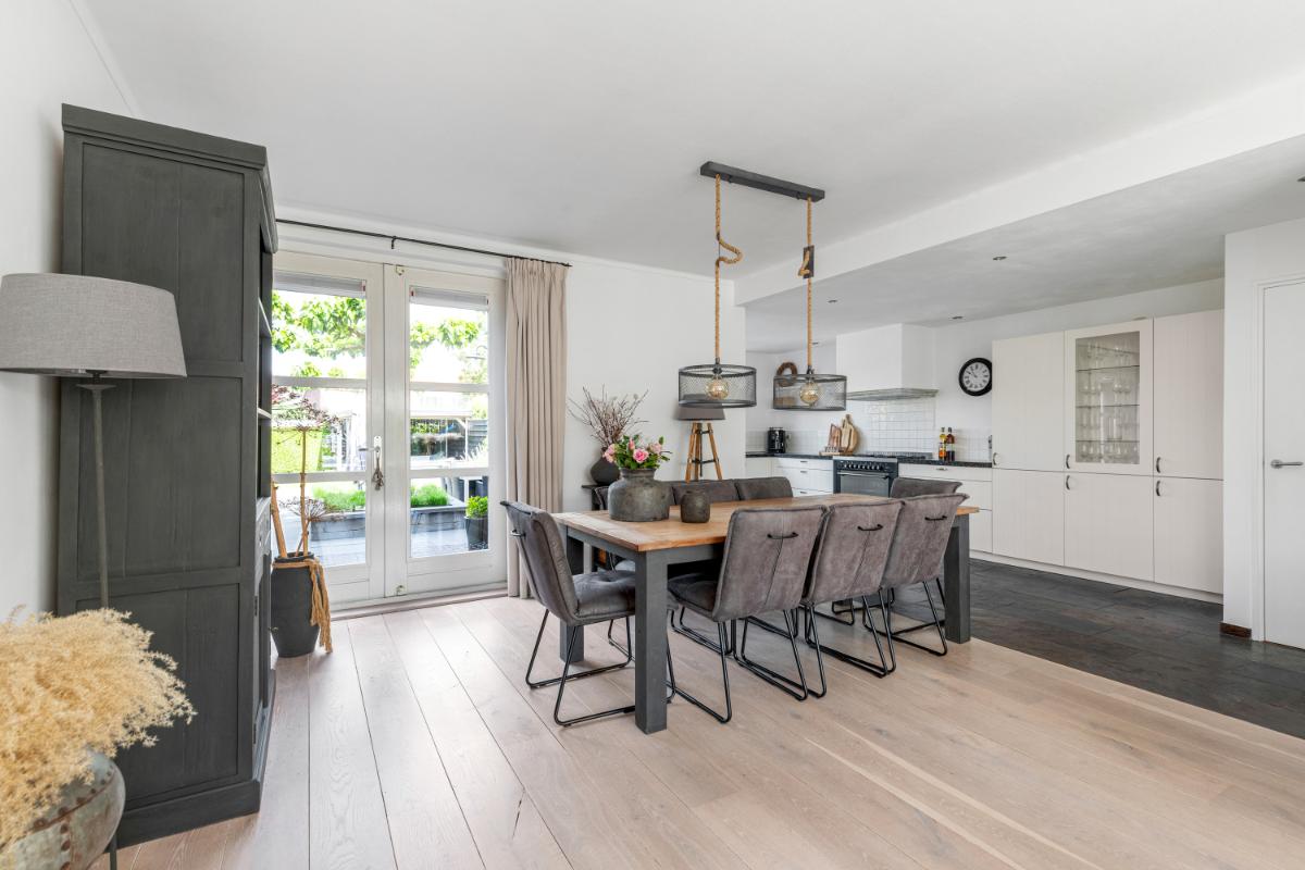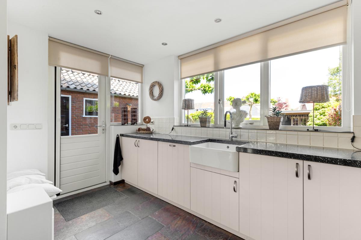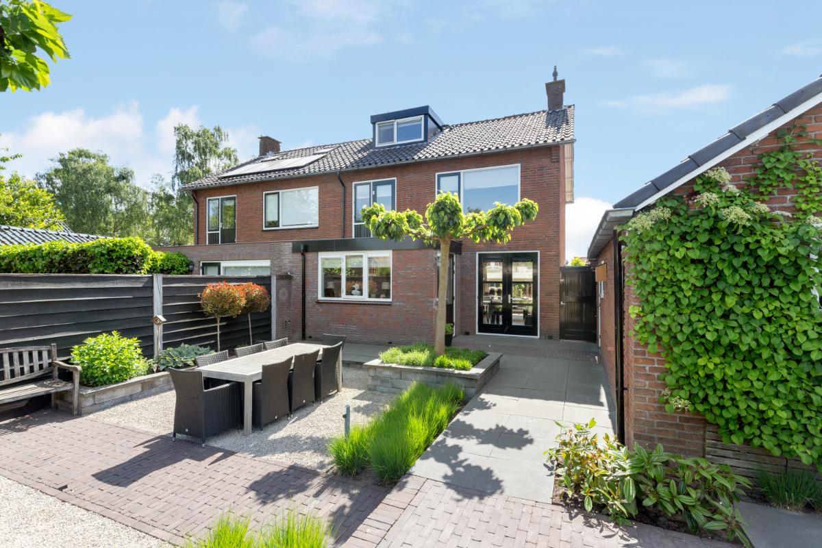 De achtertuin is een absoluut pluspunt: maar liefst 24 meter diep en 9 meter breed, strak aangelegd met meerdere terrassen, groenblijvende beplanting en een sfeervolle veranda met loungehoek. Door de ligging op het noordwesten en de diepte van het perceel kun je op elk moment van de dag van de zon genieten. De tuin biedt volop privacy en rust. Aan de zijkant van het huis bevindt zich een ruime oprit met toegang tot de vrijstaande stenen garage, die is voorzien van elektra, water en aansluitingen voor wasmachine en droger.