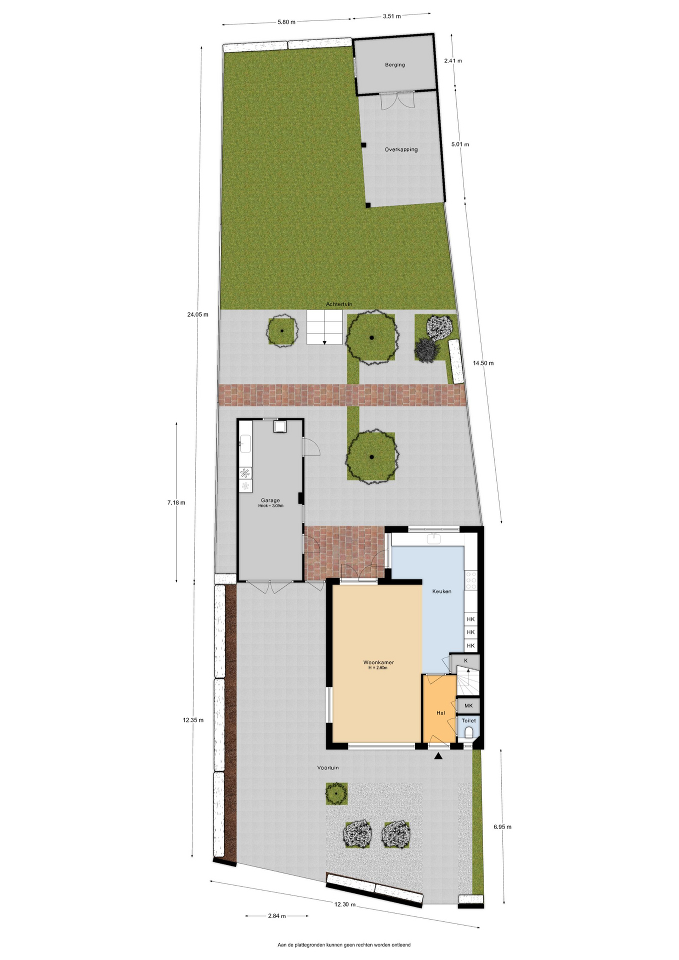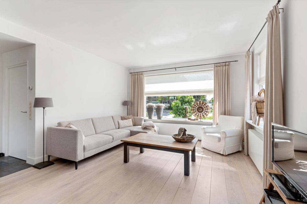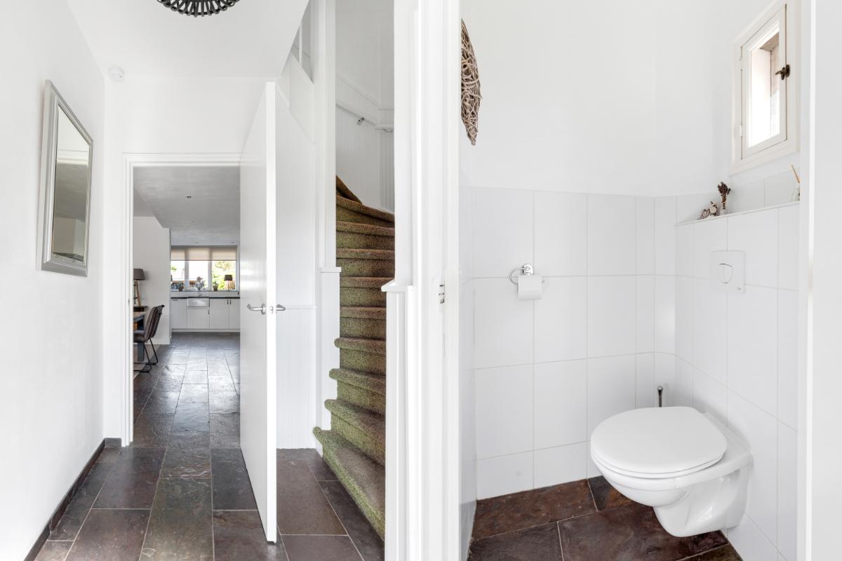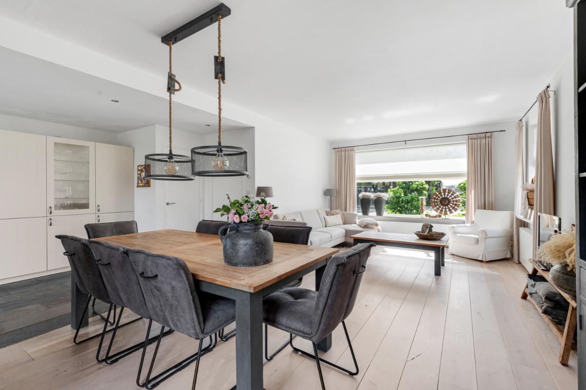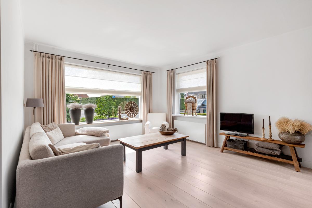 De achtertuin is een absoluut pluspunt: maar liefst 24 meter diep en 9 meter breed, strak aangelegd met meerdere terrassen, groenblijvende beplanting en een sfeervolle veranda met loungehoek. Door de ligging op het noordwesten en de diepte van het perceel kun je op elk moment van de dag van de zon genieten. De tuin biedt volop privacy en rust. Aan de zijkant van het huis bevindt zich een ruime oprit met toegang tot de vrijstaande stenen garage, die is voorzien van elektra, water en aansluitingen voor wasmachine en droger.