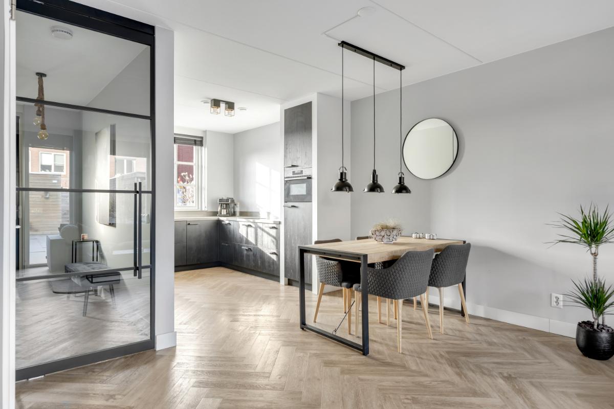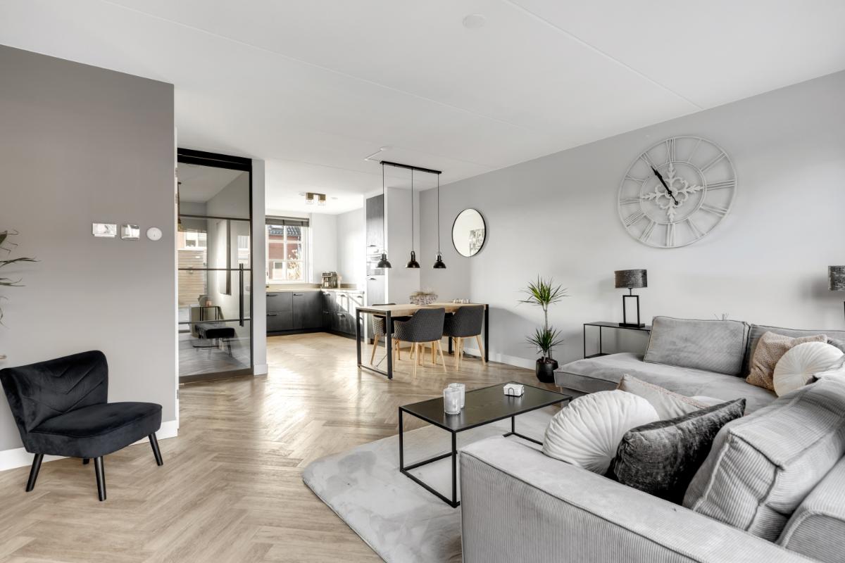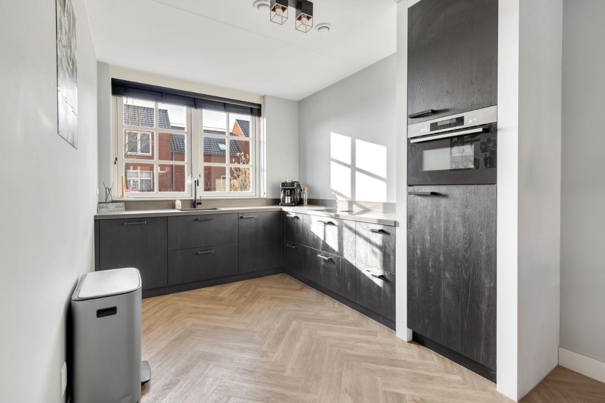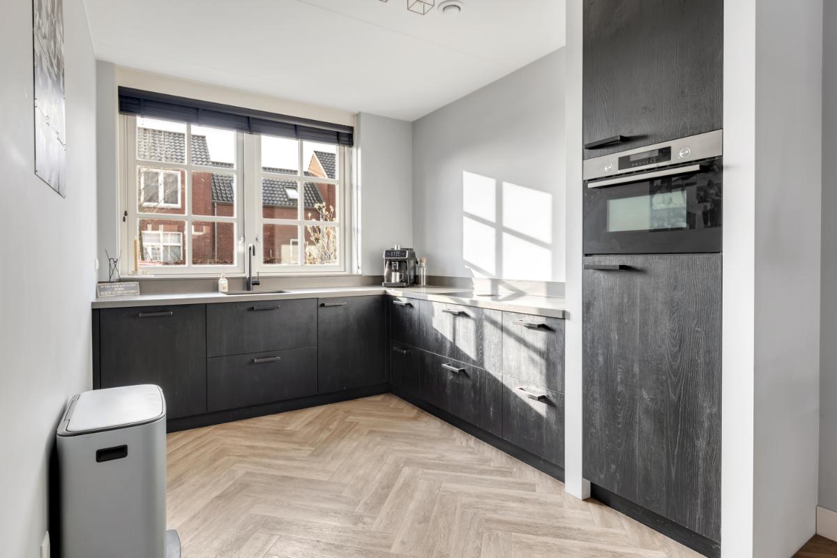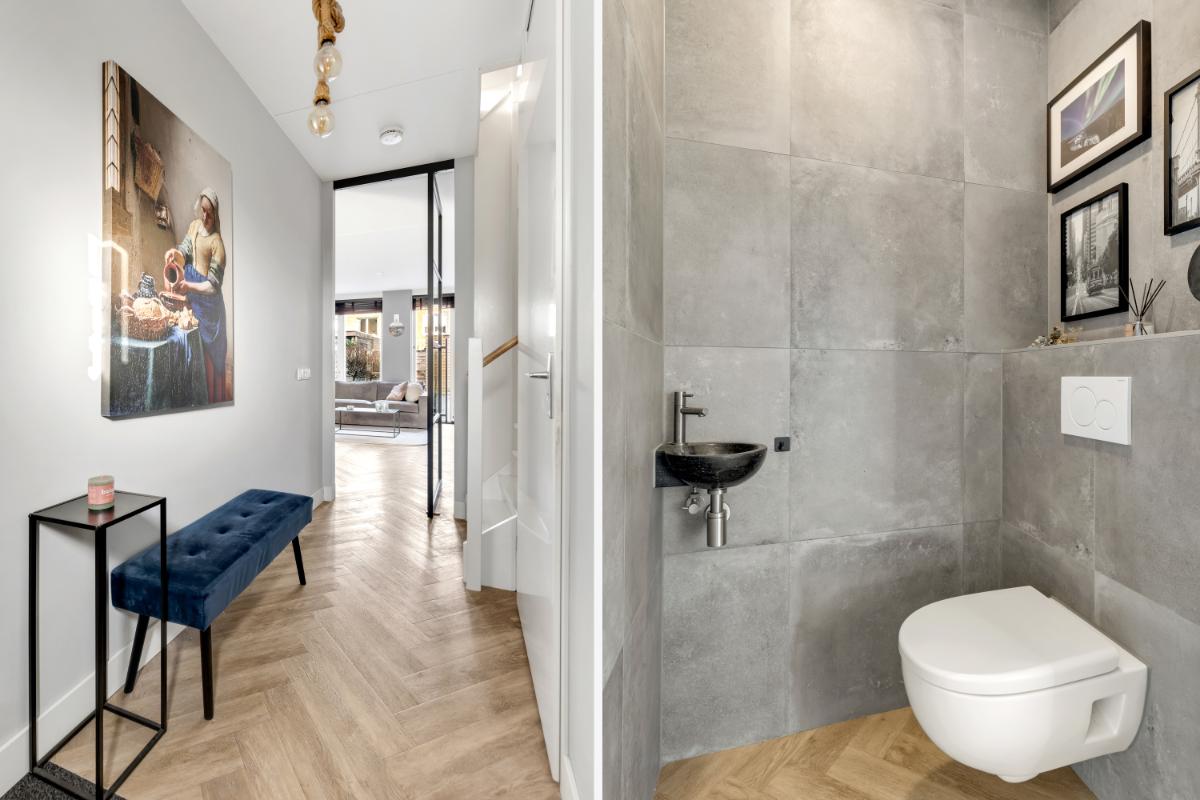 INDELING Begane grond: via de entree kom je in de hal met meterkast, modern toilet met fonteintje en de trapopgang naar de eerste verdieping. Hier ervaar je direct de hoogwaardige afwerking. De woonkamer is heerlijk licht dankzij de grote raampartijen aan de achterzijde en de loopdeur naar de tuin. De strakke PVC-vloer en gladde wandafwerking zorgen voor een rustige en moderne basis. Praktisch is de trapkast, ideaal voor extra bergruimte. Aan de voorzijde bevindt zich de L-vormige keuken, uitgevoerd in een donkere kleurstelling met houtlook fronten. De keuken is stijlvol én functioneel, met diverse inbouwapparatuur zoals een inductiekookplaat met geïntegreerd afzuigsysteem, combi-oven, koelkast, vaatwasmachine en een kokendwaterkraan.