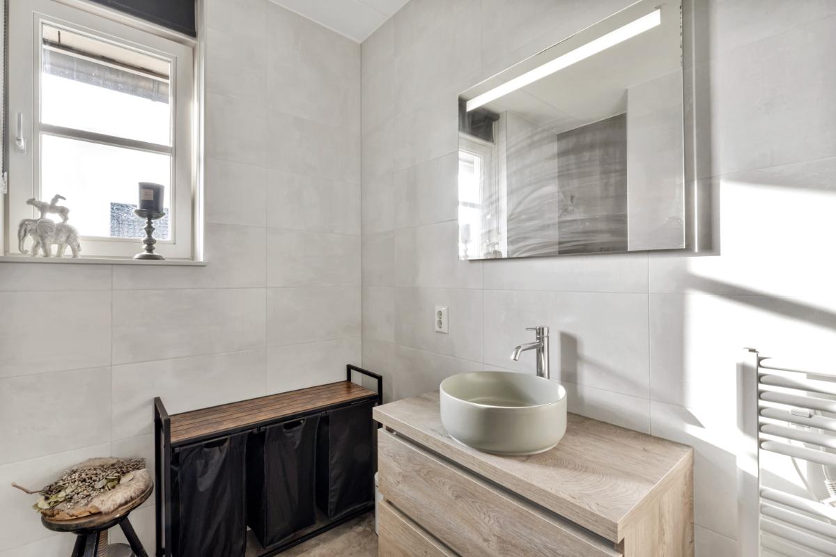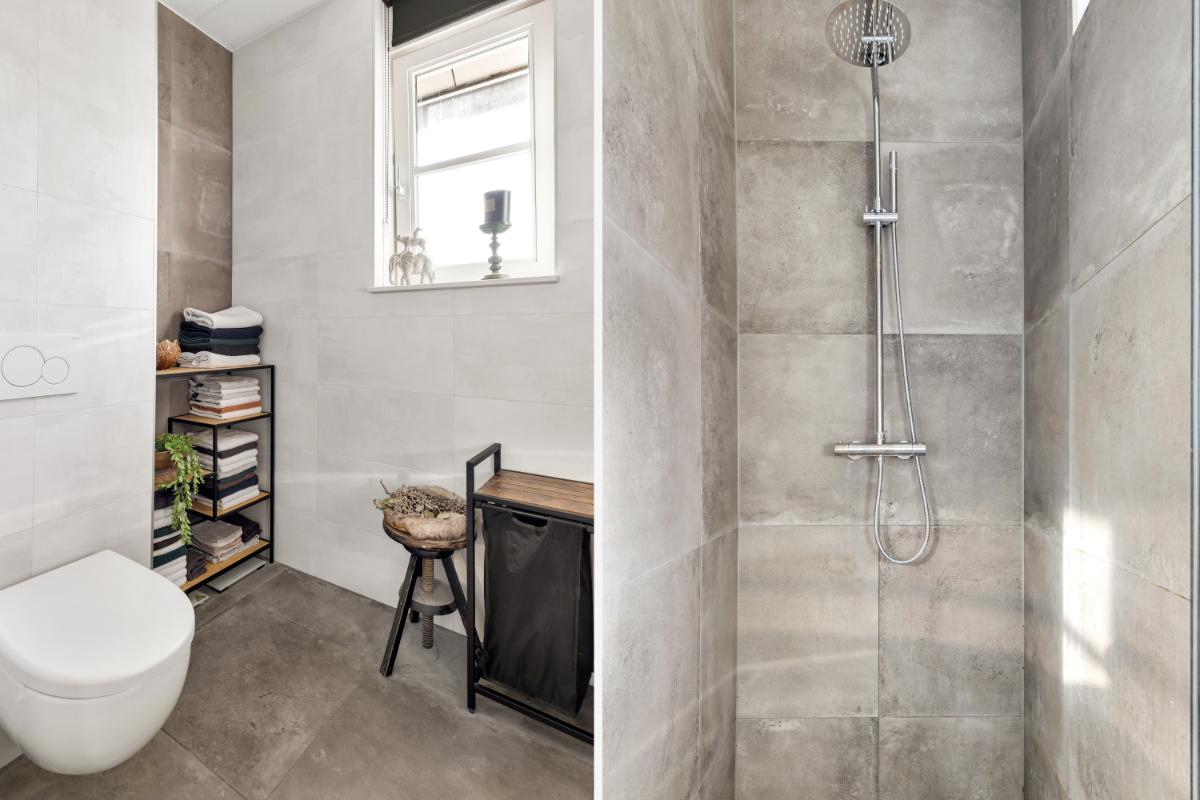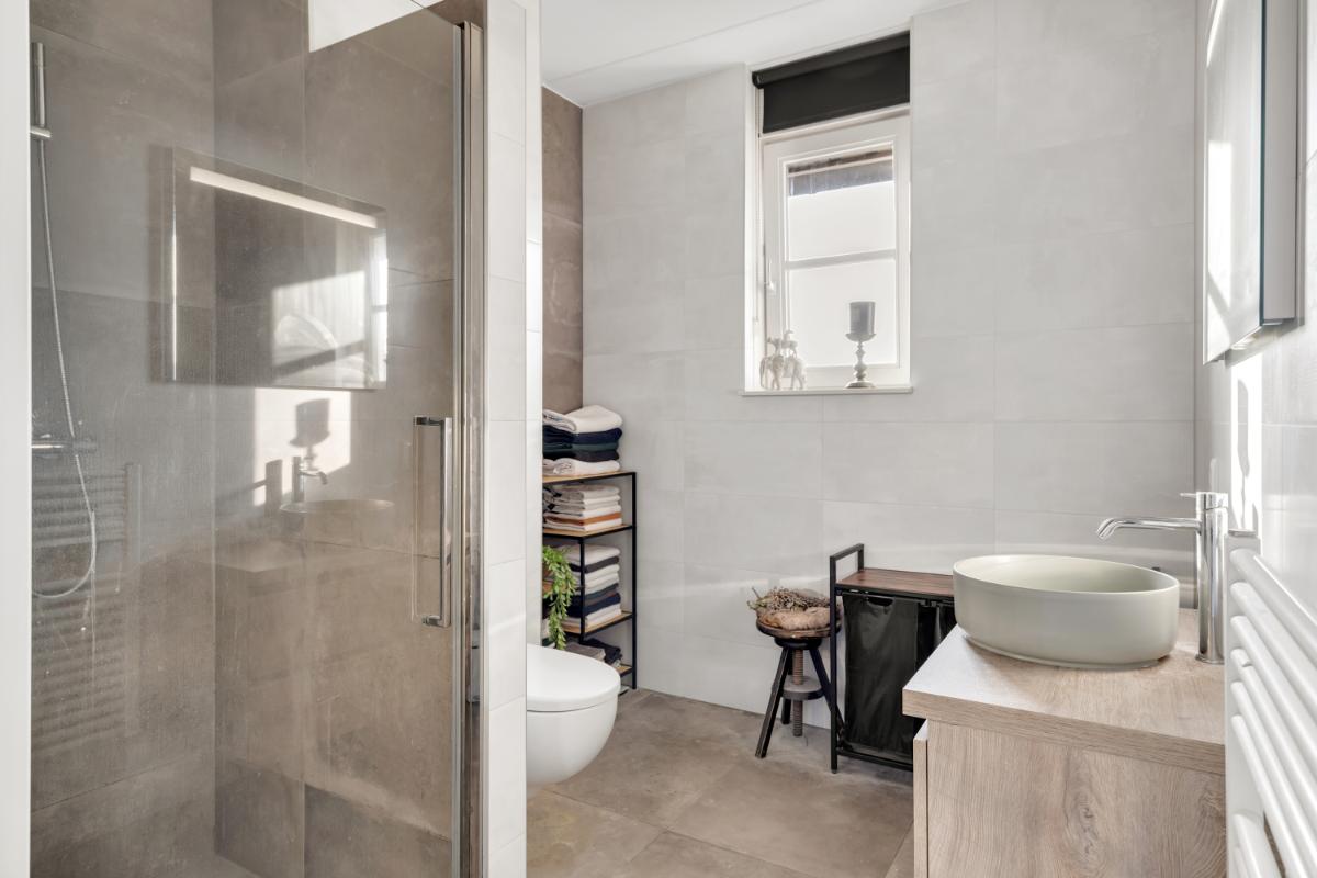 De moderne badkamer is uitgevoerd in een tijdloze stijl en beschikt over een inloopdouche, wandcloset en een wastafel met meubel. Dankzij de vloerverwarming is het hier extra comfortabel.