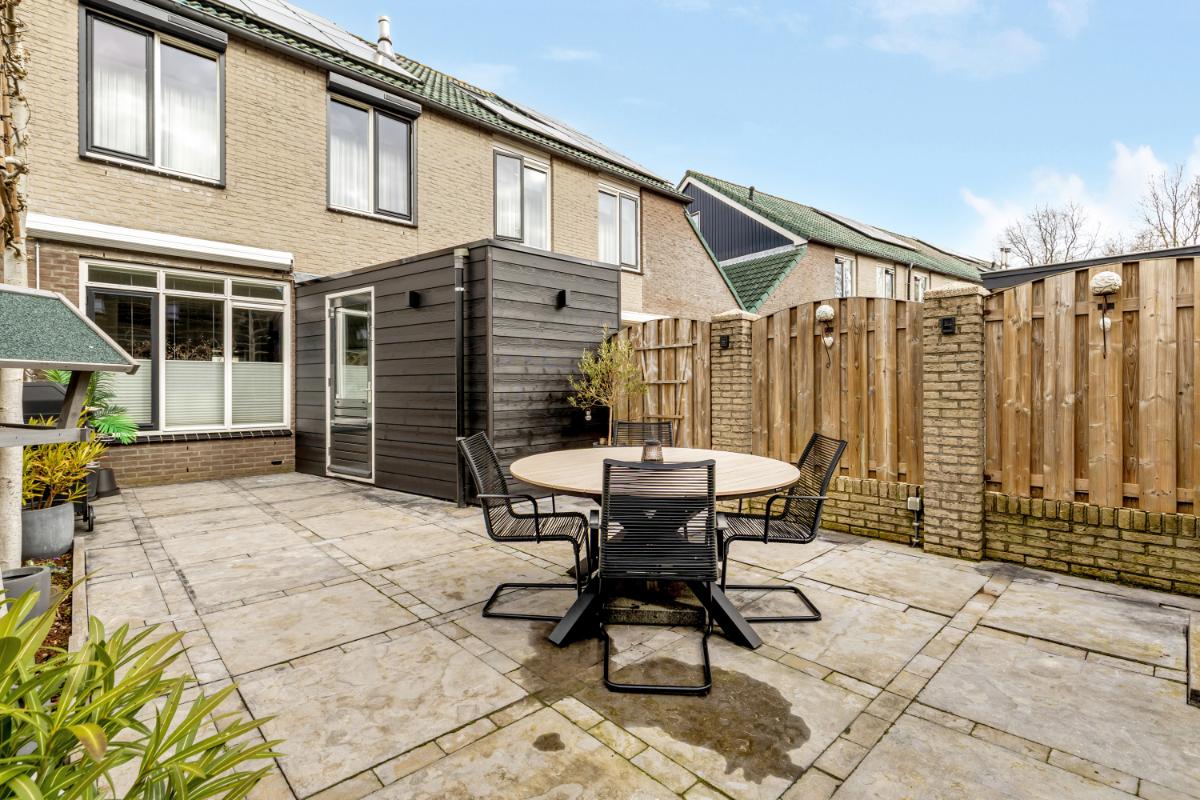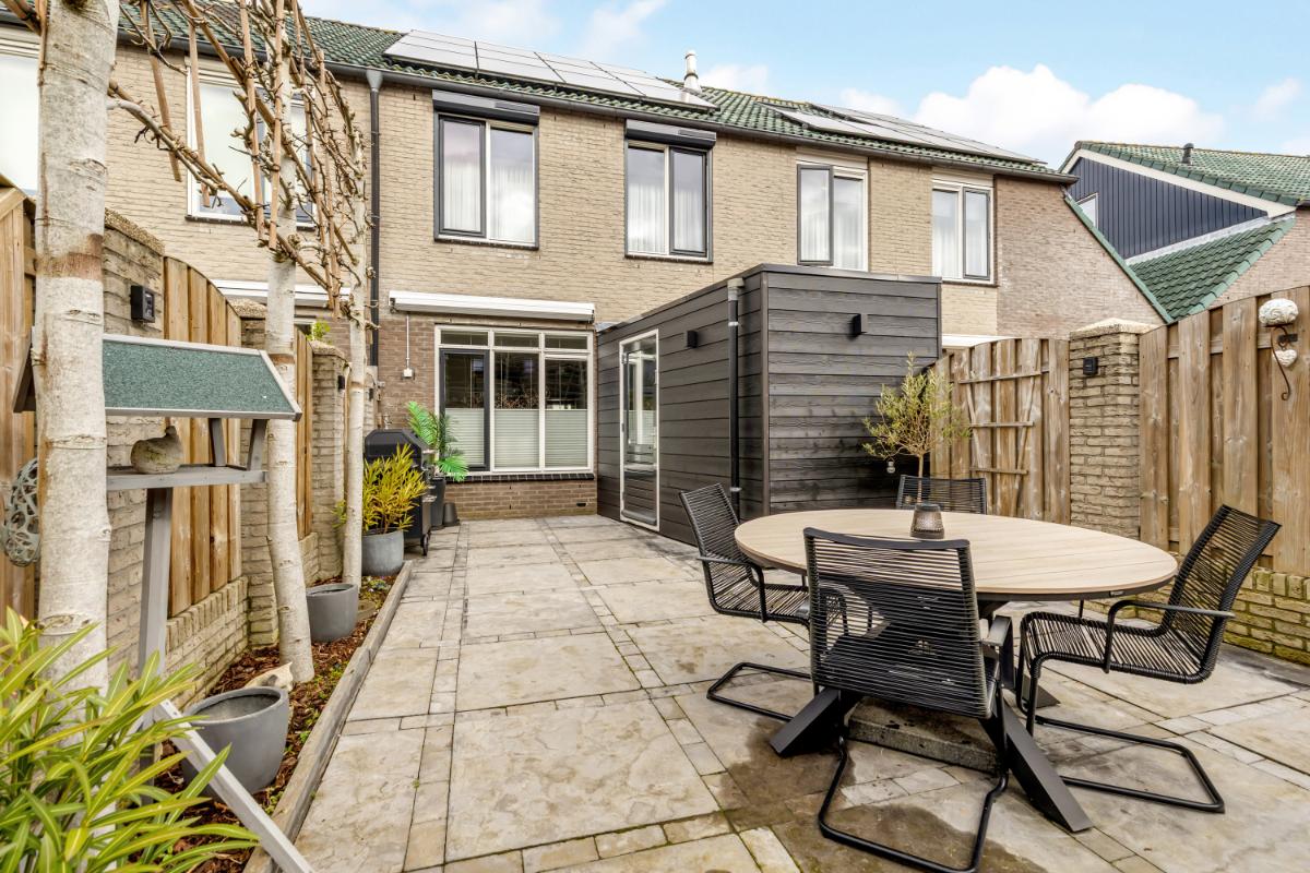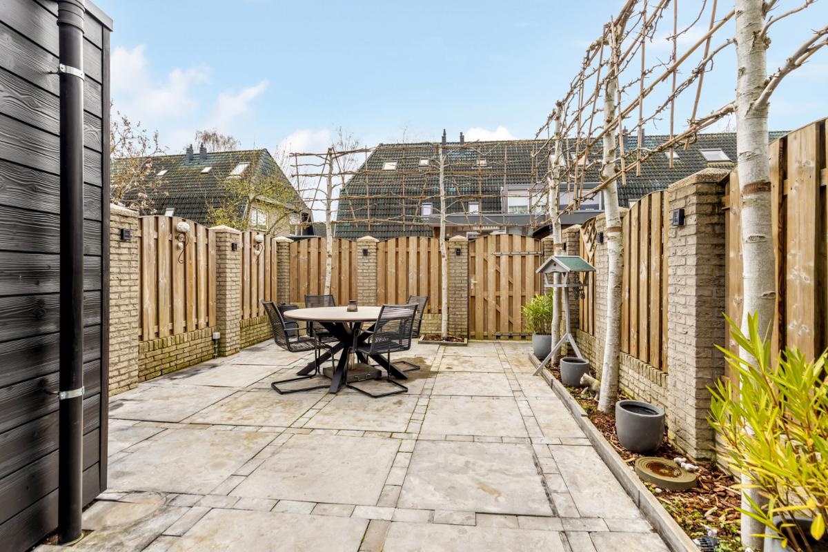 Vanuit de aangebouwde berging is de achtertuin bereikbaar. De tuin ligt gunstig op het zuiden, waardoor je op mooie dagen vrijwel de hele dag van de zon kunt genieten. De buitenruimte is verzorgd aangelegd met borders en sierbestrating. Ook een achterom is aanwezig.