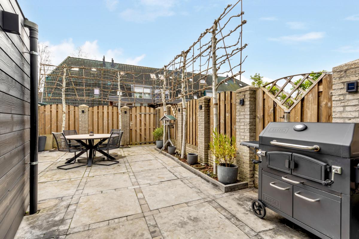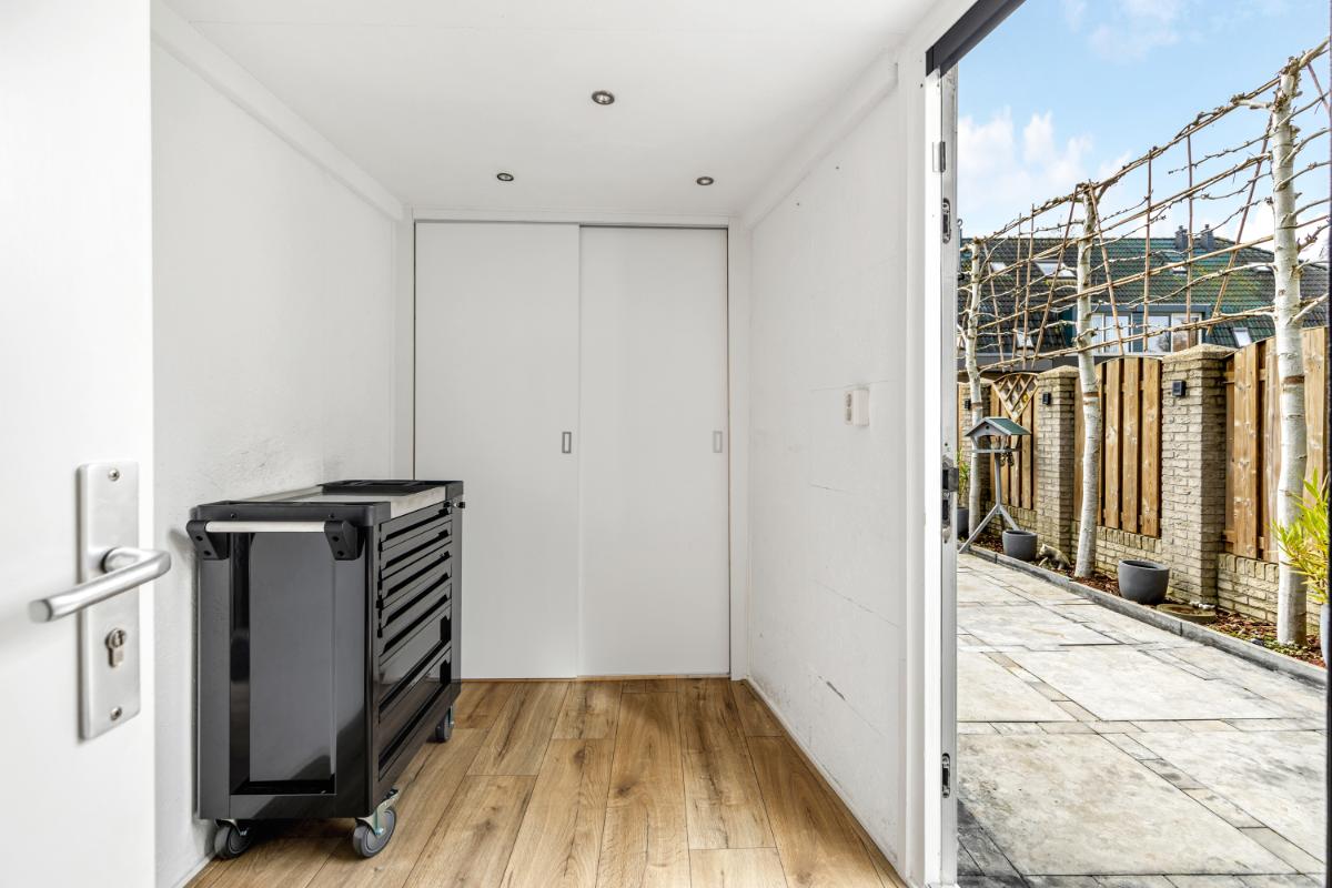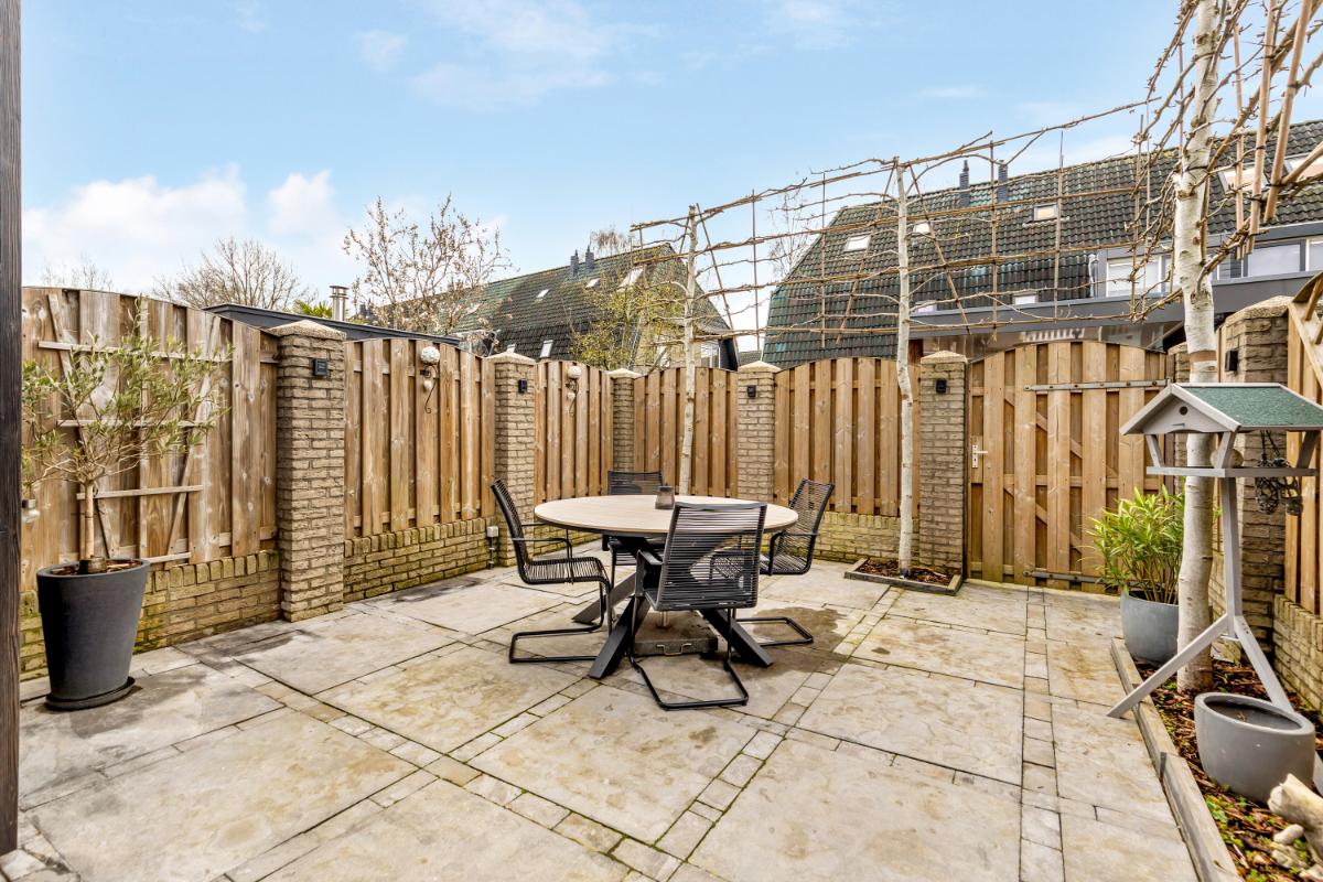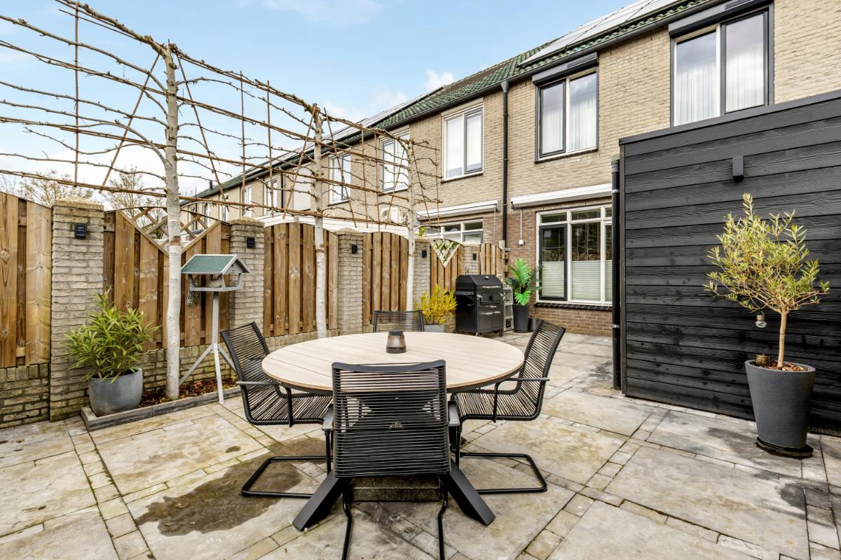 Vanuit de aangebouwde berging is de achtertuin bereikbaar. De tuin ligt gunstig op het zuiden, waardoor je op mooie dagen vrijwel de hele dag van de zon kunt genieten. De buitenruimte is verzorgd aangelegd met borders en sierbestrating. Ook een achterom is aanwezig.