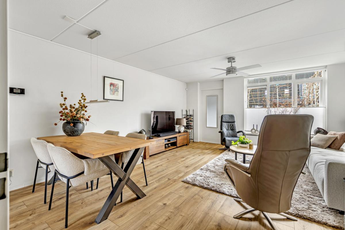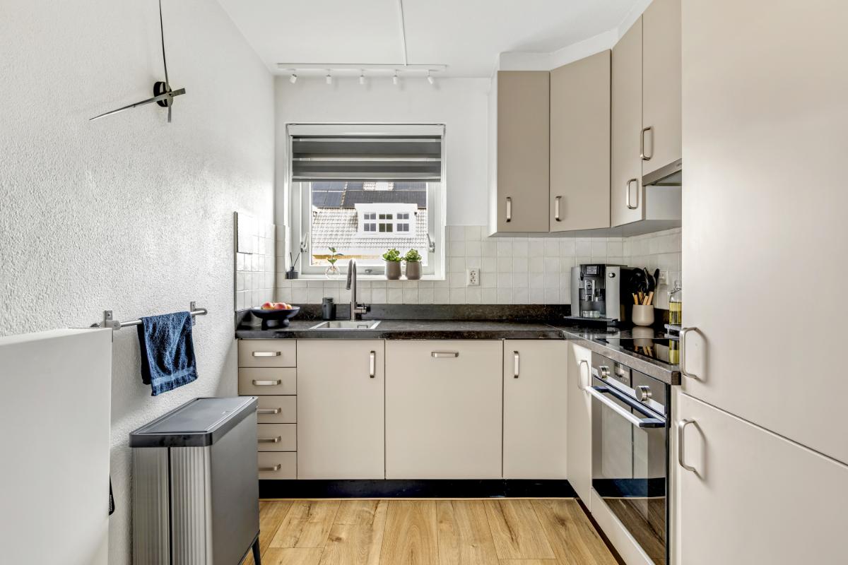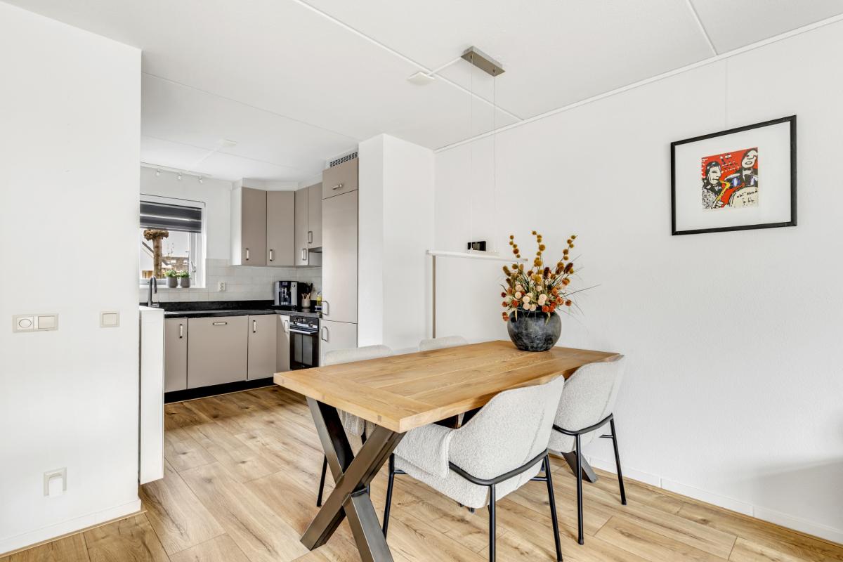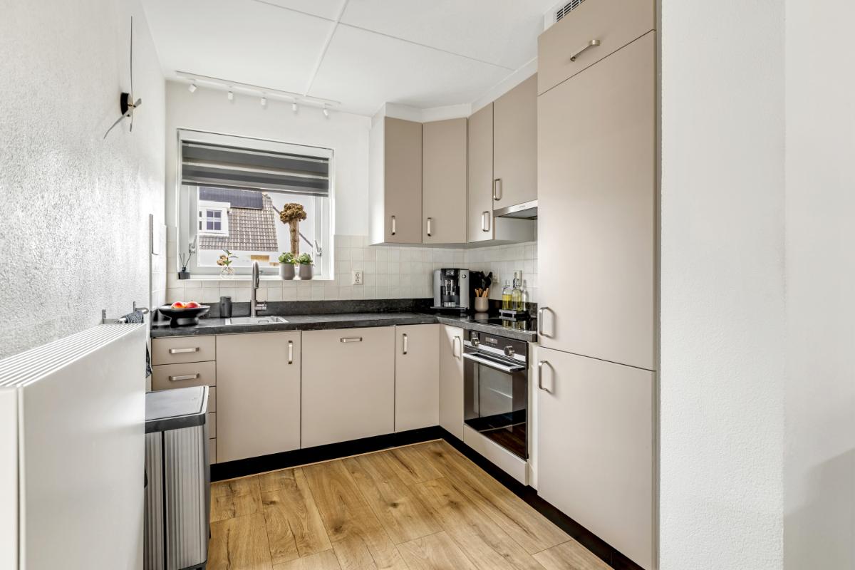 Aan de voorzijde bevindt zich de open keuken in een hoekopstelling. Deze is in 2025 deels vernieuwd en uitgevoerd met een stijlvol natuurstenen werkblad en diverse inbouwapparatuur, zoals een inductiekookplaat, oven, vaatwasser en koel/vriescombinatie.