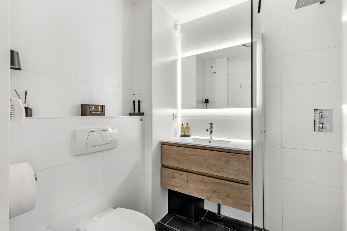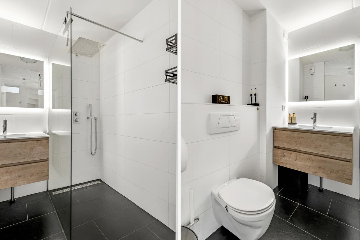 Eerste verdieping: de overloop geeft toegang tot drie slaapkamers, stuk voor stuk van een goed formaat. De gehele verdieping is voorzien van een doorgelegde laminaatvloer, wat zorgt voor een rustige en verzorgde uitstraling. De badkamer is volledig betegeld en modern uitgevoerd met een inloopdouche, toilet, wastafelmeubel met verwarmde wandspiegel en verlichting en designradiator. Een complete en comfortabele ruimte.