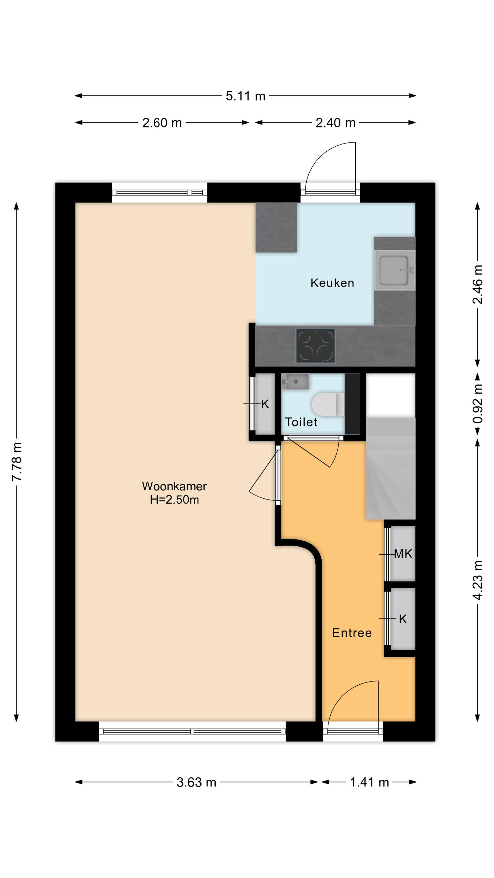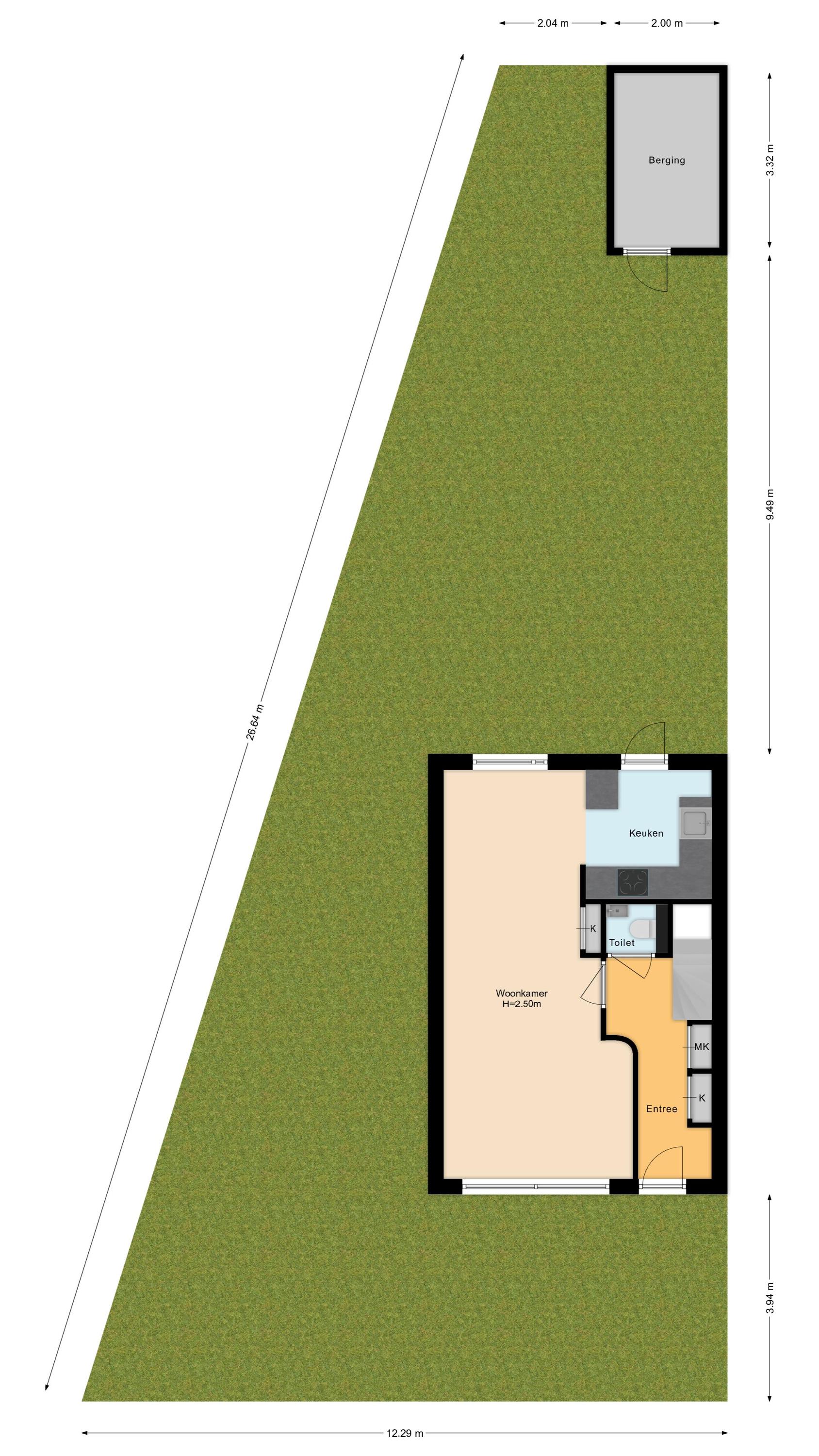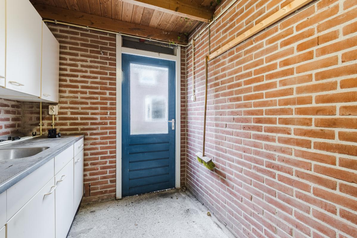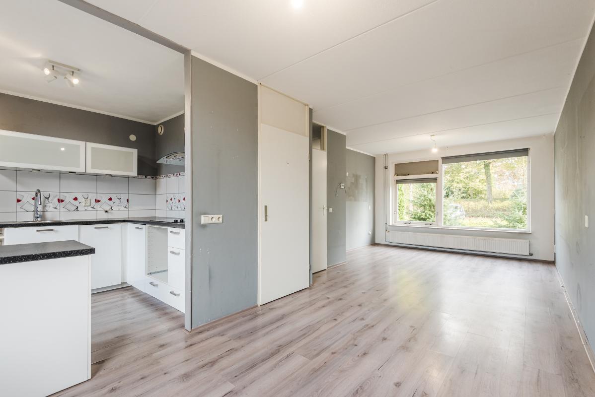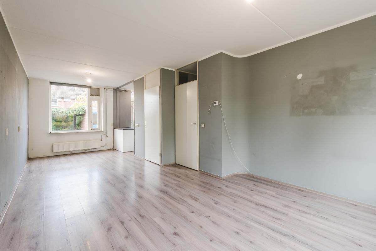 Indeling: Begane grond: entree/hal, meterkast, toiletruimte met fonteintje en de trapopgang naar de 1e verdieping. Lichte doorzon woonkamer met grote raampartijen, een vaste kast en laminaatvloer. Aan de achterzijde van de woning bevindt zich de half open eenvoudige maar ruime keuken met een eenvoudig net keukenblok (zonder apparatuur). Vanuit de keuken is de tuin te bereiken. De tuin is netjes bestraat en voorzien van gazon. Door de ruimte is er gedurende de hele dag wel een plek in de zon of juist in de schaduw te vinden. Tevens beschikt de tuin over een vrijstaande stenen berging van ca 7 m2.