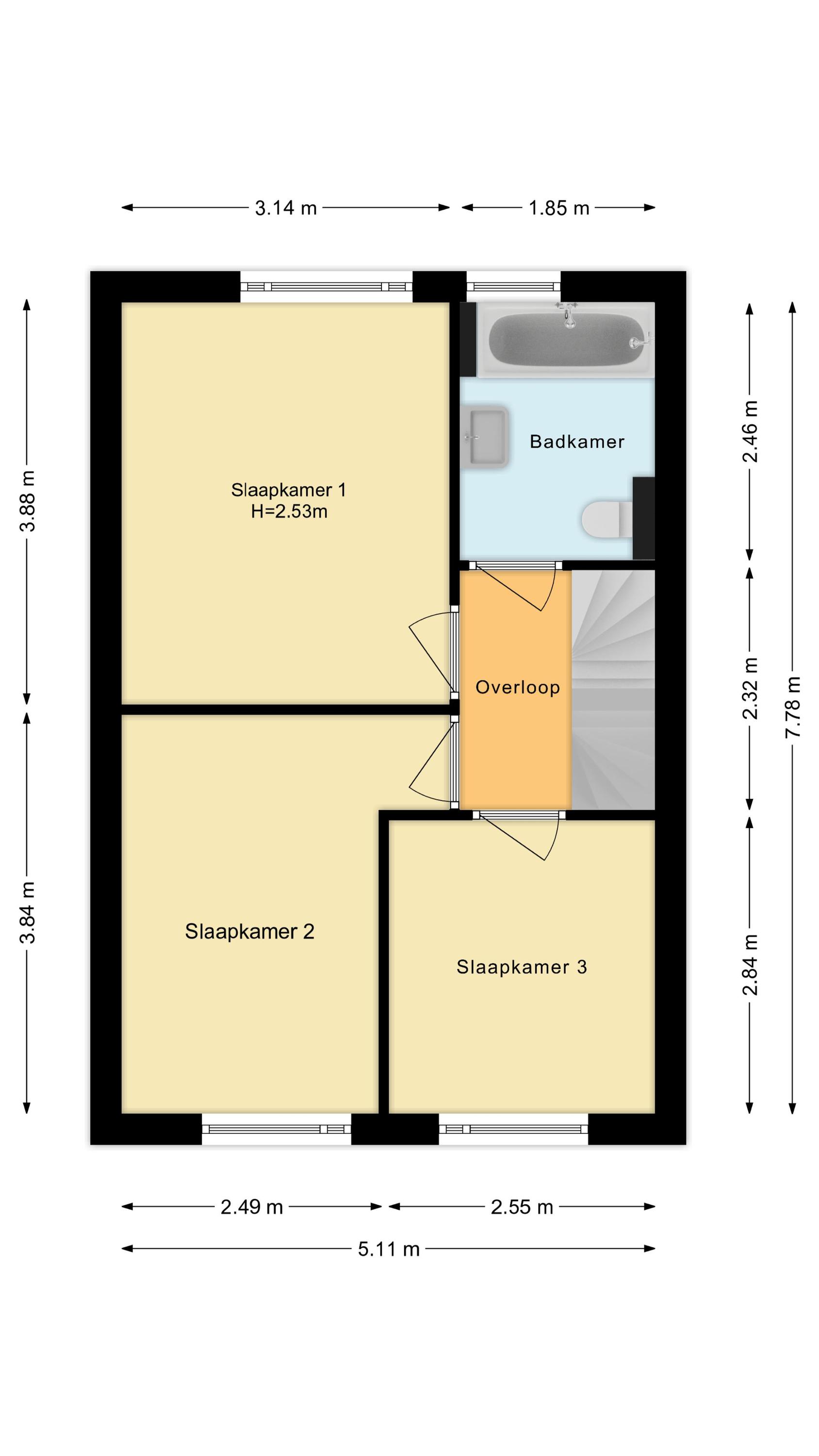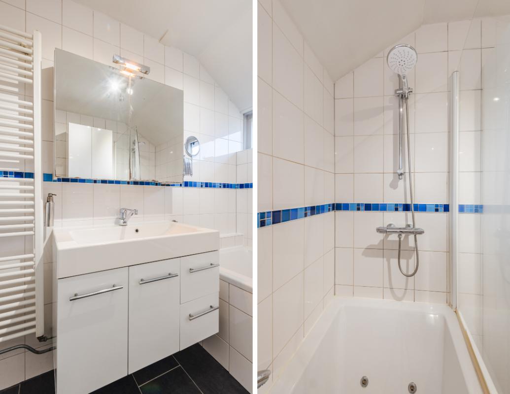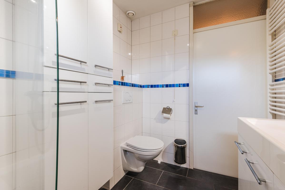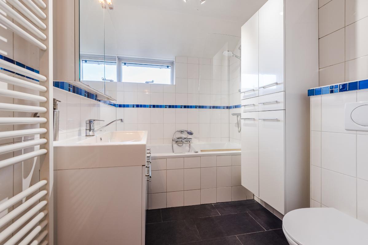 1e verdieping: Eerste verdieping: via de overloop zijn 3 slaapkamers bereikbaar, waarvan twee aan de voorzijde zijn gelegen. De badkamer is uitgerust met een ligbad met douchefaciliteit, 2e toilet, wastafelmeubel, designradiator en uitzetraampje. Op de gehele verdieping is een laminaatvloer aanwezig.