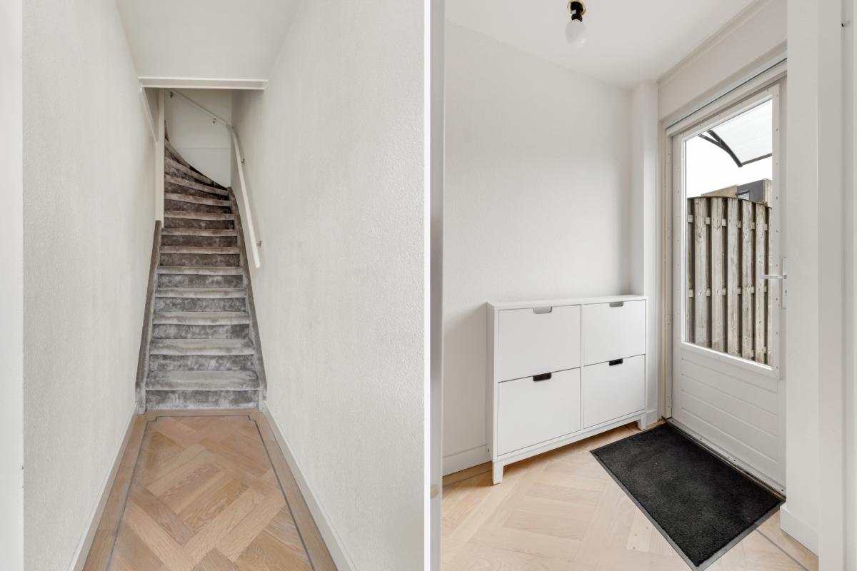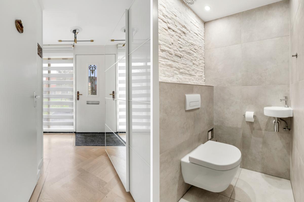 INDELING Begane grond: De ruime hal biedt toegang tot de meterkast, toiletruimte en de woonkamer. De toiletruimte is in 2019 gerenoveerd en is voorzien van stijlvol tegelwerk, wandcloset en een fonteintje.
