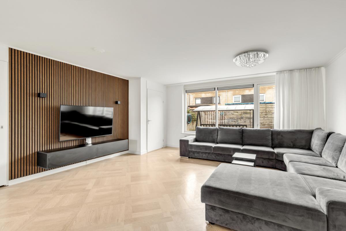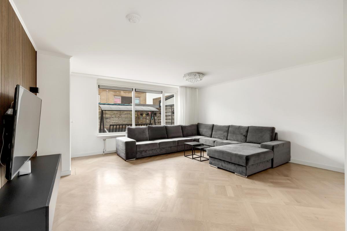 De royale, tuingerichte woonkamer is lekker licht door de grote raampartijen en biedt meer dan voldoende ruimte voor een lekkere bank! Via de tussenhal bereik je de trapopgang met trapkast en de zonnige achtertuin.