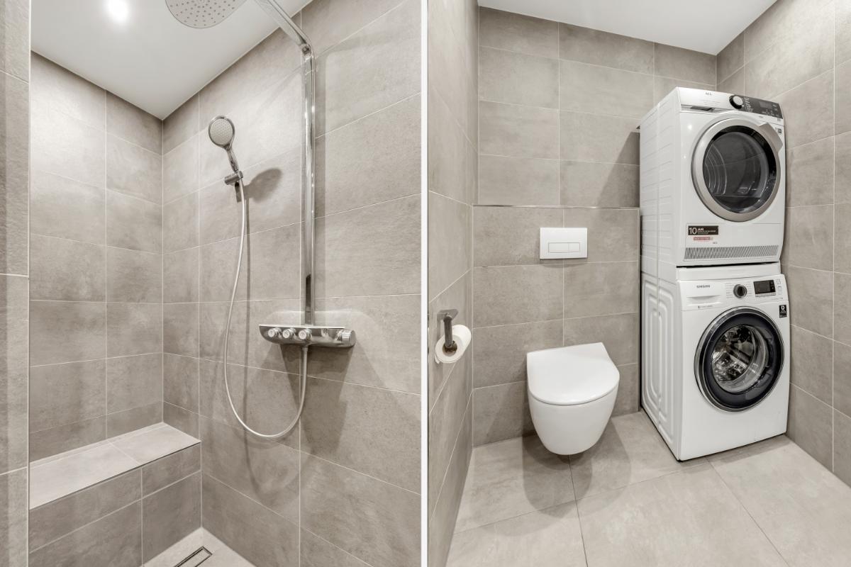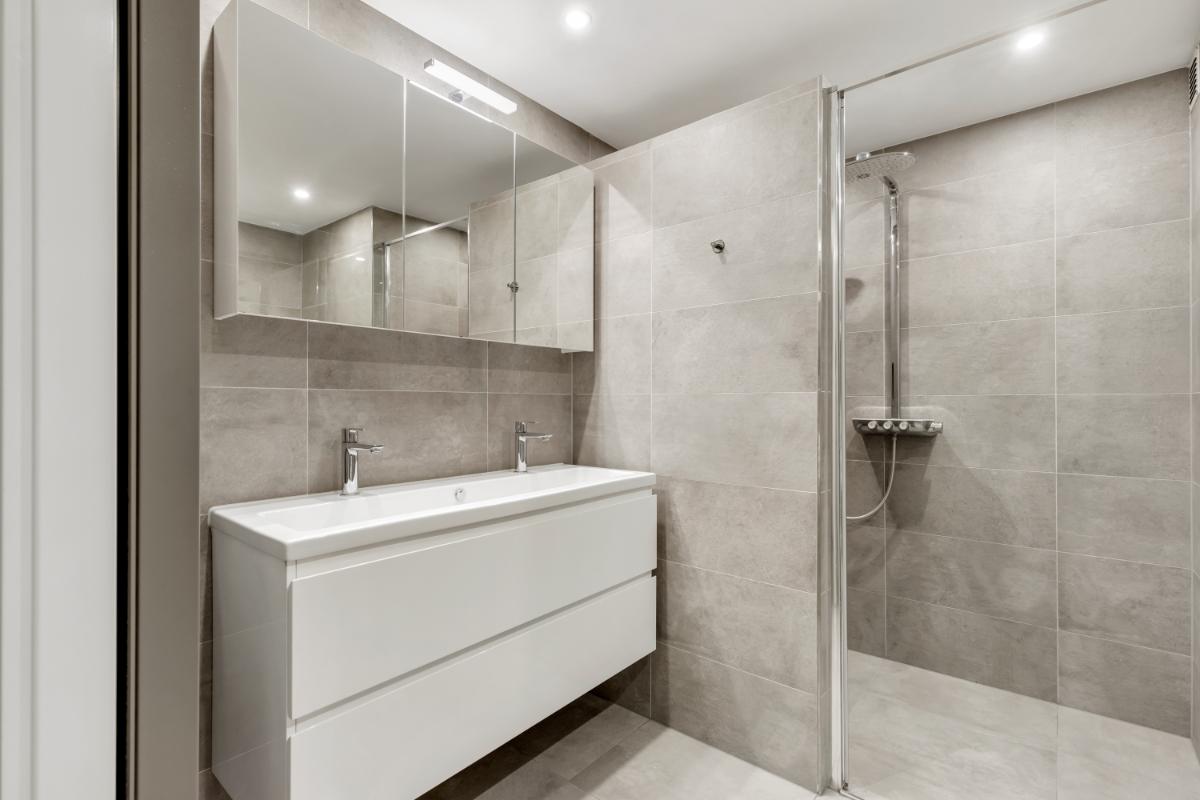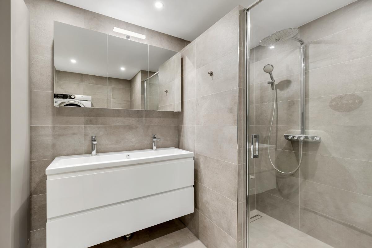 De luxe badkamer (2021) is afgewerkt met fraai tegelwerk en uitgerust met een ruime inloopdouche met regen- en handdouche, een dubbele wastafel met meubel, een wandcloset en de wasmachineaansluitingen.
