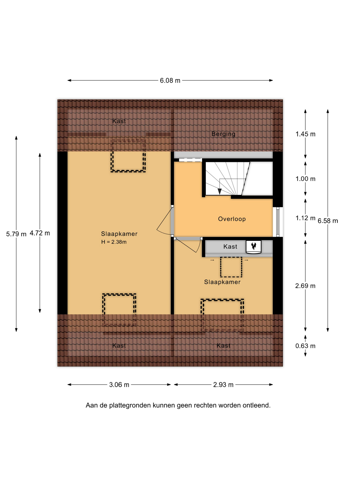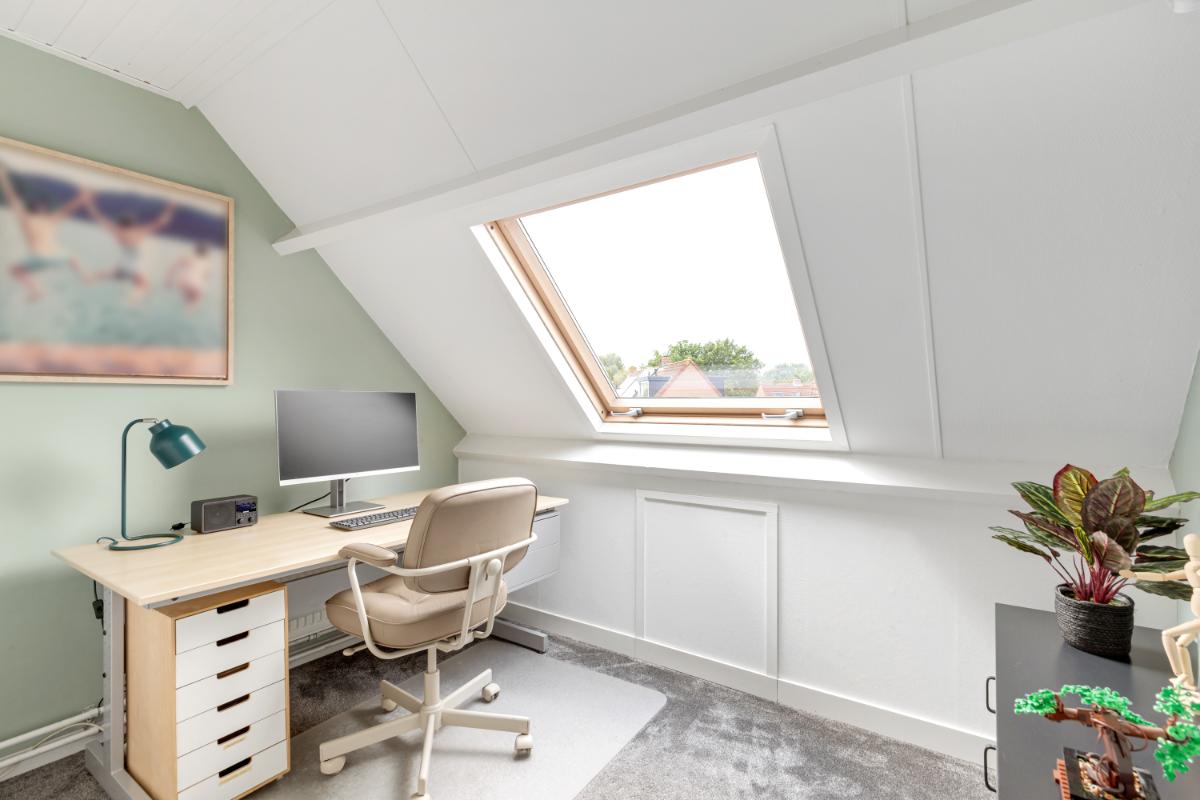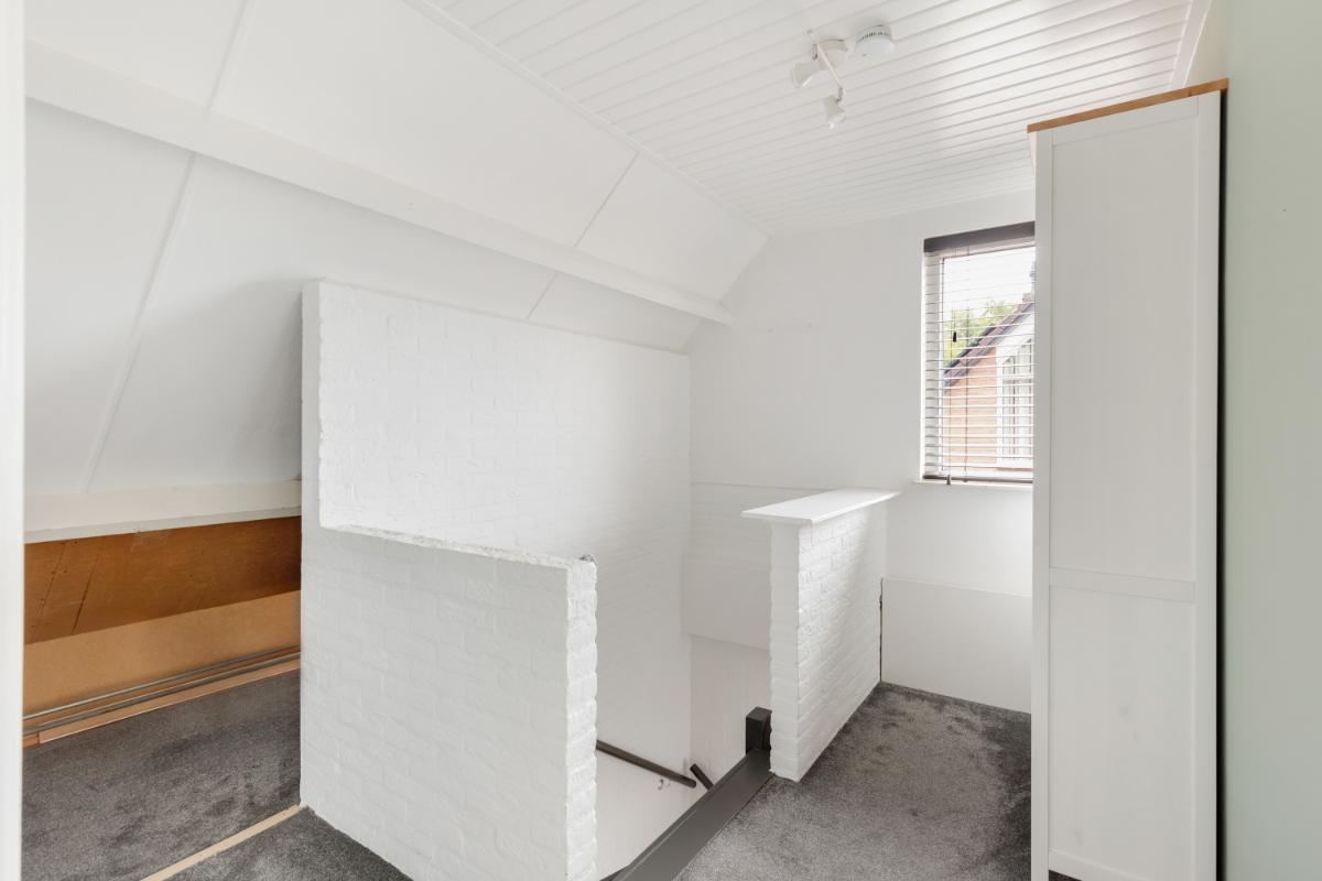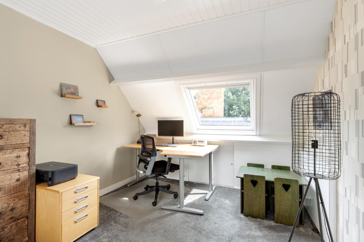 2e verdieping: de tweede verdieping is verrassend ruim en licht. Hier bevinden zich nog een een ruime slaapkamer en een werkkamer, beide voorzien van Velux dakramen. Daarnaast is er veel bergruimte aanwezig achter de schuine kanten. De werkkamer beschikt over een vaste kast, waar de Cv-ketel in is gesitueerd en ook tref je hier een luik in het plafond die toegang geeft tot de vliering. Via de overloop zijn beide kamers bereikbaar. Vliering: de vliering boven de werkkamer biedt nog wat extra bergruimte.