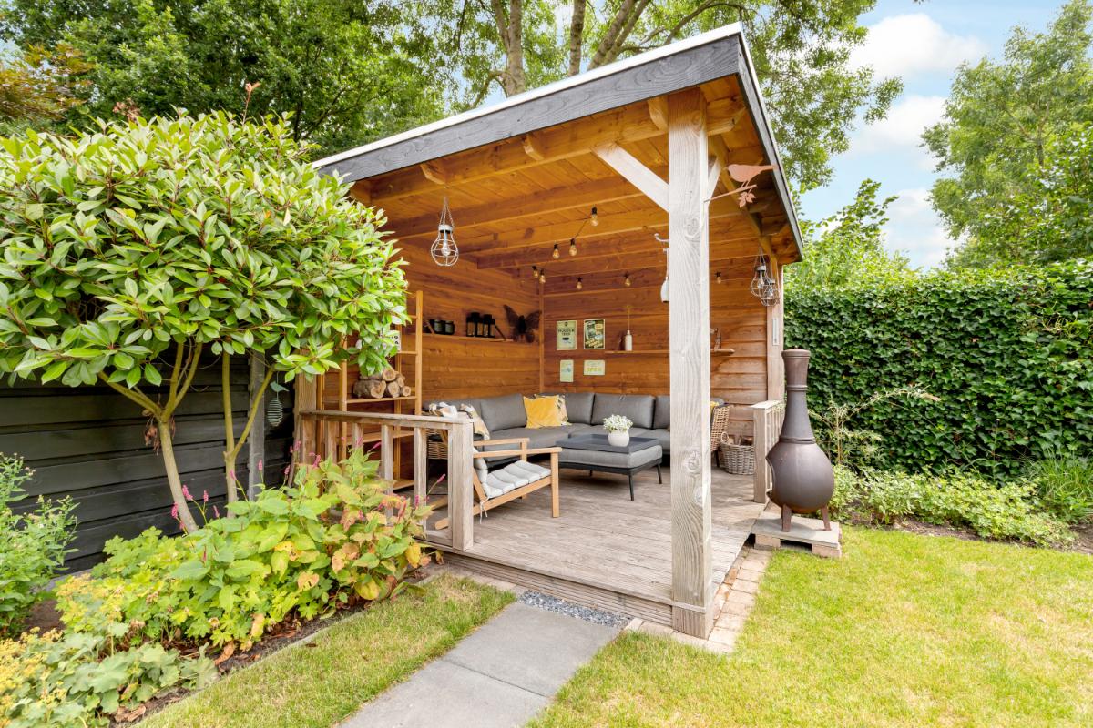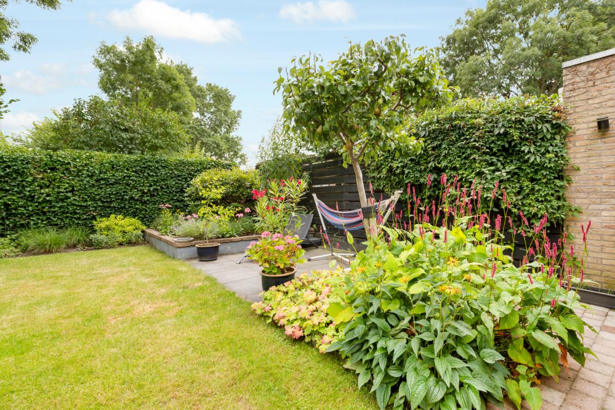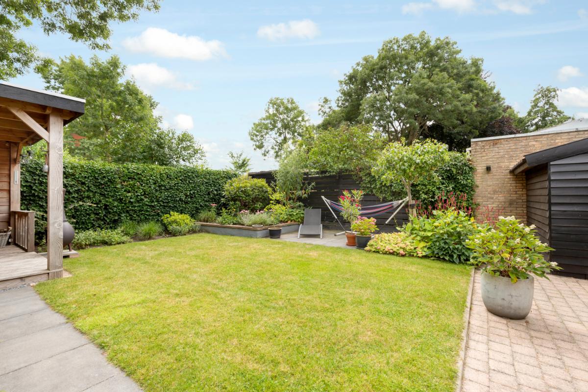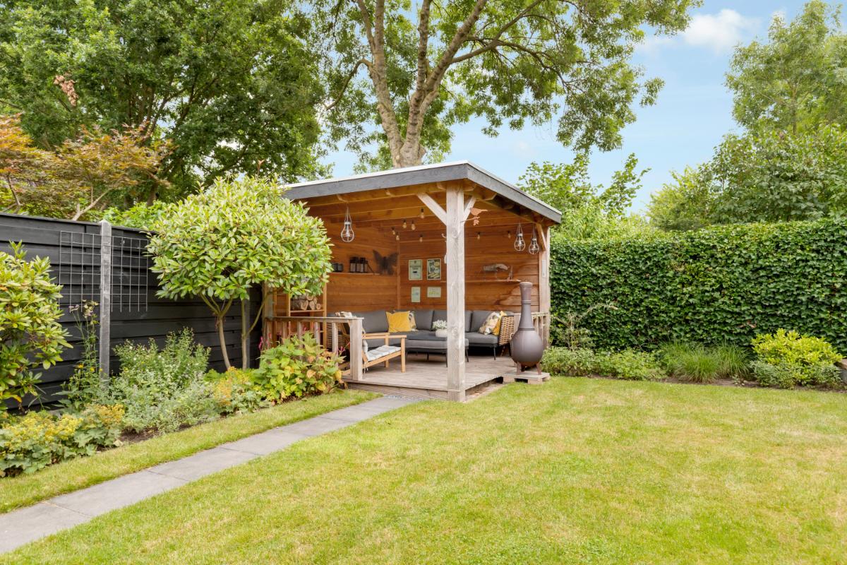 De achtertuin is een heerlijke plek om te ontspannen en te genieten van de zon. Gelegen op het zuidoosten, profiteer je hier van veel zonuren. De tuin is groen ingericht met een combinatie van groene borders, een net gazon en strakke terrassen, wat zorgt voor een frisse, natuurlijke uitstraling. Helemaal achterin vind je een sfeervolle veranda. Dé plek om lange avonden door te brengen, beschut en toch buiten. Daarnaast is er nog een houten berging aanwezig.