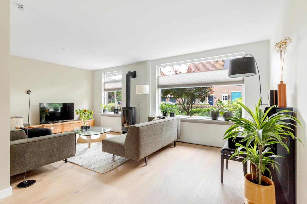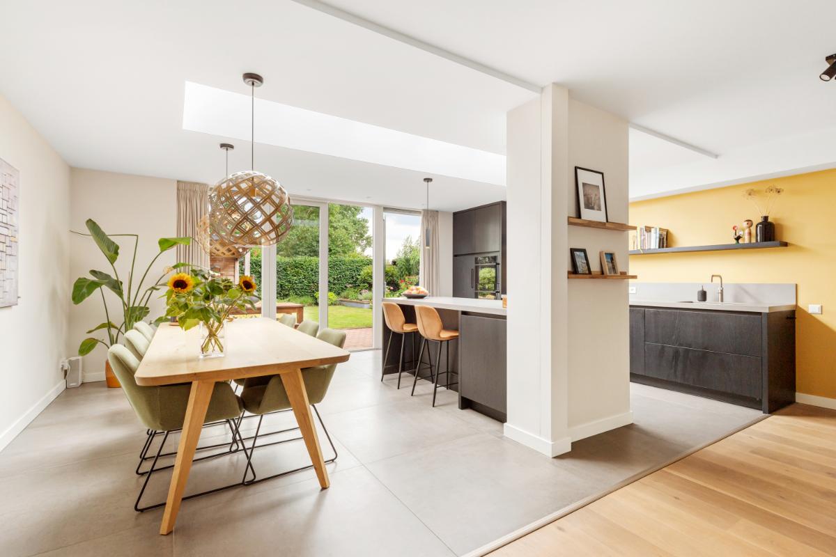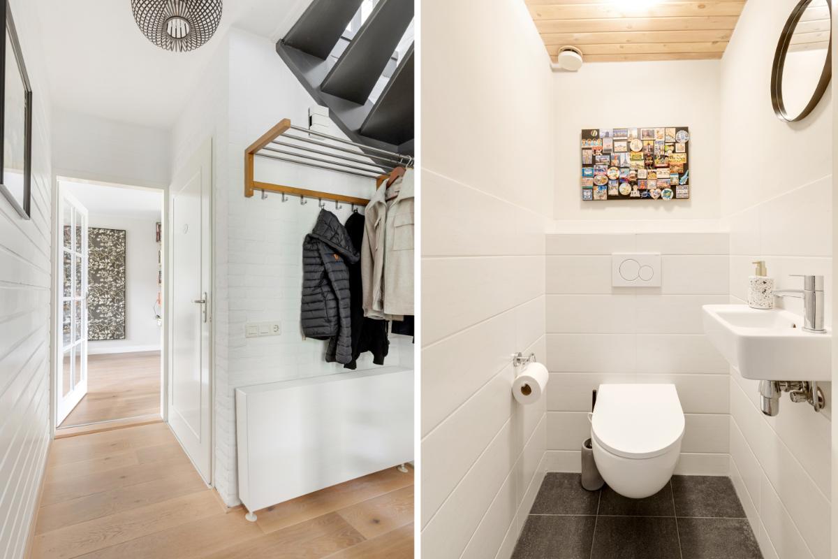 INDELING Begane grond: bij aankomst parkeer je gemakkelijk op eigen terrein en stap je via de overkapte voordeur binnen in een ruime, lichte hal. Hier vind je het moderne toilet met fonteintje en de trapopgang naar de eerste verdieping. De hal geeft toegang tot de woonkamer, waardoor je meteen een voorproefje krijgt van wat deze woning te bieden heeft. Bij binnenkomst valt direct de ruimte en het licht op. De woning is in 2022 fors uitgebouwd en stijlvol gemoderniseerd, waardoor een prachtige leefruimte is ontstaan. De royale woonkamer biedt plek voor een grote zithoek en is afgewerkt met strakke wanden en een eikenhoutenvloer, en is voorzien van vloerisolatie (2023).