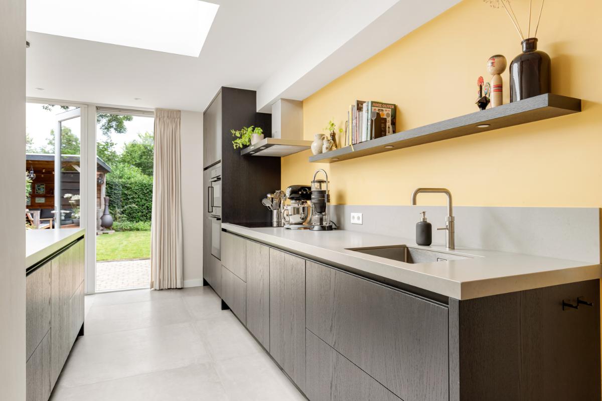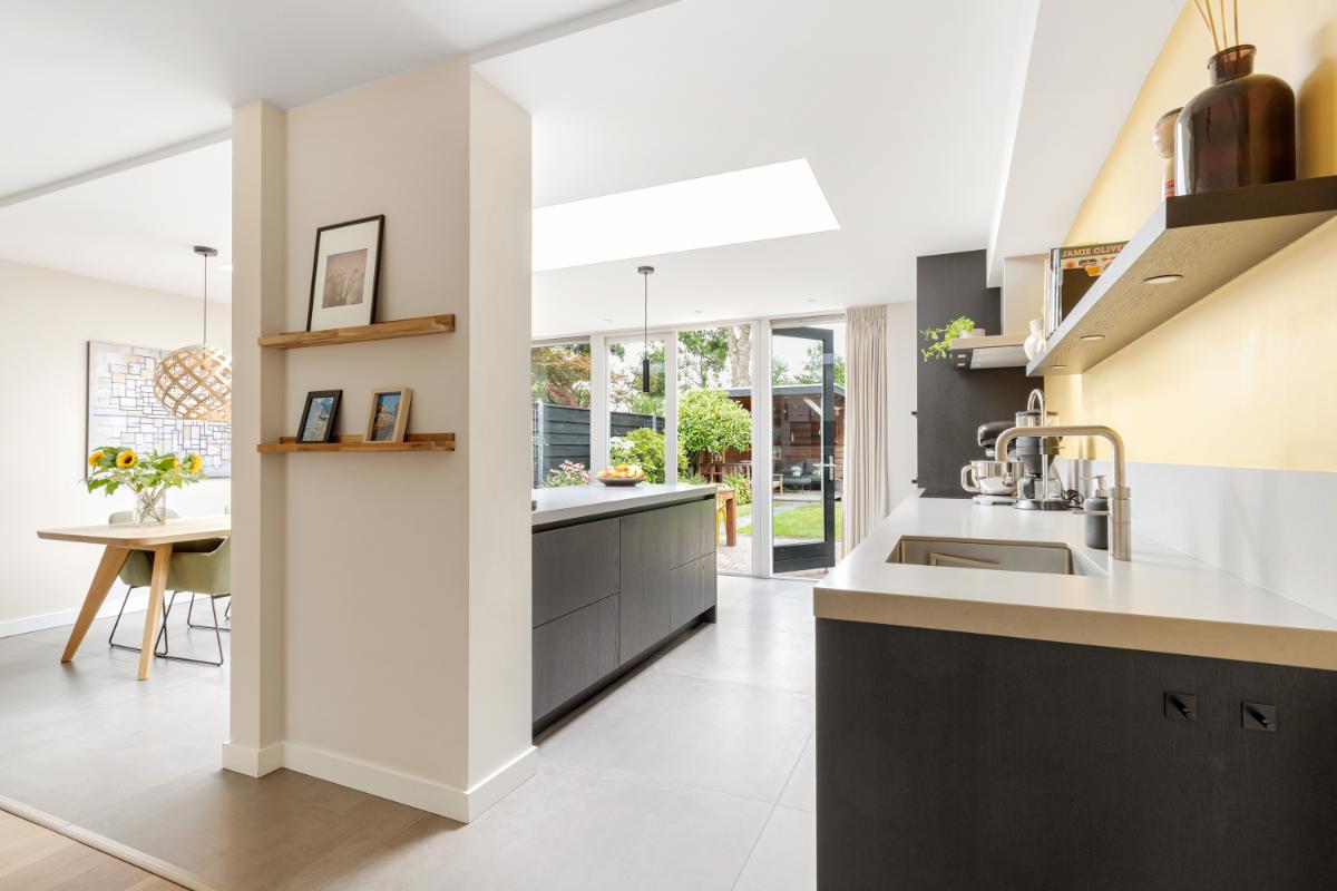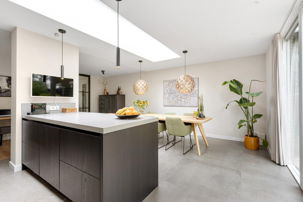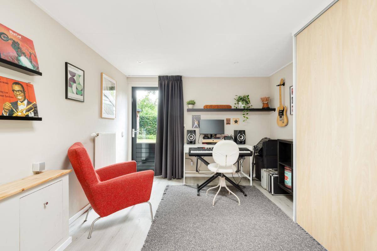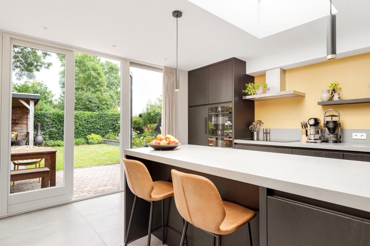 De luxe woonkeuken met eiland is een echte eyecatcher. Deze keuken (2022), uitgevoerd met diverse kasten en lades is uitgerust met hoogwaardige inbouwapparatuur: een oven, magnetron, koelkast, vriezer, vaatwasmachine, inductiekookplaat en een Quooker, ideaal voor de kookliefhebber. De woonkeuken met luxe tegelvloer inclusief vloerverwarming is via een moderne stalen schuifdeur verbonden met de woonkamer. De aanwezige lichtstraat maakt de ruimte heerlijk licht en dankzij de openslaande deuren geniet je hier van een fijne verbinding met de tuin. De voormalige garage is omgetoverd tot een veelzijdige ruimte: deels een fijne studio, ideaal als speelkamer of thuiswerkplek, en deels een praktische berging, met meterkast en aansluitingen voor de wasmachine en droger.
