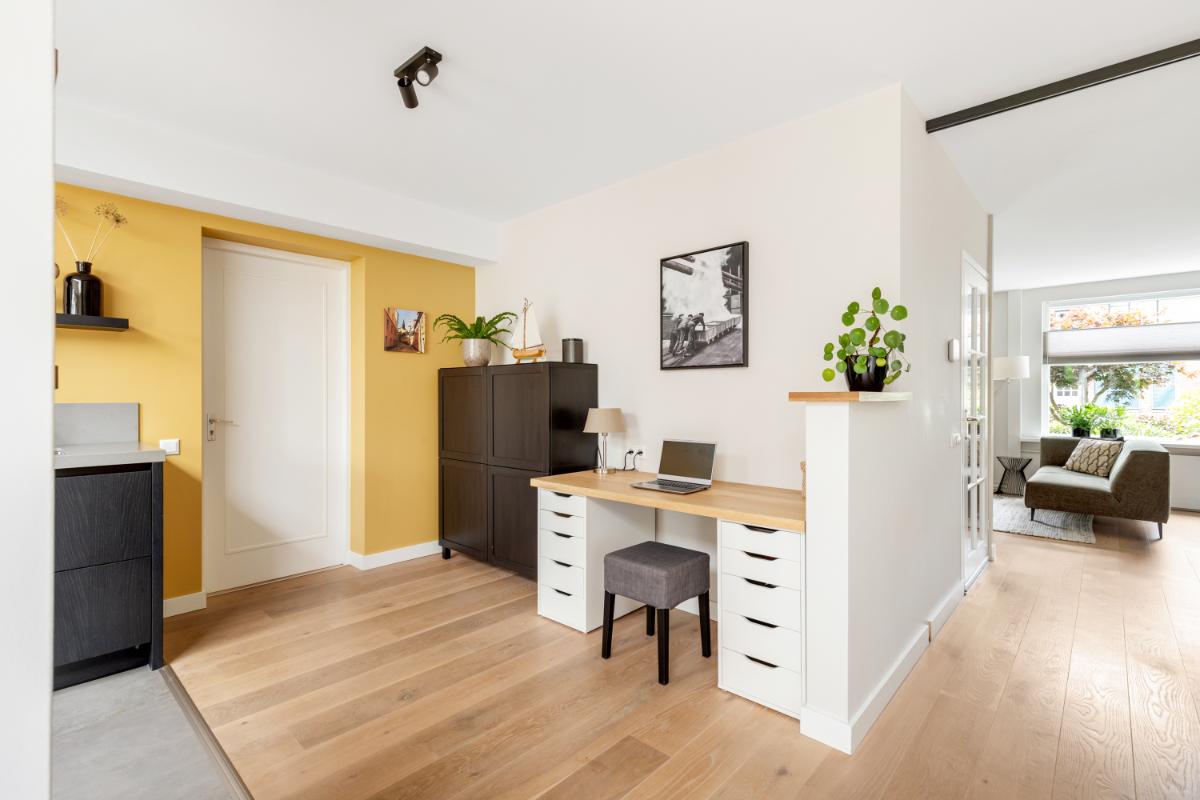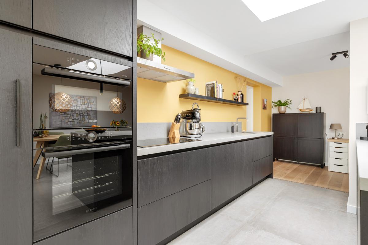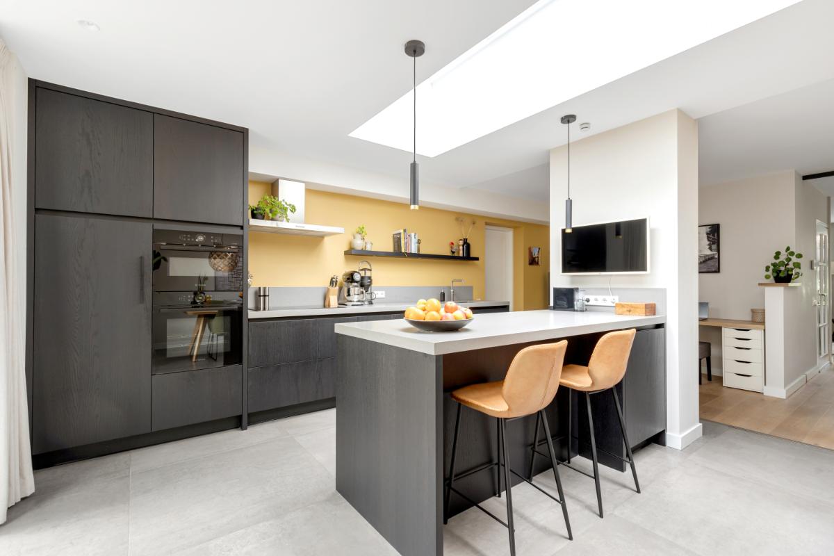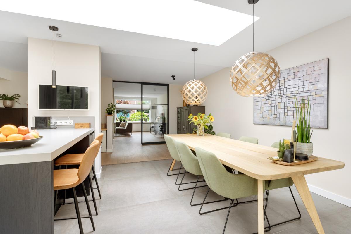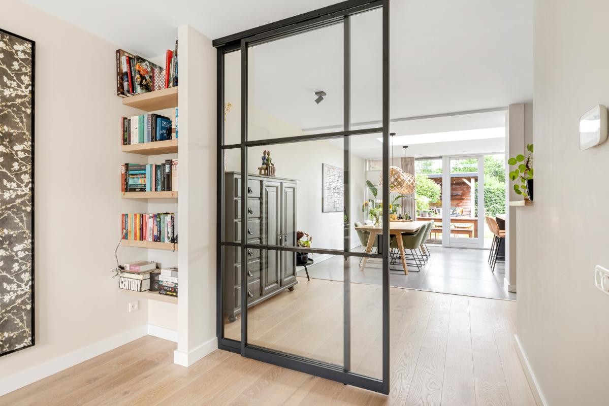 De luxe woonkeuken met eiland is een echte eyecatcher. Deze keuken (2022), uitgevoerd met diverse kasten en lades is uitgerust met hoogwaardige inbouwapparatuur: een oven, magnetron, koelkast, vriezer, vaatwasmachine, inductiekookplaat en een Quooker, ideaal voor de kookliefhebber. De woonkeuken met luxe tegelvloer inclusief vloerverwarming is via een moderne stalen schuifdeur verbonden met de woonkamer. De aanwezige lichtstraat maakt de ruimte heerlijk licht en dankzij de openslaande deuren geniet je hier van een fijne verbinding met de tuin. De voormalige garage is omgetoverd tot een veelzijdige ruimte: deels een fijne studio, ideaal als speelkamer of thuiswerkplek, en deels een praktische berging, met meterkast en aansluitingen voor de wasmachine en droger.
