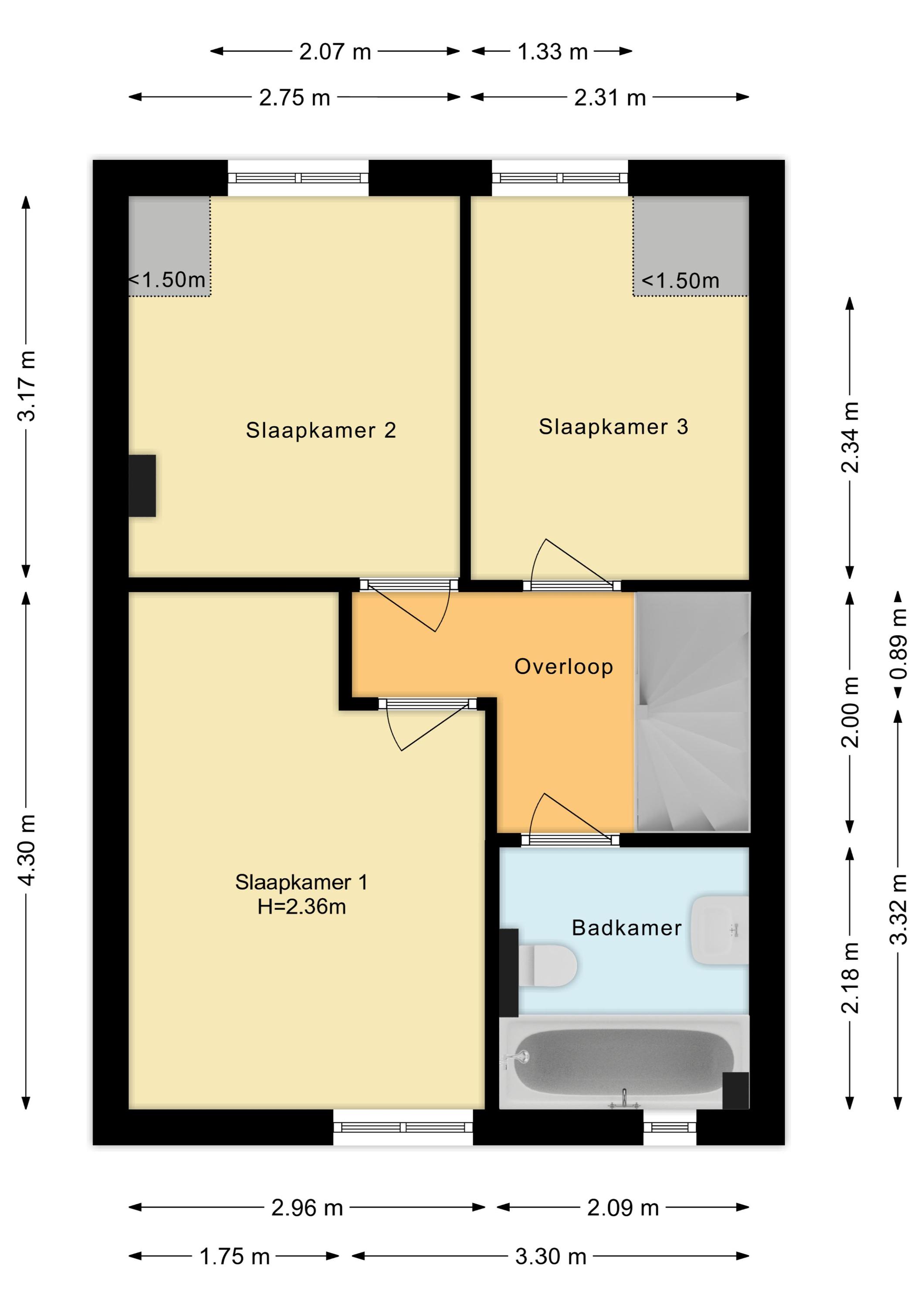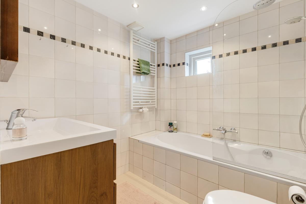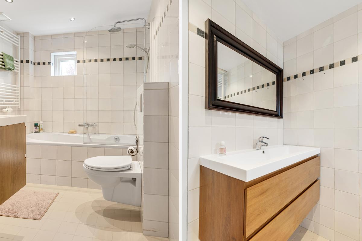 Eerste verdieping: de overloop geeft toegang tot drie slaapkamers en de badkamer. De ouderslaapkamer aan de voorzijde is netjes afgewerkt en biedt voldoende ruimte voor een comfortabel slaapvertrek. Aan de achterzijde bevinden zich twee slaapkamers, beide voorzien van een dakkapel, wat zorgt voor extra ruimte en licht. De badkamer is compleet uitgevoerd met een ligbad met douche, wastafelmeubel en designradiator. Het aanwezige raam zorgt bovendien voor een prettige lichtinval en natuurlijke ventilatie.