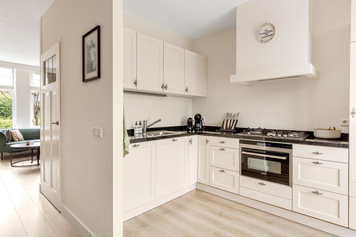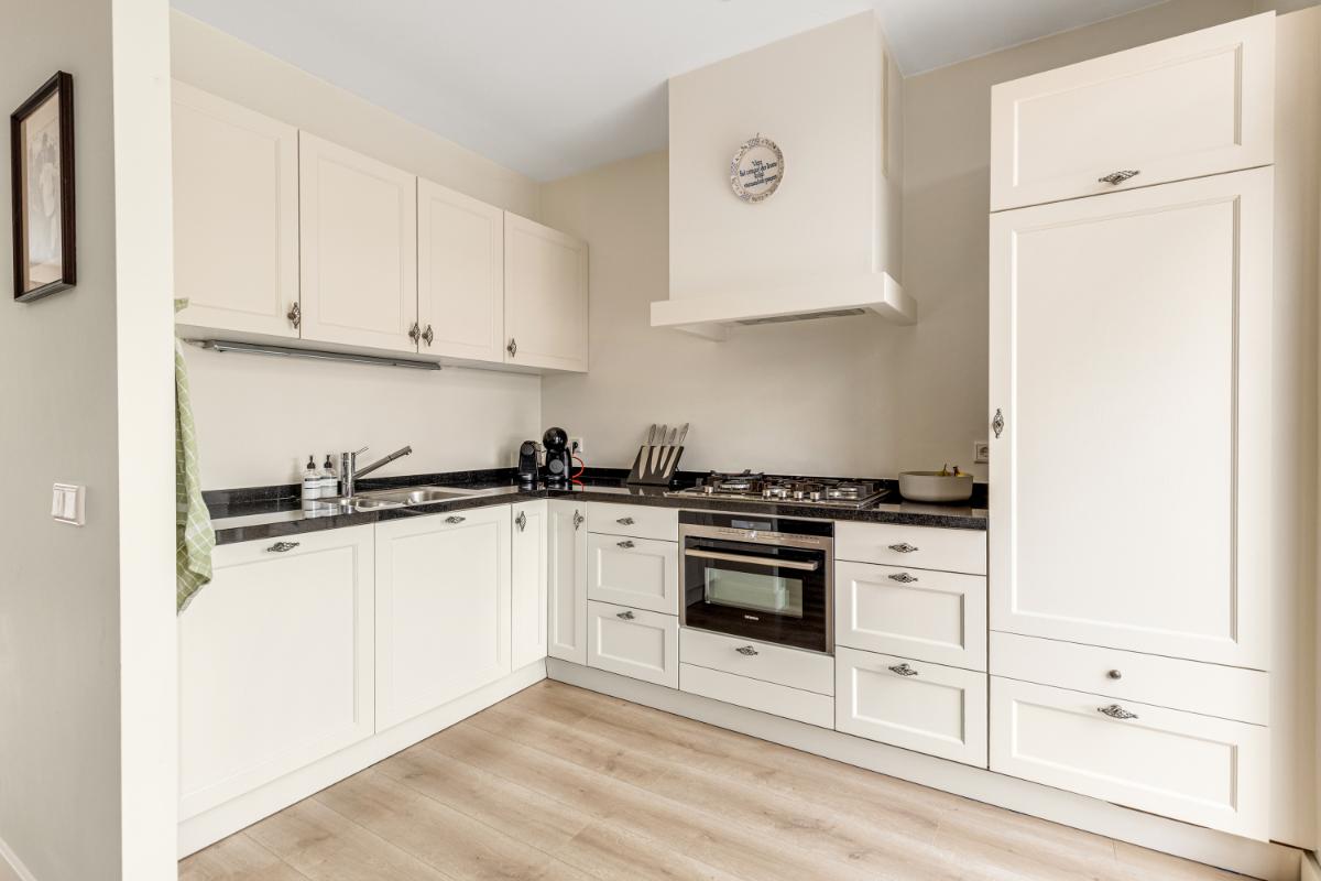 Aan de achterzijde bevindt zich de moderne keuken in hoekopstelling, voorzien van een granieten werkblad en diverse inbouwapparatuur zoals een 5-pits gasfornuis, combi-oven, koelkast, afzuigkap en een recent vernieuwde vaatwasser. Vanuit de keuken heb je direct toegang tot de tuin.
