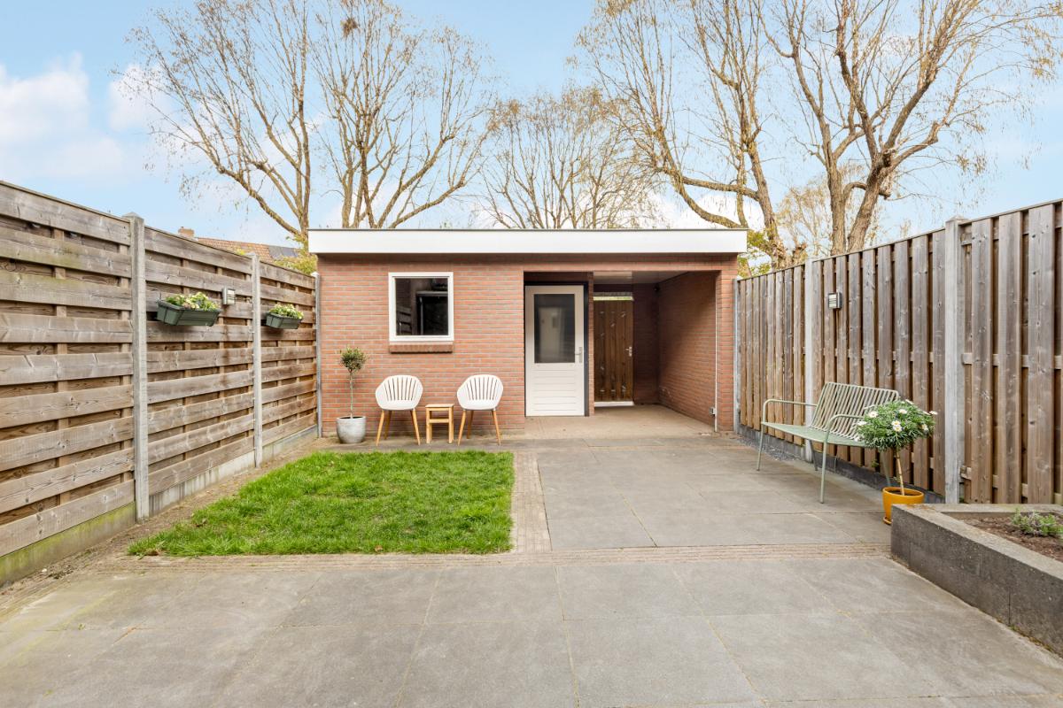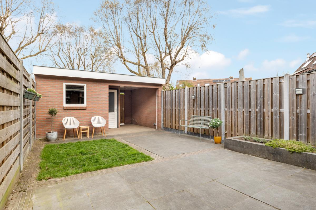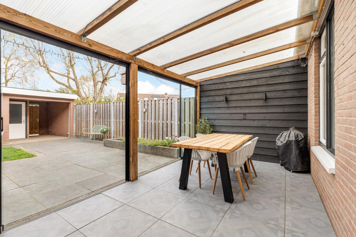De achtertuin is onderhoudsvriendelijk aangelegd met sierbestrating en groene borders. Onder de luxe overkapping, voorzien van glaswanden, zit je hier al vroeg in het voorjaar heerlijk beschut. Daarnaast beschikt de tuin over een stenen berging en een praktische achterom.