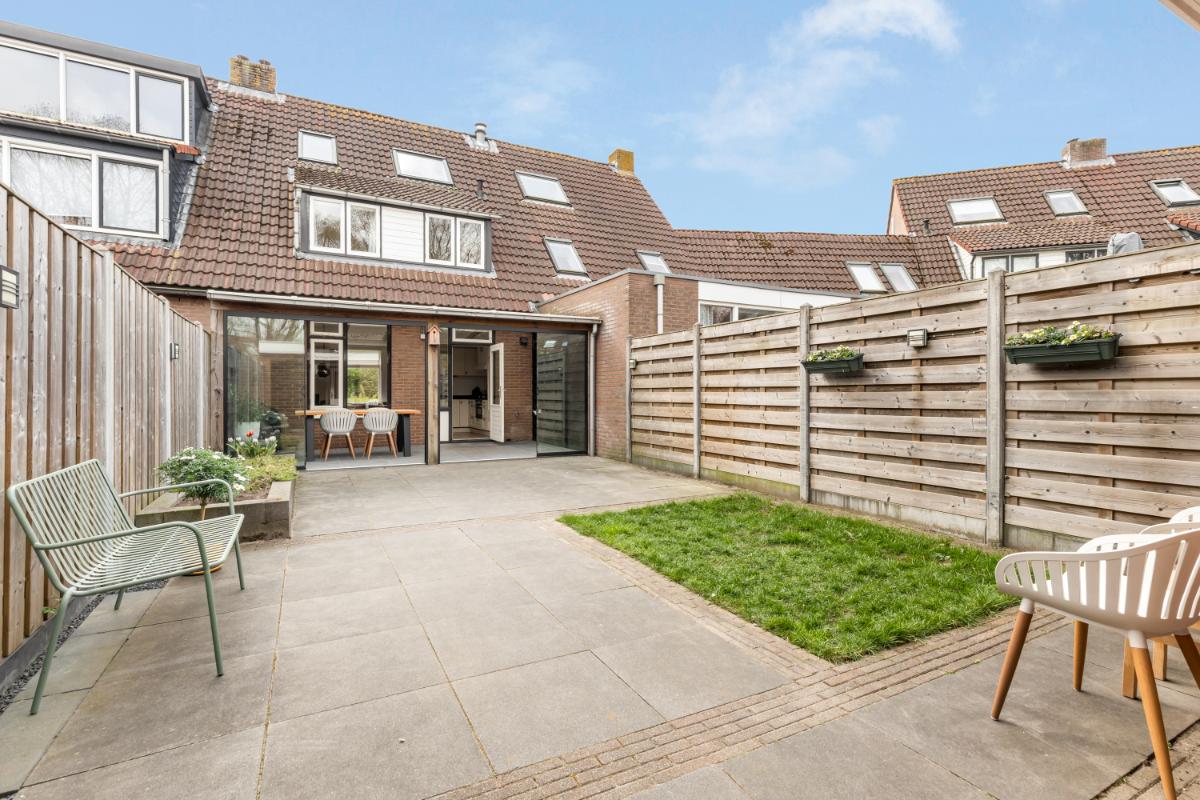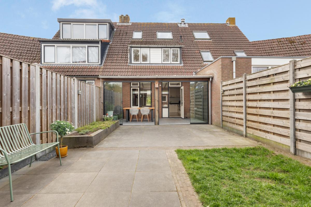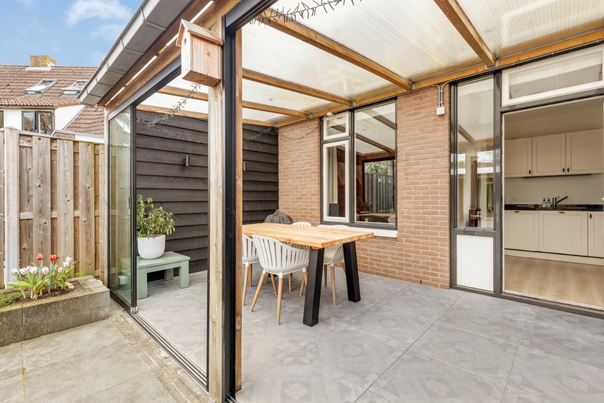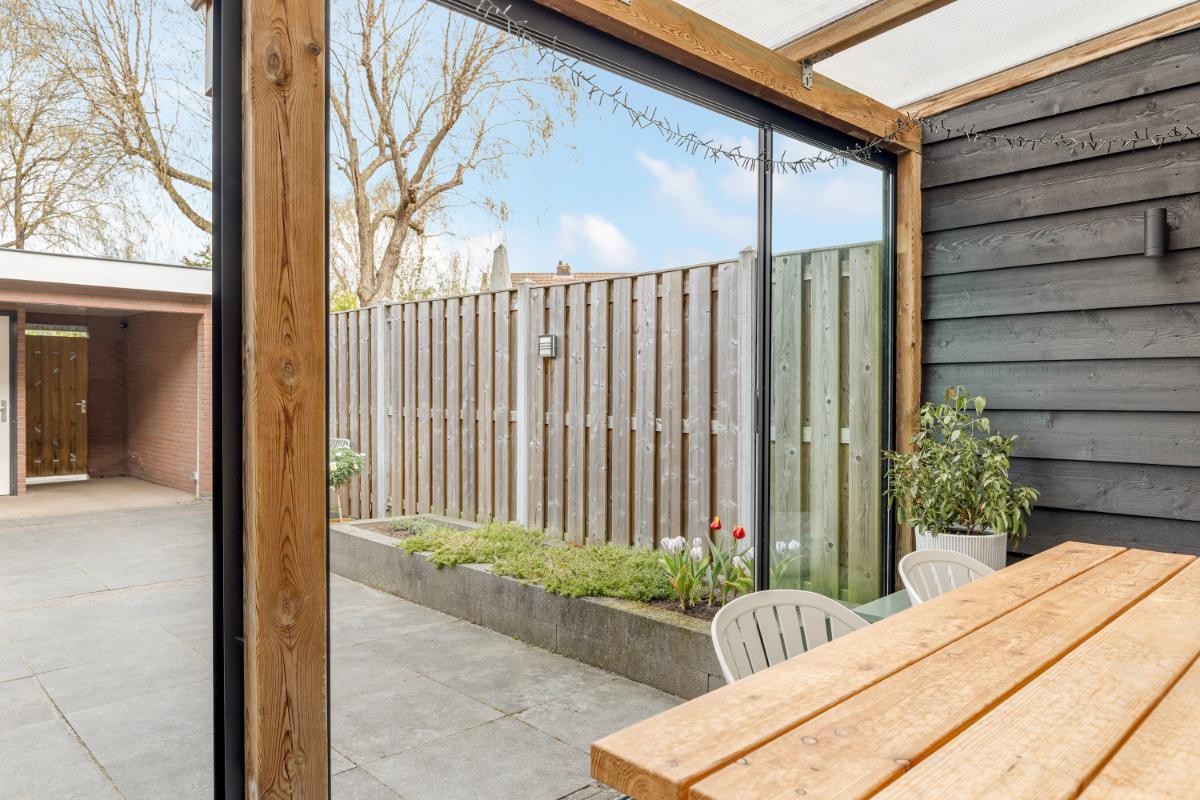 De achtertuin is onderhoudsvriendelijk aangelegd met sierbestrating en groene borders. Onder de luxe overkapping, voorzien van glaswanden, zit je hier al vroeg in het voorjaar heerlijk beschut. Daarnaast beschikt de tuin over een stenen berging en een praktische achterom.