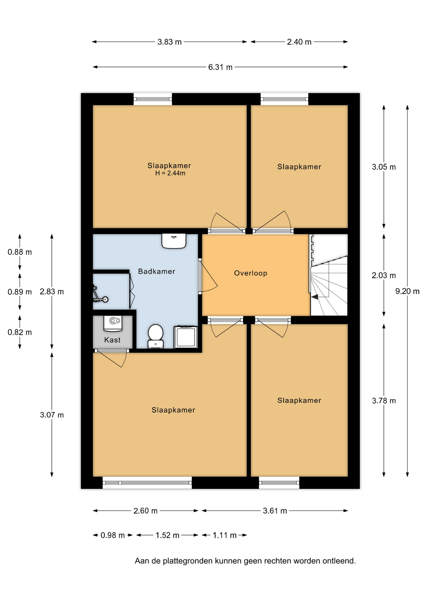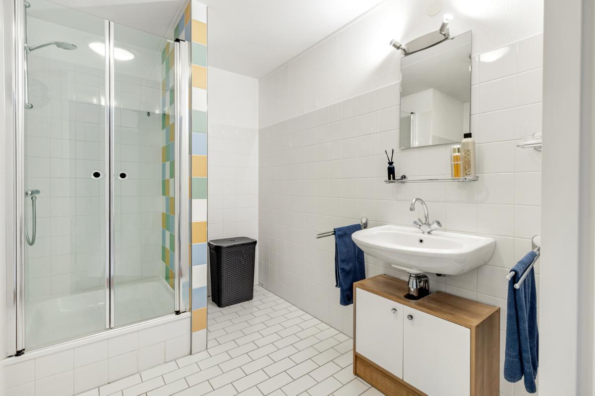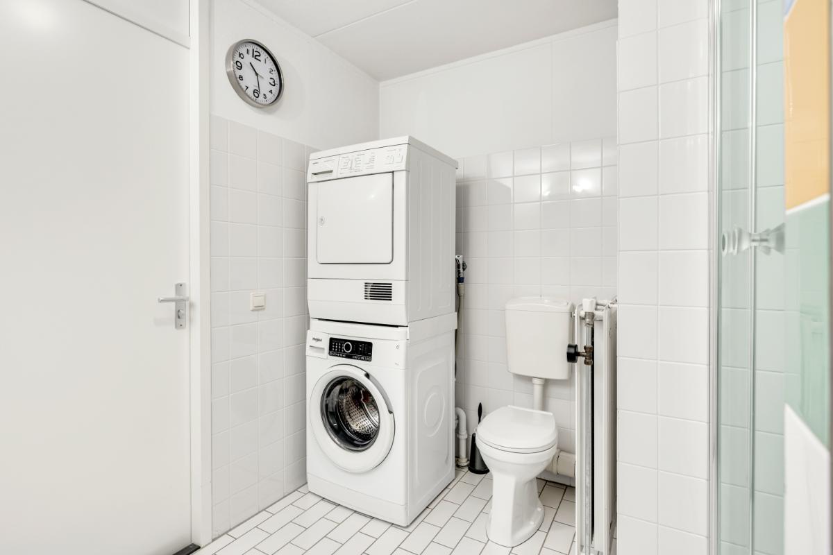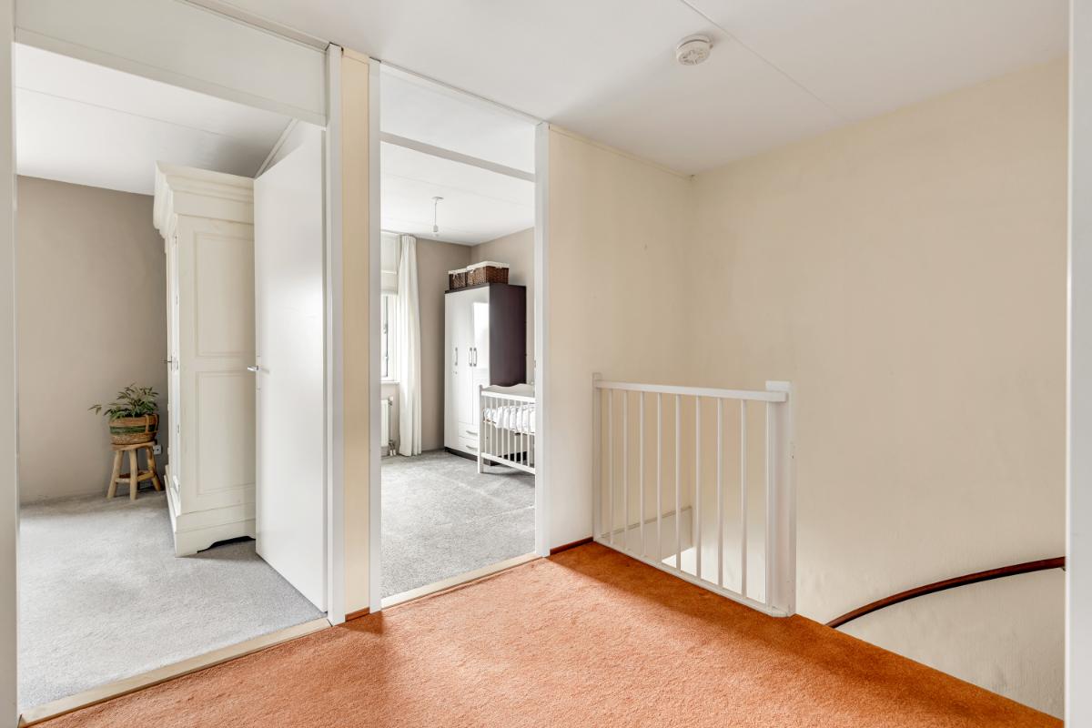 Eerste verdieping: de overloop biedt toegang tot de 4 slaapkamers en badkamer. In de ruime slaapkamer aan de voorzijde bevindt zich een vaste kast met daarin de cv-ketel. De badkamer is ruim opgezet en uitgerust met een douche, wastafel met meubel, toilet en de wasmachineaansluiting.