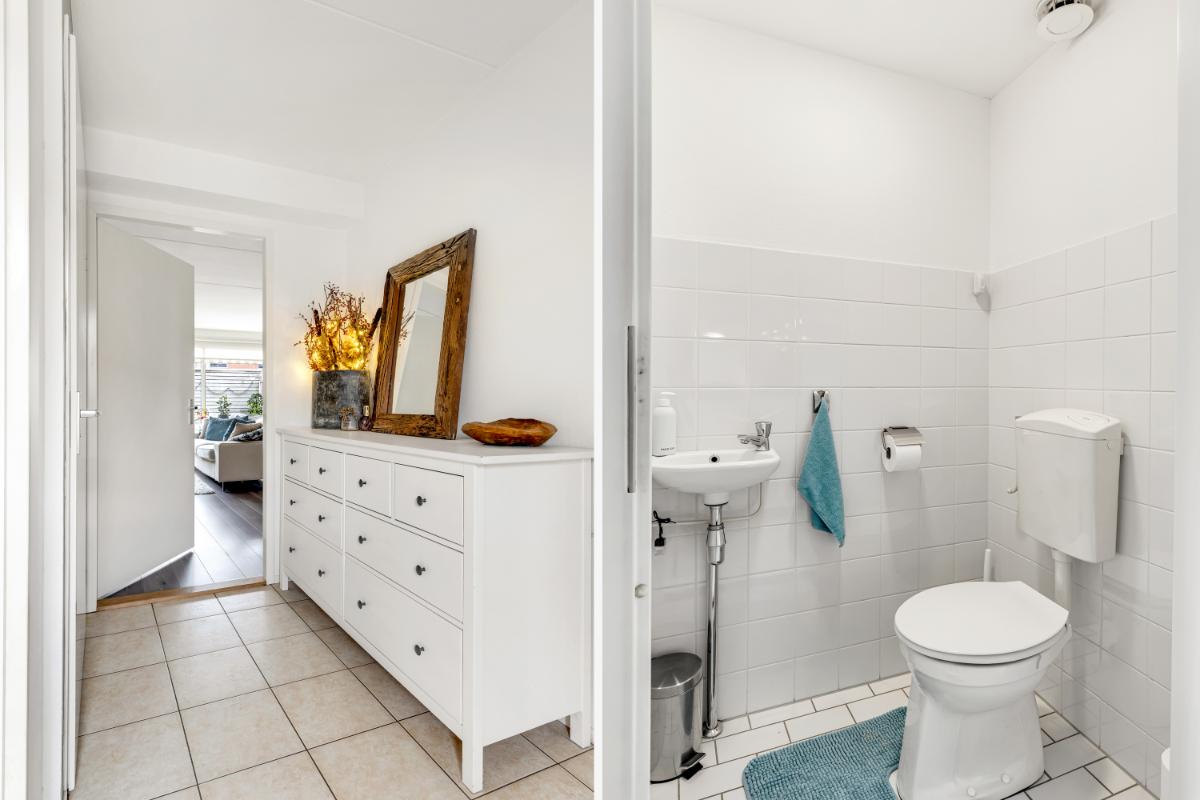 INDELING Begane grond: de ruime en lichte hal biedt toegang tot de meterkast, toiletruimte met fonteintje en de woonkamer. De royale, tuingerichte woonkamer is lekker licht door de grote raampartijen en biedt meer dan voldoende ruimte voor een lekkere bank en eettafel! Ook heb je vanuit de woonkamer toegang tot de trapkast. Via de tussenhal bereik je de trapopgang en de zonnige achtertuin.