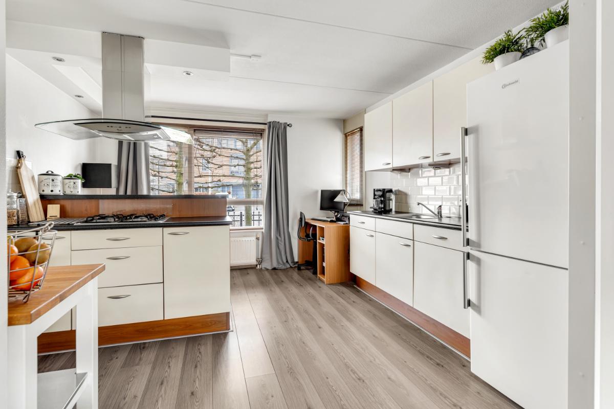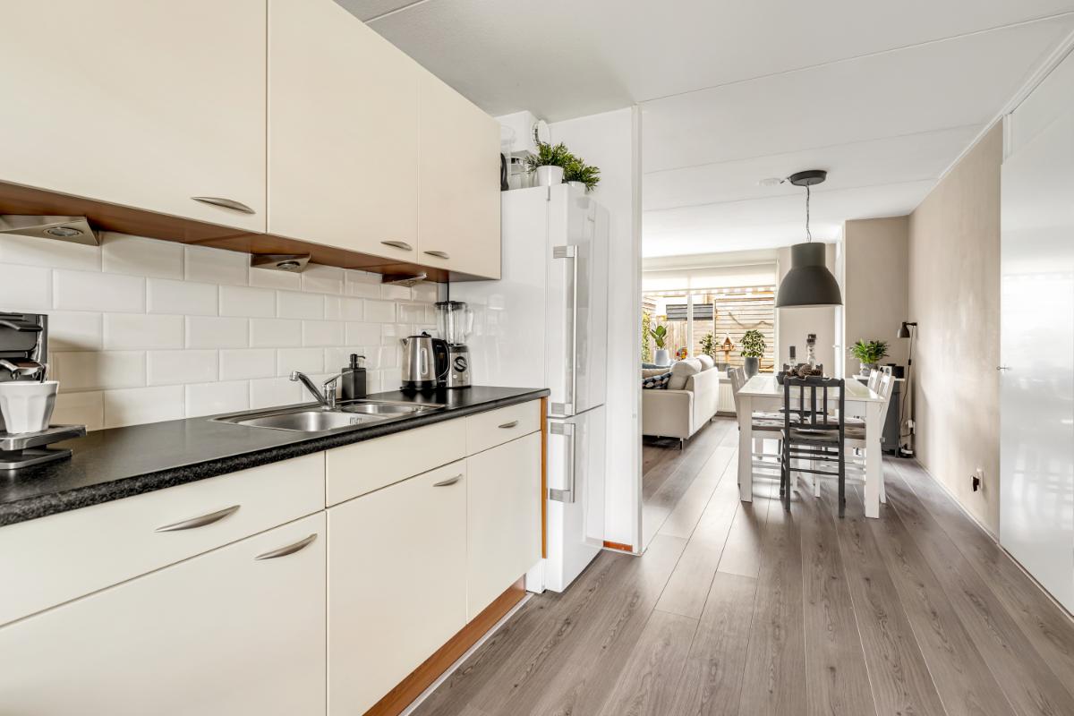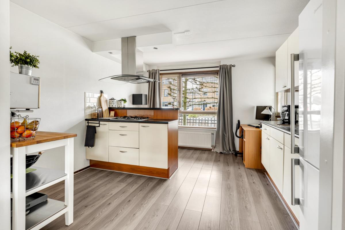 Aan de voorzijde vind je de keuken en deze heeft een functionele opstelling met veel werk- en kastruimte. Daarnaast beschikt de keuken over diverse apparatuur waaronder een gasfornuis, afzuigkap en vaatwasser.
