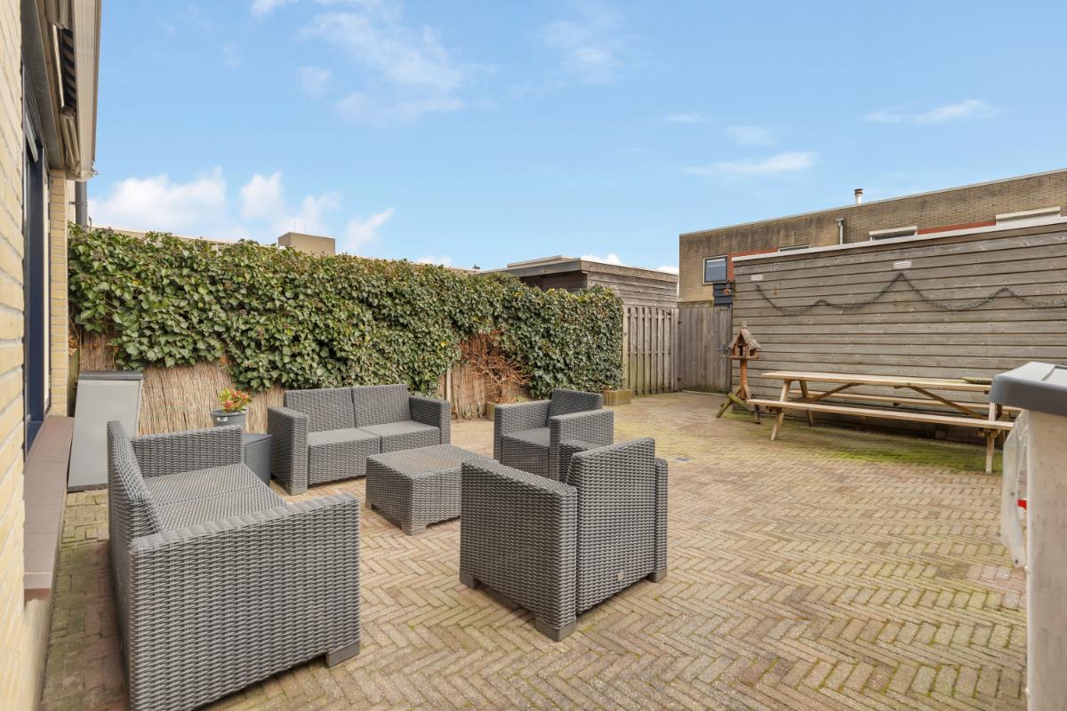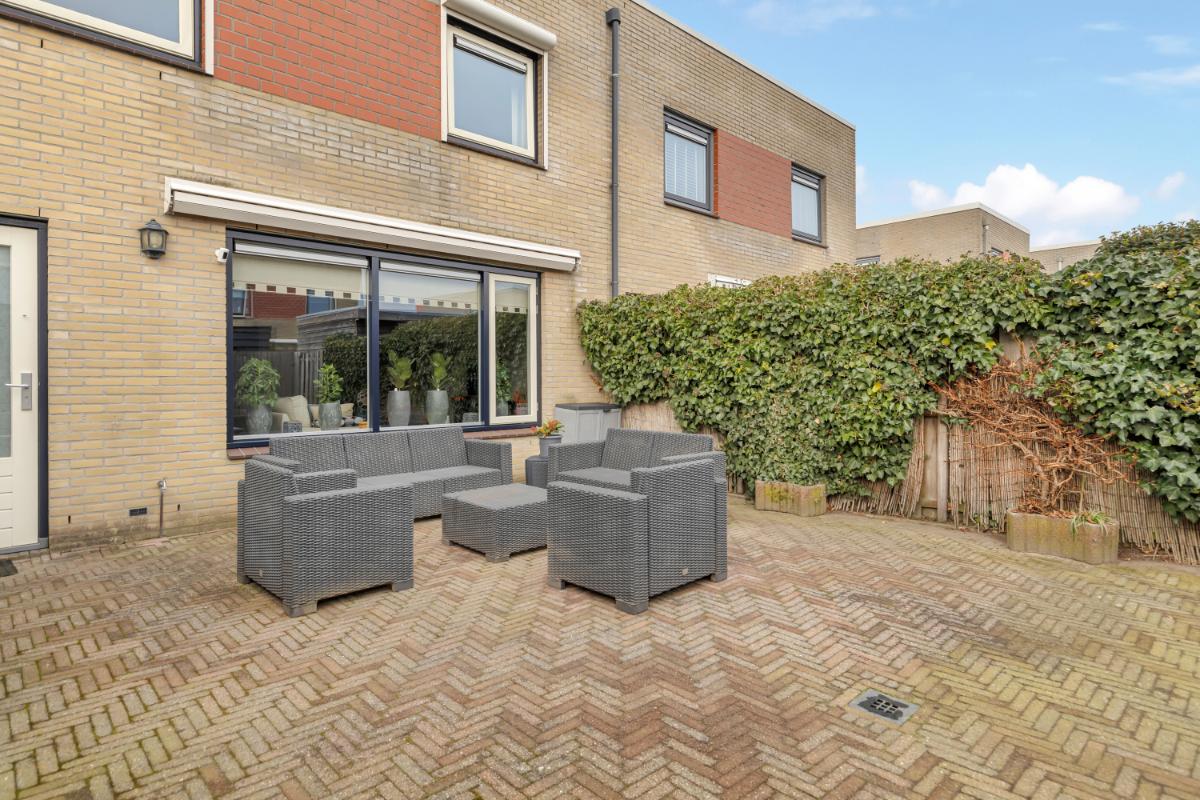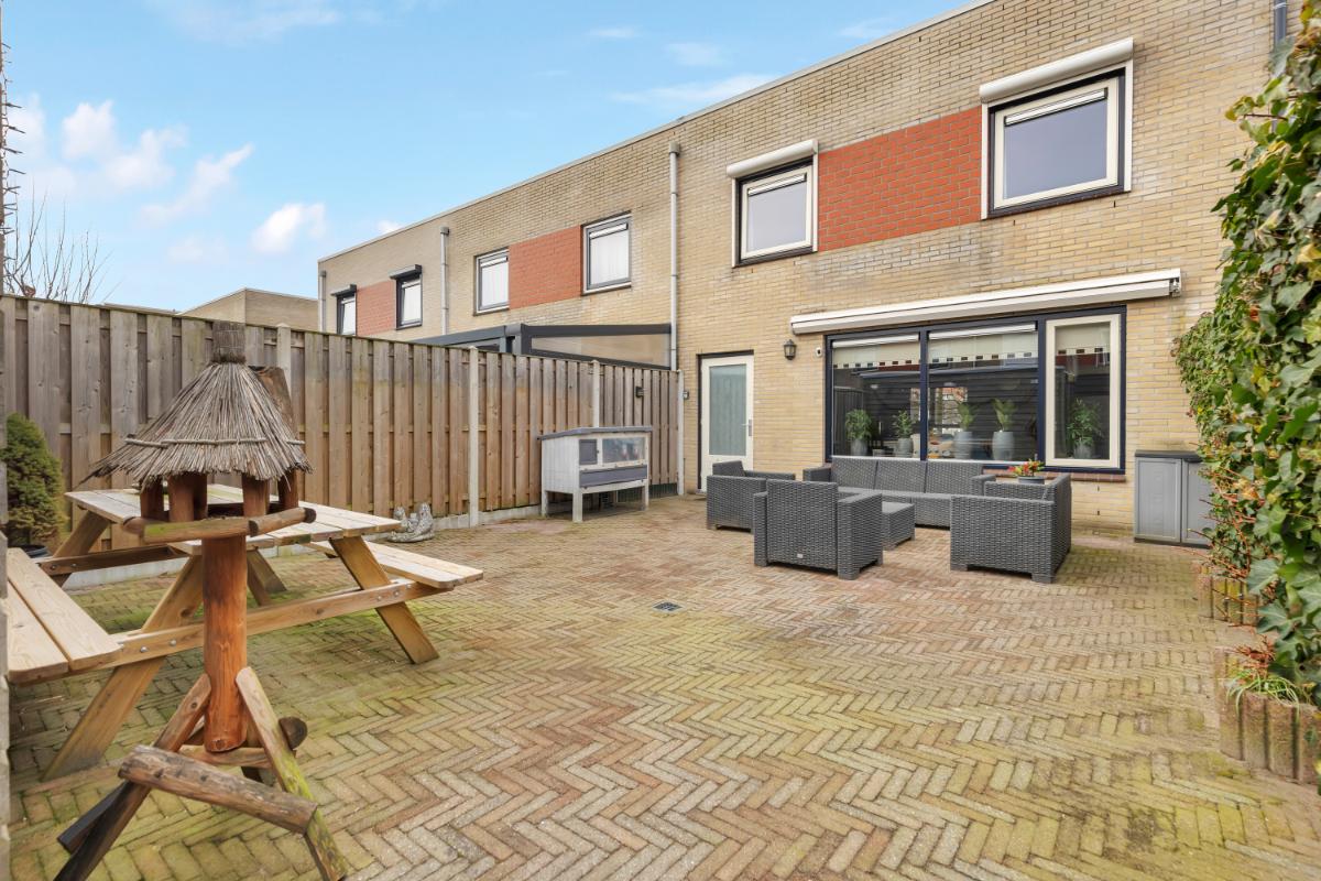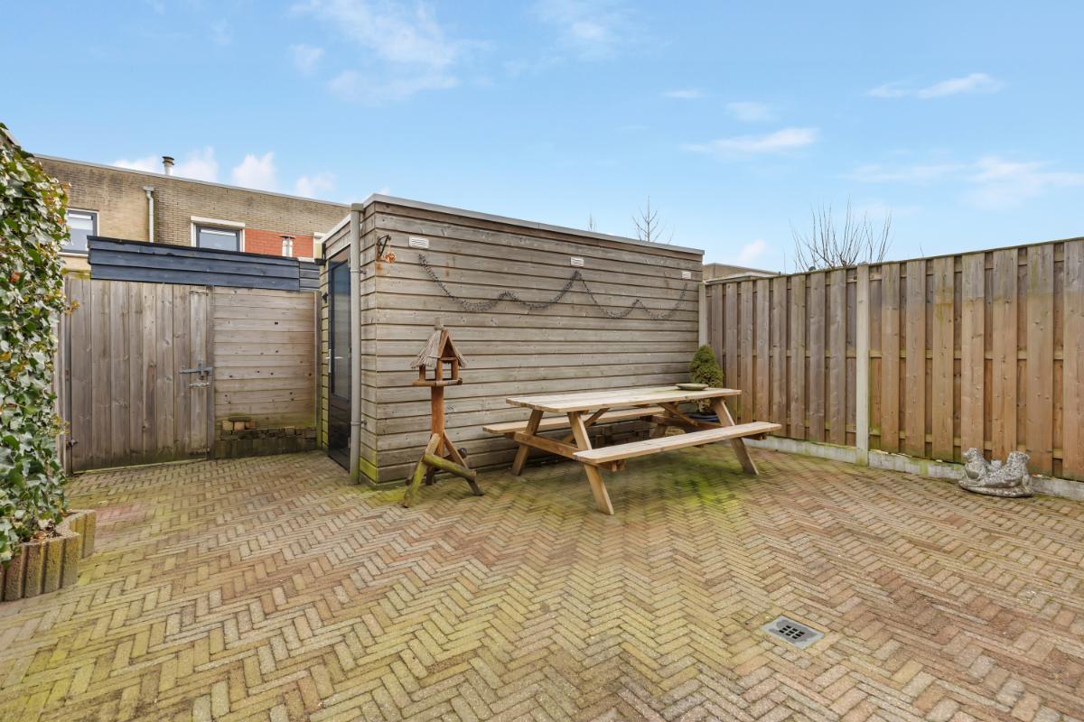 Buitenruimte: de voortuin is gelegen op het westen, waardoor je hier van de avondzon kan genieten. De achtertuin is gelegen op het oosten, perfect om ’s ochtends van een kop koffie in de zon te genieten! De tuin onderhoudsvriendelijk aangelegd met bestrating en achterin de tuin staat een vrijstaande houten berging, deze is voorzien van elektra.