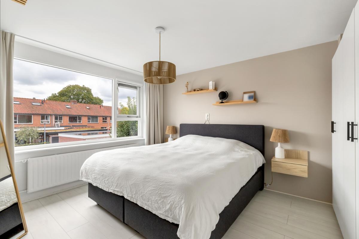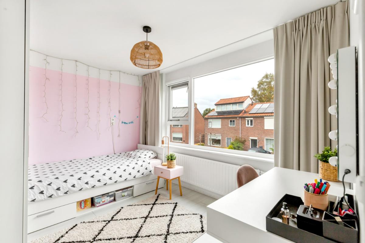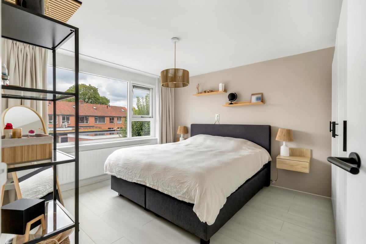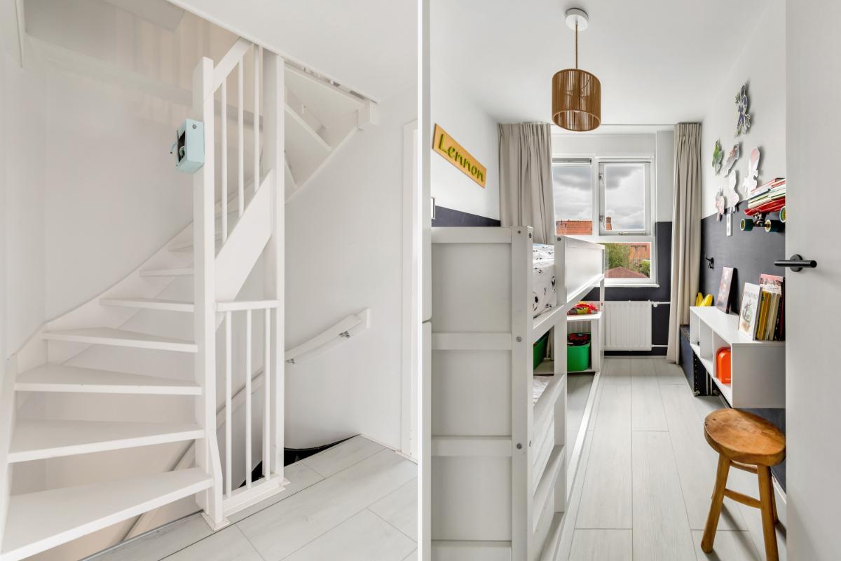Eerste verdieping: de eerste verdieping biedt drie goed bemeten slaapkamers en een moderne badkamer. De slaapkamers zijn keurig afgewerkt met een laminaatvloer en glad gestuukte wanden. De badkamer (2022) is modern en stijlvol, met lichte wandtegels en granito-look vloertegels. Er is een inloopdouche, een wastafelmeubel en een tweede toilet.