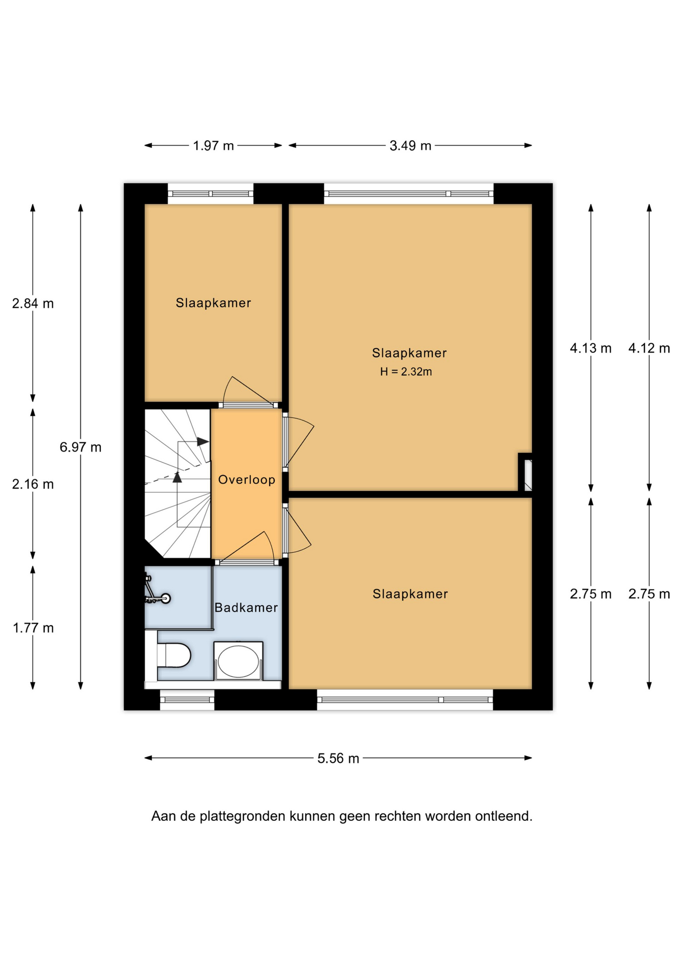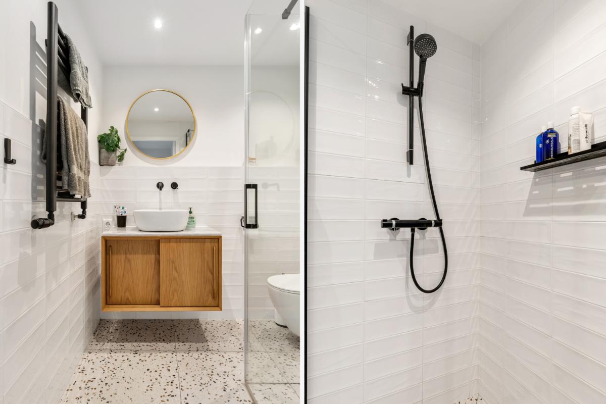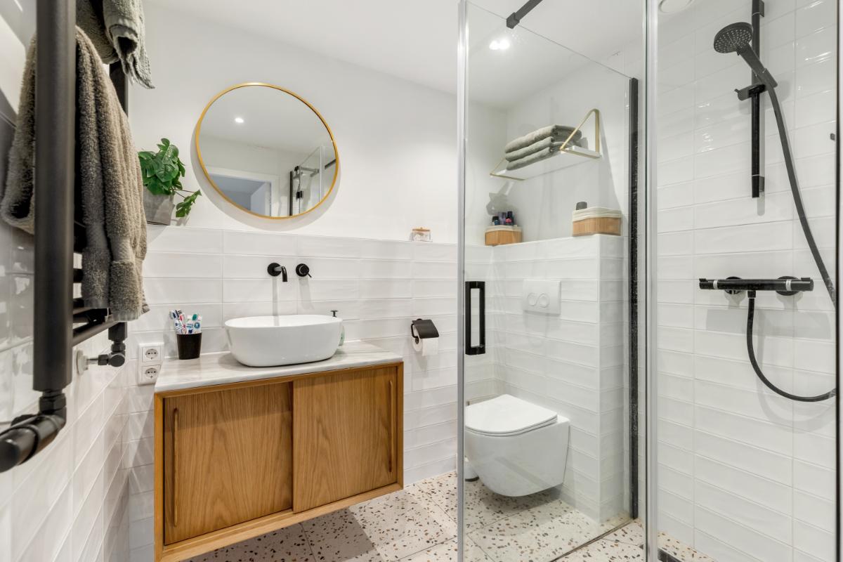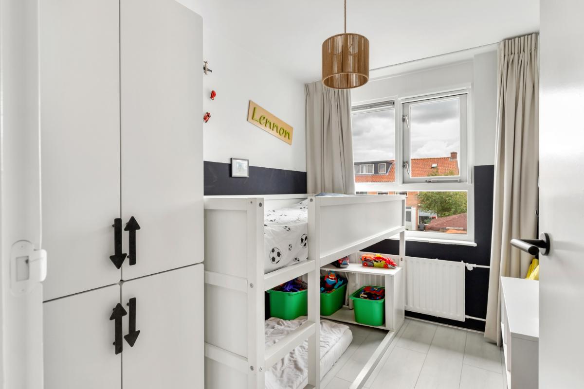 Eerste verdieping: de eerste verdieping biedt drie goed bemeten slaapkamers en een moderne badkamer. De slaapkamers zijn keurig afgewerkt met een laminaatvloer en glad gestuukte wanden. De badkamer (2022) is modern en stijlvol, met lichte wandtegels en granito-look vloertegels. Er is een inloopdouche, een wastafelmeubel en een tweede toilet.