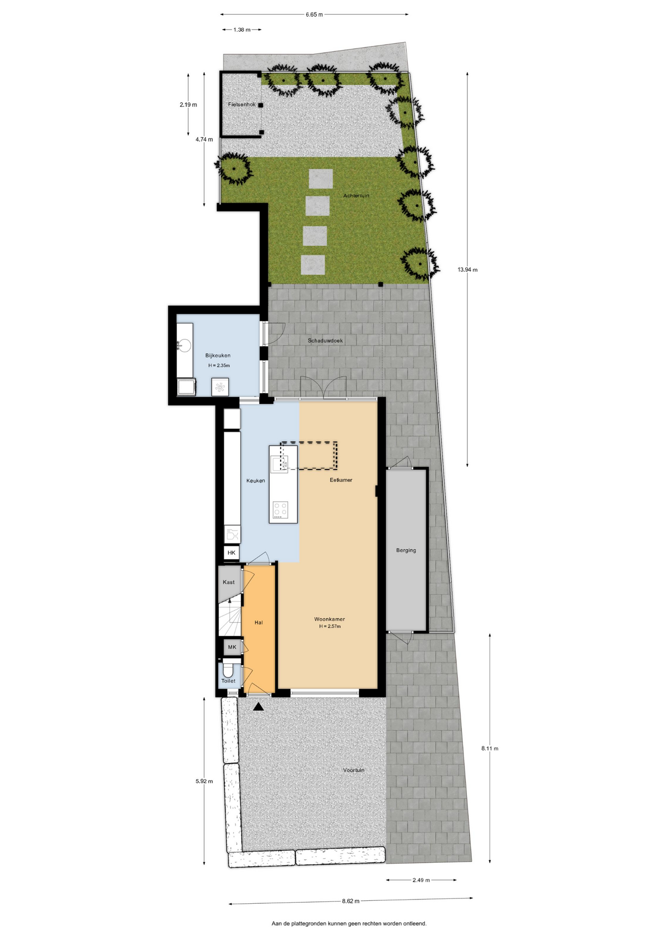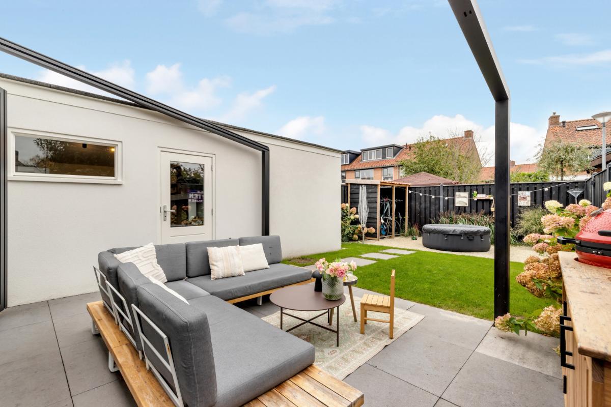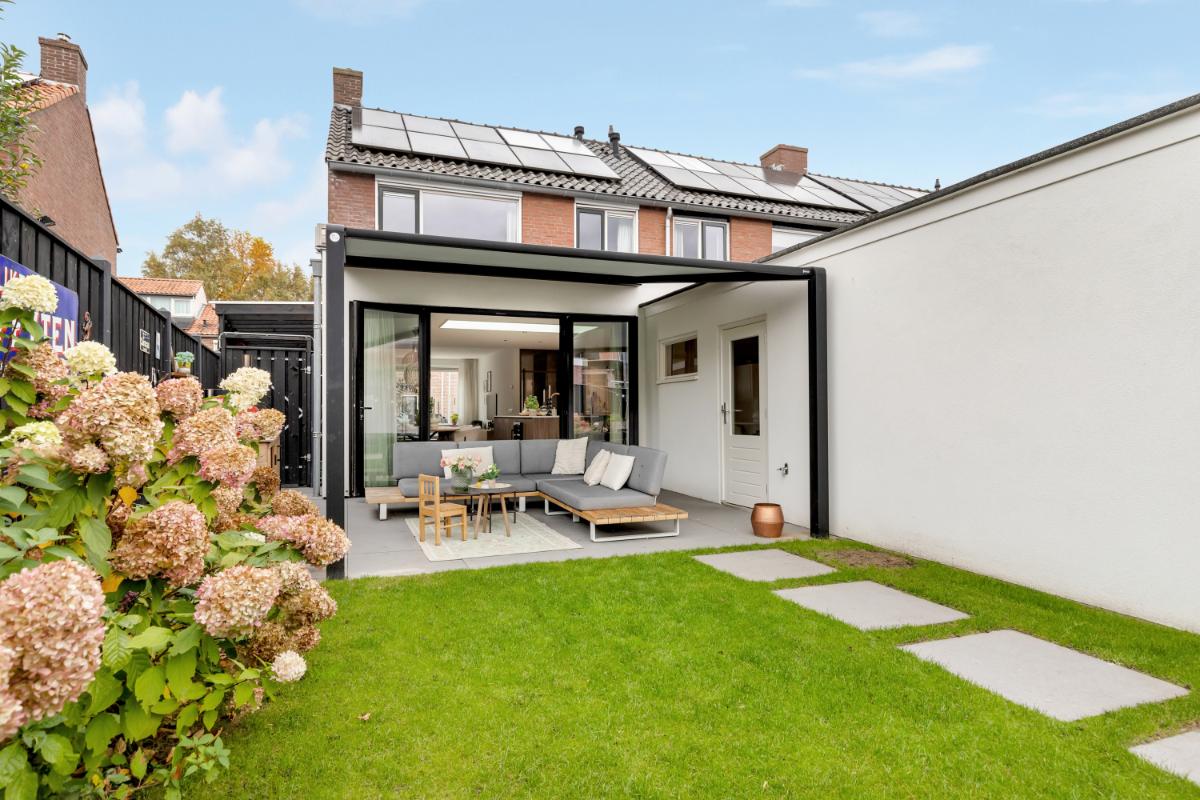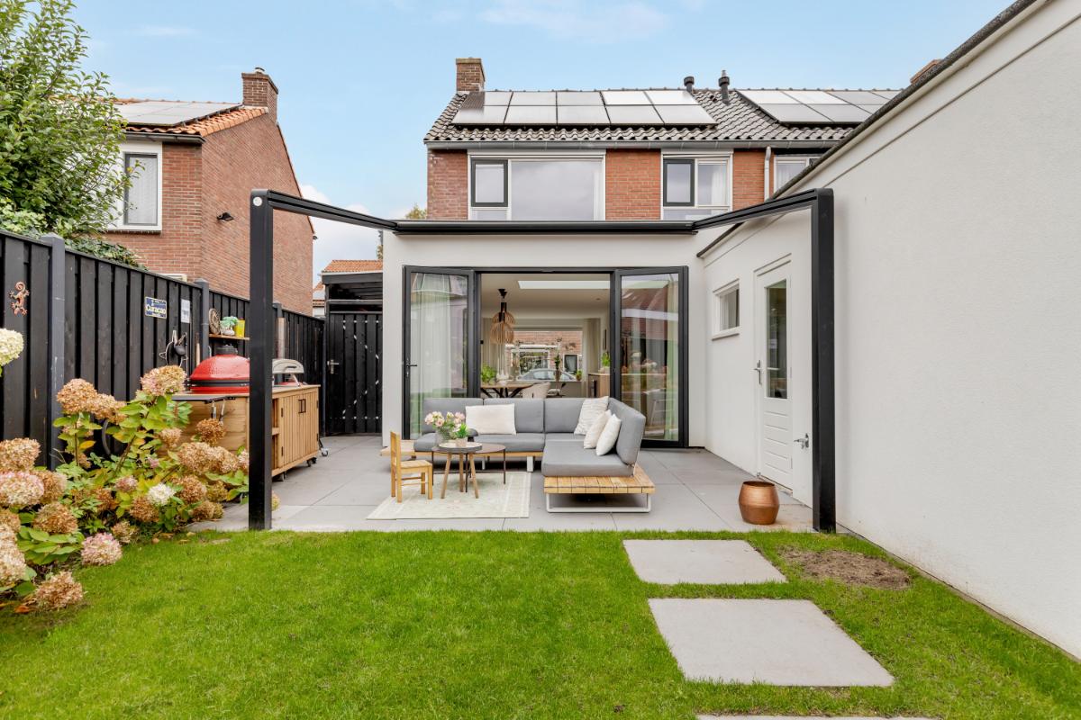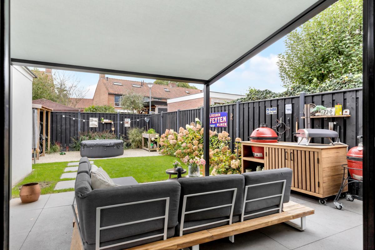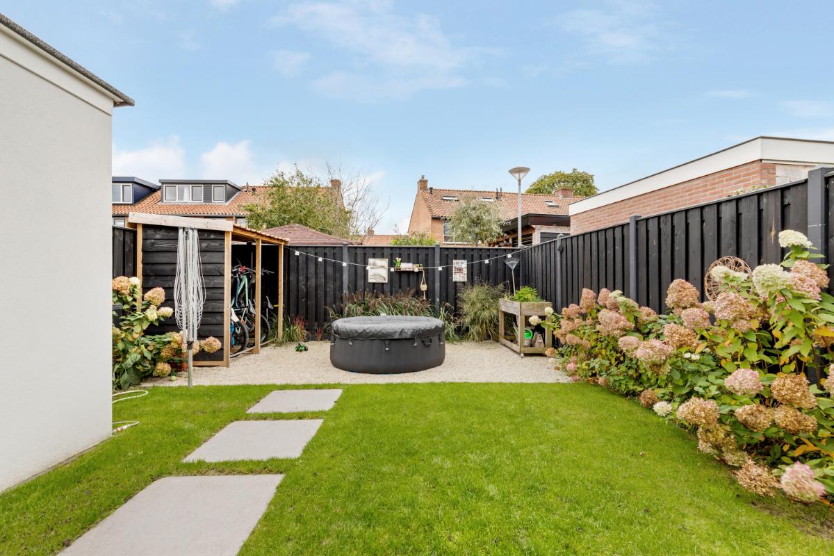 De zonnige tuin ligt op het zuiden en is verzorgd en functioneel aangelegd. Je vindt er een fijn terras met uitschuifbaar zonnedoek, een net gazon voor een groene uitstraling en diverse borders langs de randen. Een fijne combinatie van groen en modern comfort. Grenzend aan de woning treft je nog een fietsenberging. De aanwezige oprit maakt parkeren op eigen terrein mogelijk.