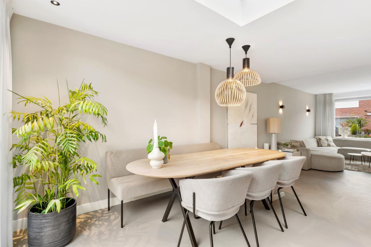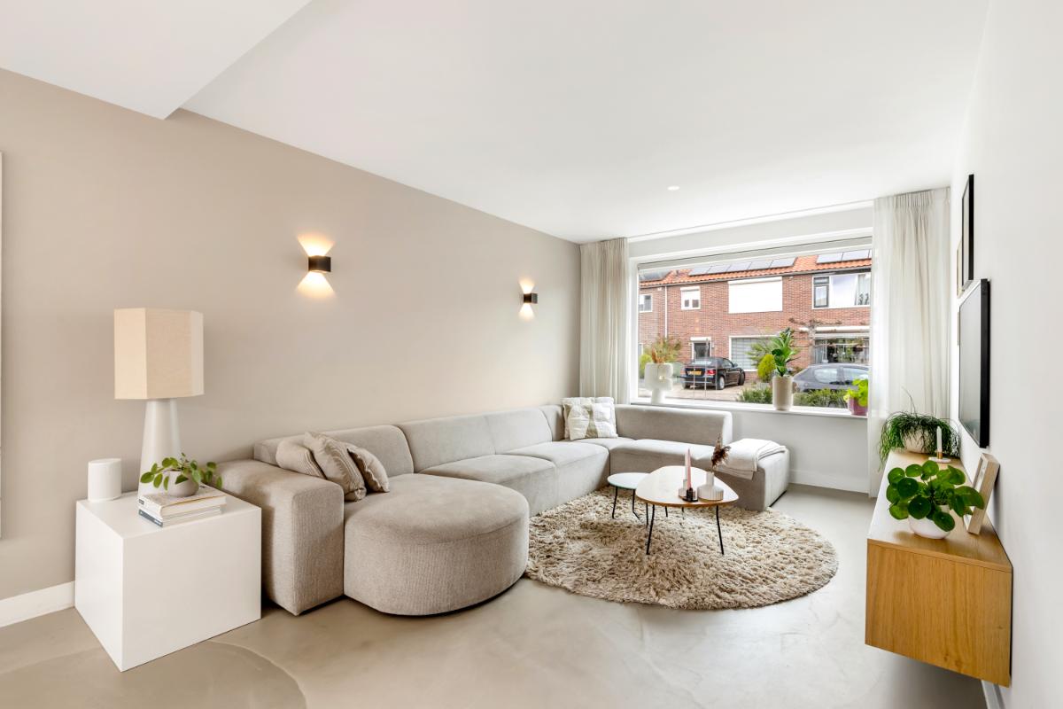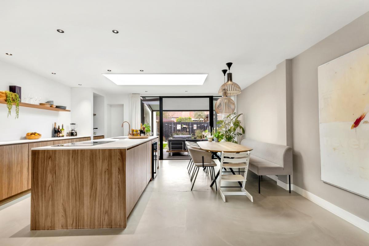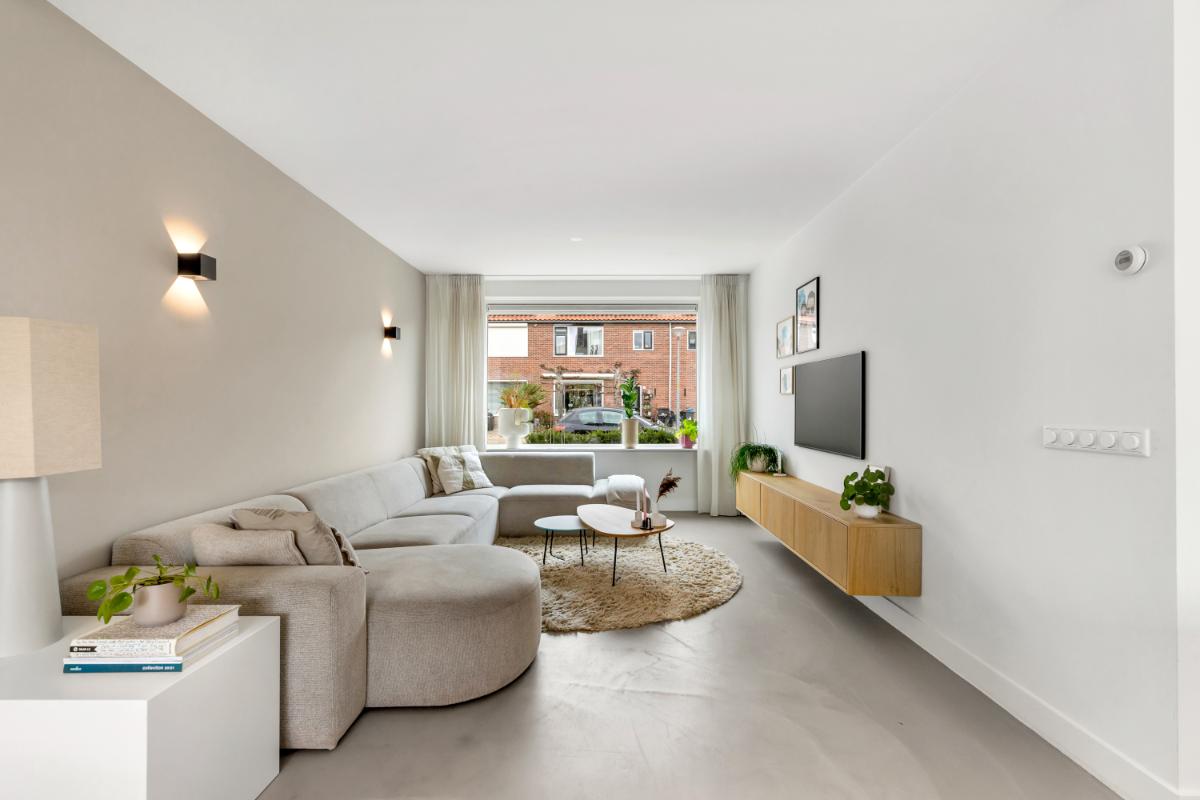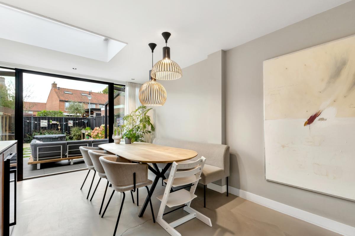 De woonkamer is strak afgewerkt met een gietvloer, strakke wandafwerking, vloerverwarming en subtiele wandspots die zorgen voor een warme, sfeervolle verlichting. Door de uitbouw (2022) is er een royale leefruimte ontstaan met veel lichtinval.