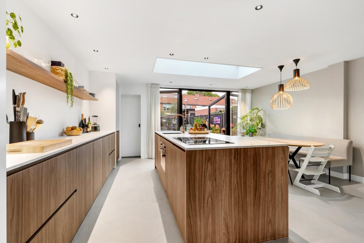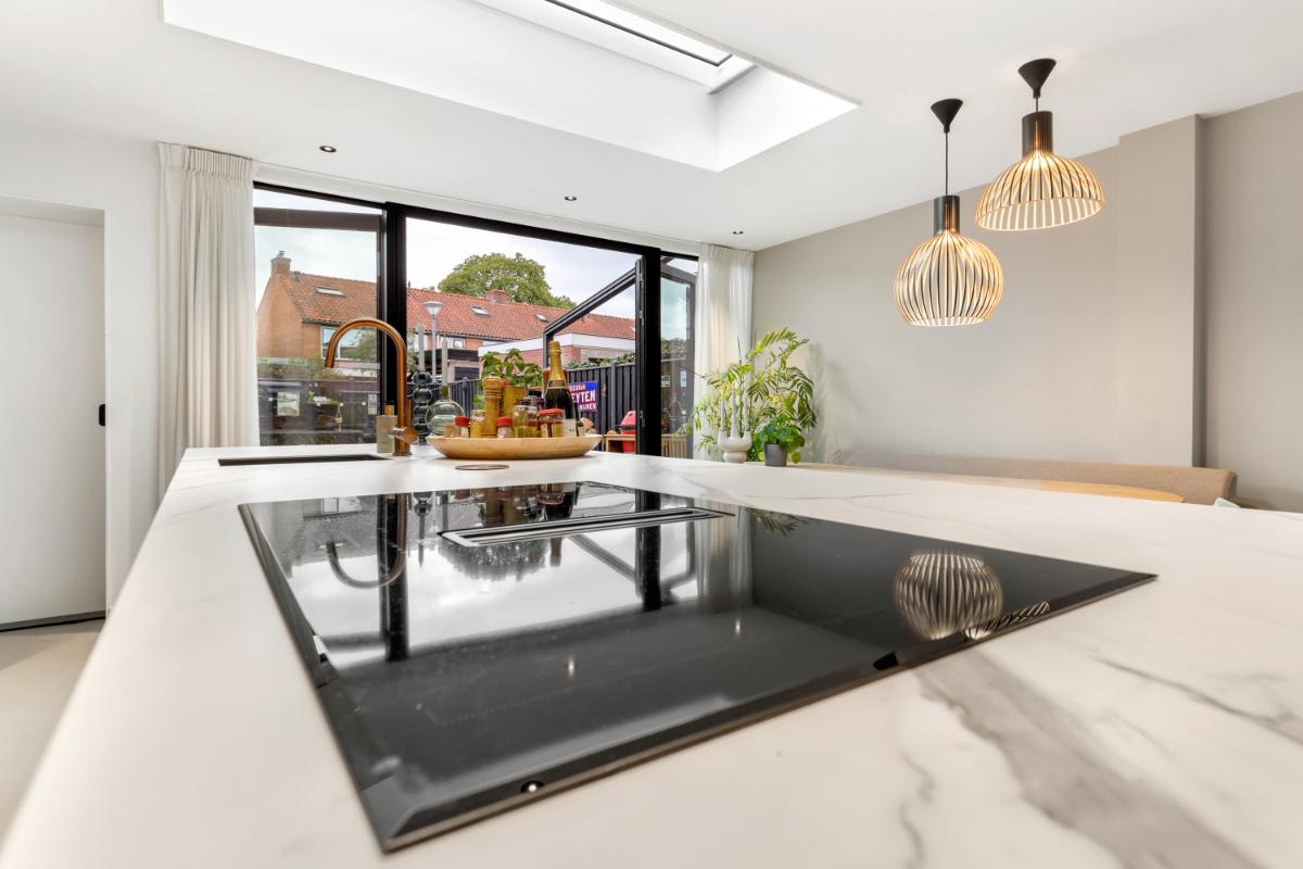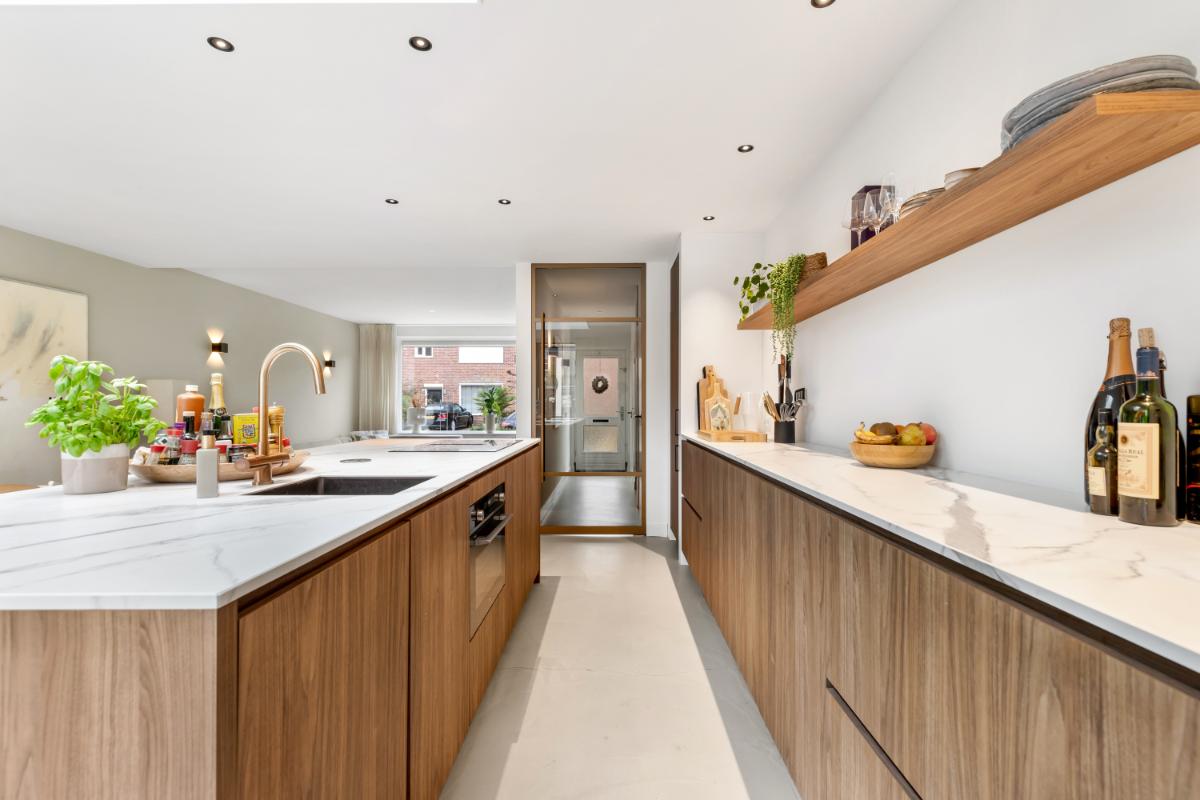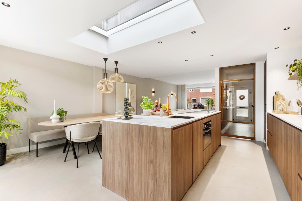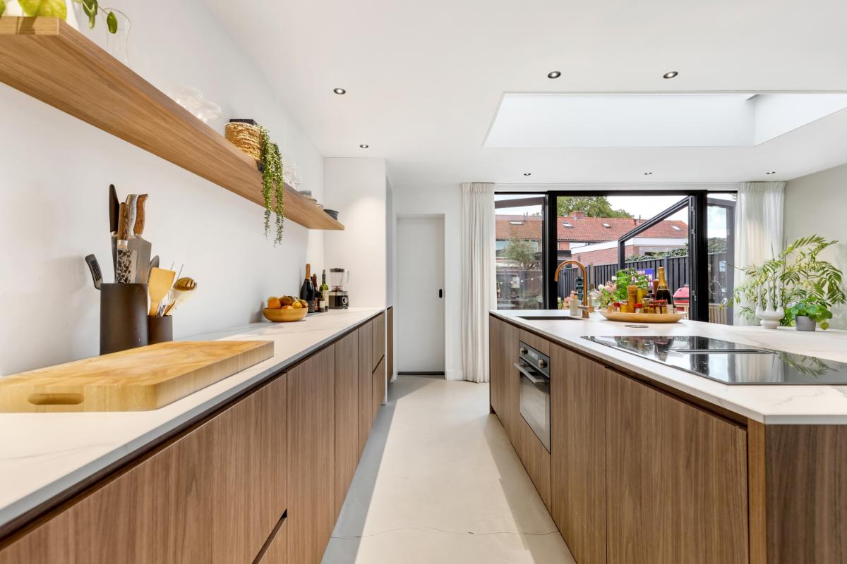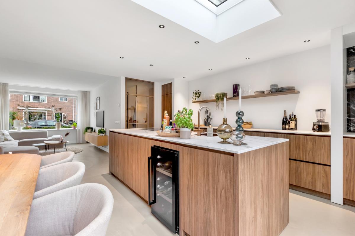 De absolute eyecatcher is de woonkeuken: een stijlvolle ruimte met kookeiland, houtkleurige fronten en een marmerlook werkblad. Hier kook en leef je in één ruimte, met volop plek voor een grote eettafel. De keuken is uitgerust met moderne inbouwapparatuur, waaronder een inductiekookplaat met afzuigsysteem, koelkast, vriezer, combi-oven, wijnklimaatkast en kokendwaterkraan. Dankzij de lichtkoepel en openslaande deuren komt er veel lichtval binnen en is dit een heerlijke plek waar binnen en buiten naadloos in elkaar overgaan. Aansluitend bevindt zich een praktische bijkeuken met extra opbergruimte en de witgoed aansluiting.