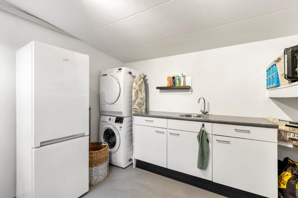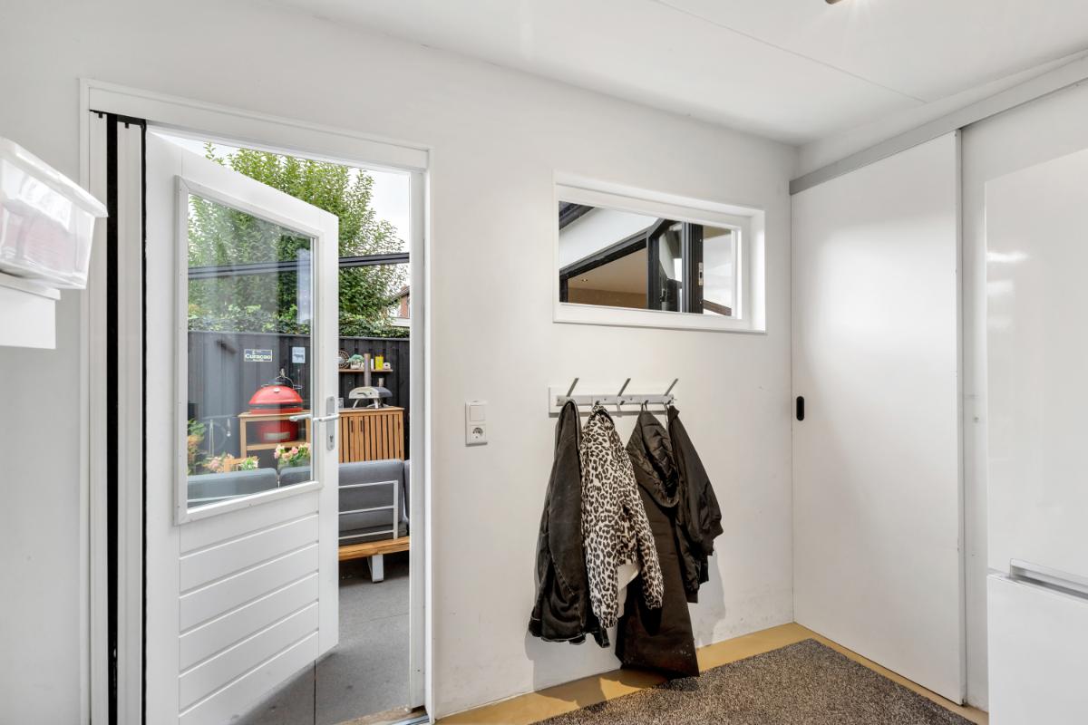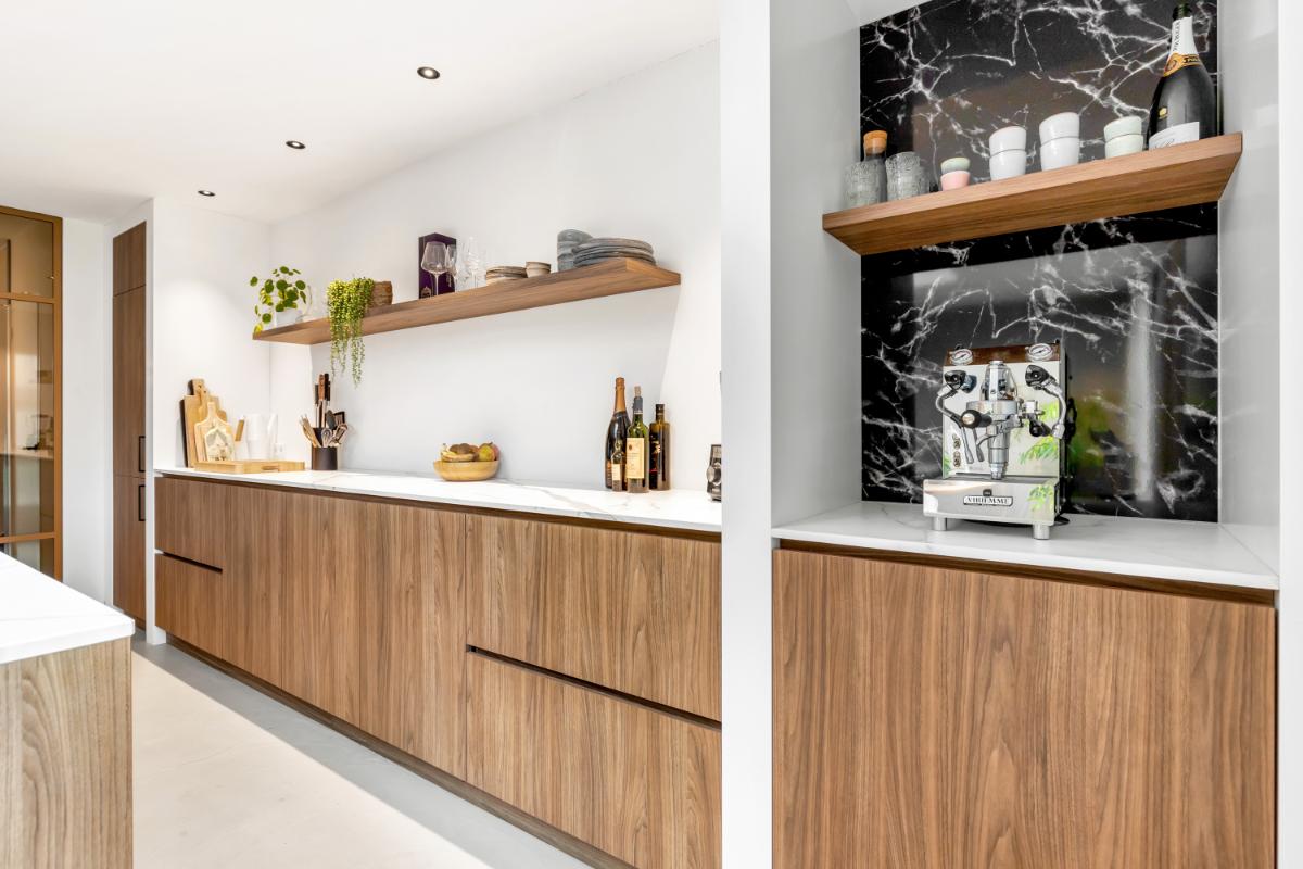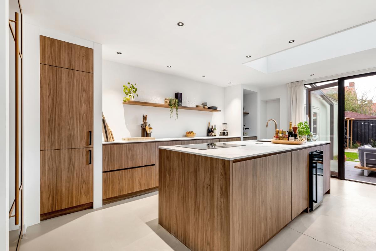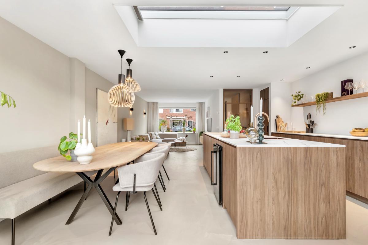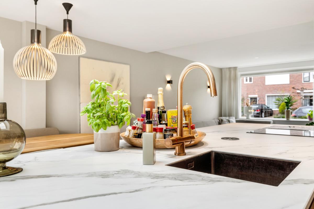 De absolute eyecatcher is de woonkeuken: een stijlvolle ruimte met kookeiland, houtkleurige fronten en een marmerlook werkblad. Hier kook en leef je in één ruimte, met volop plek voor een grote eettafel. De keuken is uitgerust met moderne inbouwapparatuur, waaronder een inductiekookplaat met afzuigsysteem, koelkast, vriezer, combi-oven, wijnklimaatkast en kokendwaterkraan. Dankzij de lichtkoepel en openslaande deuren komt er veel lichtval binnen en is dit een heerlijke plek waar binnen en buiten naadloos in elkaar overgaan. Aansluitend bevindt zich een praktische bijkeuken met extra opbergruimte en de witgoed aansluiting.