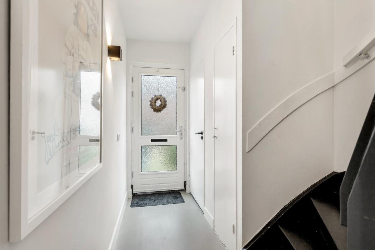 INDELING Begane grond: via de voordeur kom je in een lichte hal met meterkast, trapkast, modern toilet en trapopgang. De stijlvolle glazen deur met gouden frame en rookglas vormt een chique overgang naar de woonkamer.