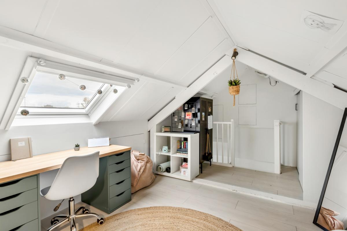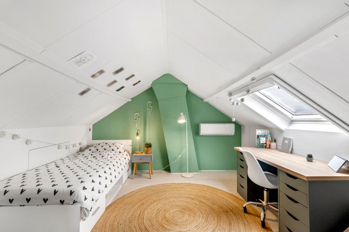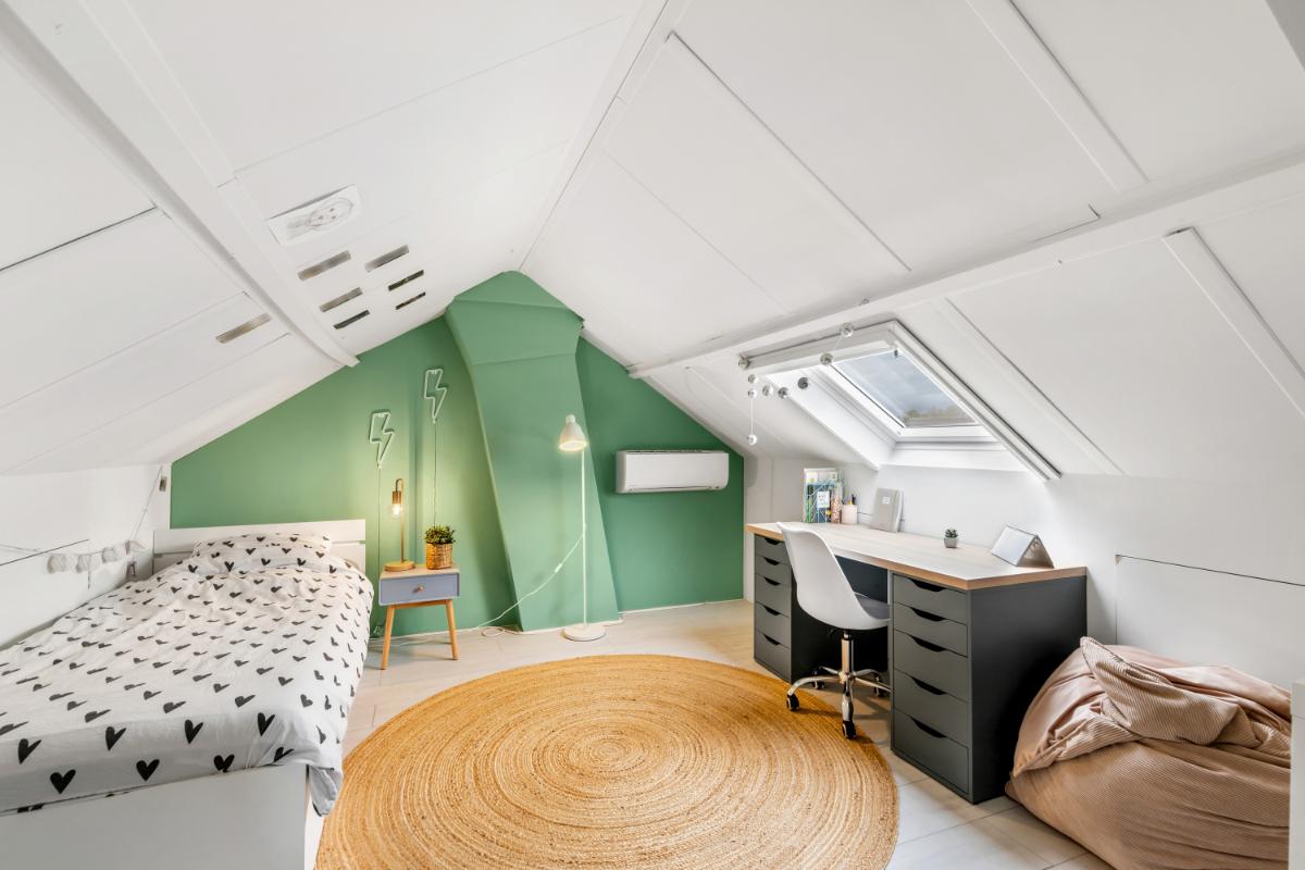 Tweede verdieping: de zolderverdieping is bereikbaar via een vaste trap en biedt een ruime extra kamer met dakraam en airconditioning, perfect als vierde slaapkamer, werkkamer of hobbyruimte. Hier zijn ook de cv-ketel, zonneboiler en omvormer van de zonnepanelen netjes weggewerkt. Het dak van de woning is na-geïsoleerd.